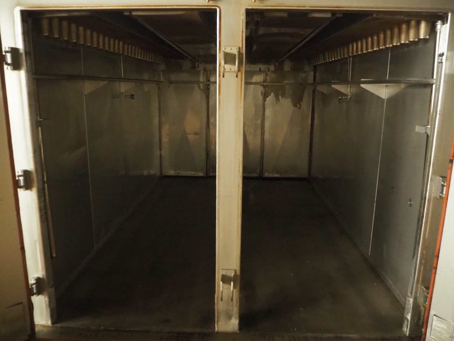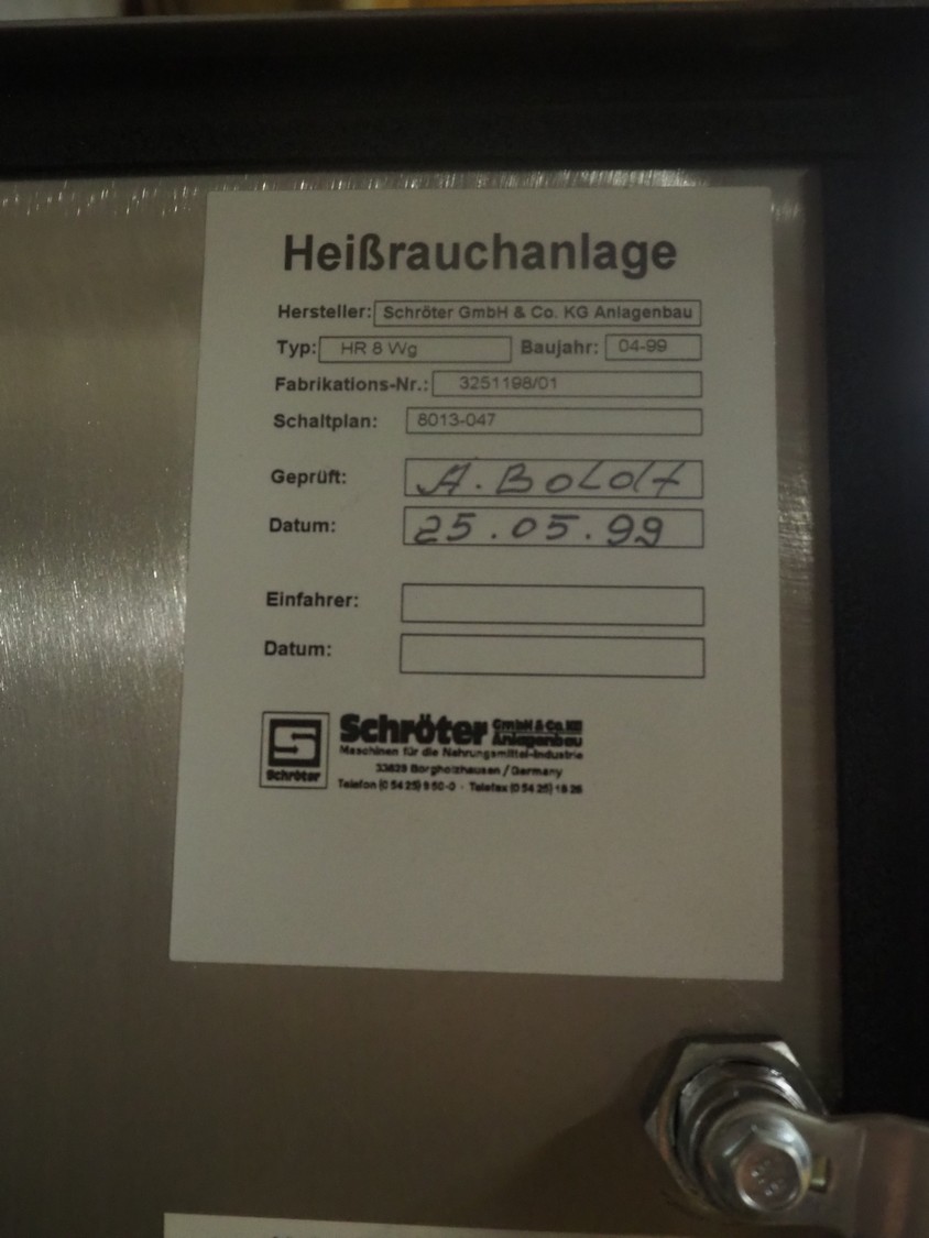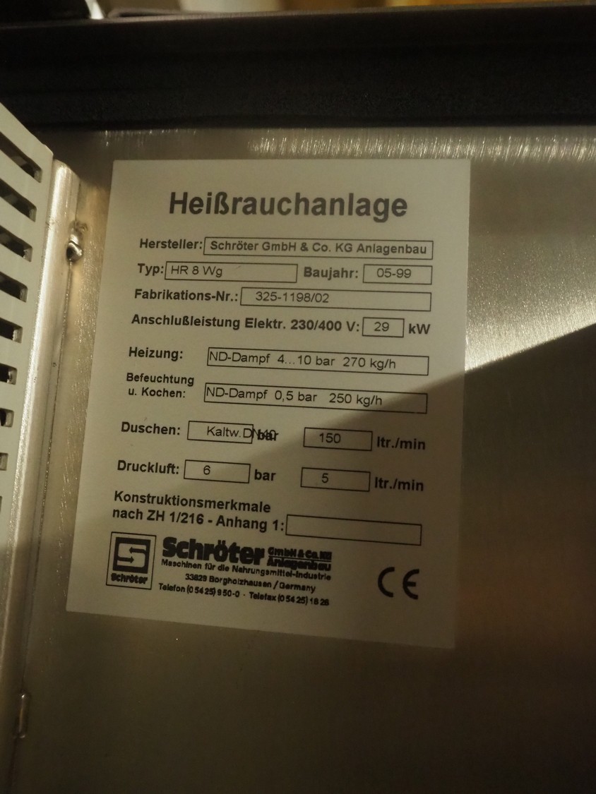 Schröter GmbH & Co. KG Anlagenbau smoking and cooling chamber for 8 trolleys, suitable for hot smoking (liquid smoke) and showering, type: HR-8Wg, manufacturing number: 325-1198/02, year of construction: 05-99, 230/400 V, 29 kW, heating: HD-Dampf, 4-10 bar, 270 kg/H, humidification and cooking: ND-Dampf, 0.5 bar, 250 kg/h, inside dimensions: 2700 mm x 4400 mm x 2050 mm, door dimensions: (2x) 1200 mm x 2050 mm, total dimensions: 2900 mm x 5600 mm x 3300 mm, dimensions switch cabinet: 750 mm x 400 mm x 1000 mm. Liquid smoke generator is not included.