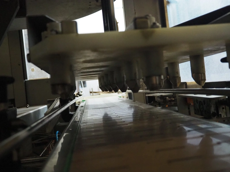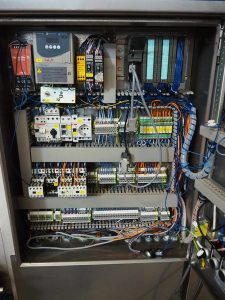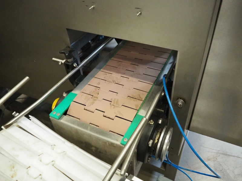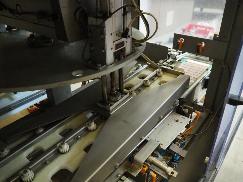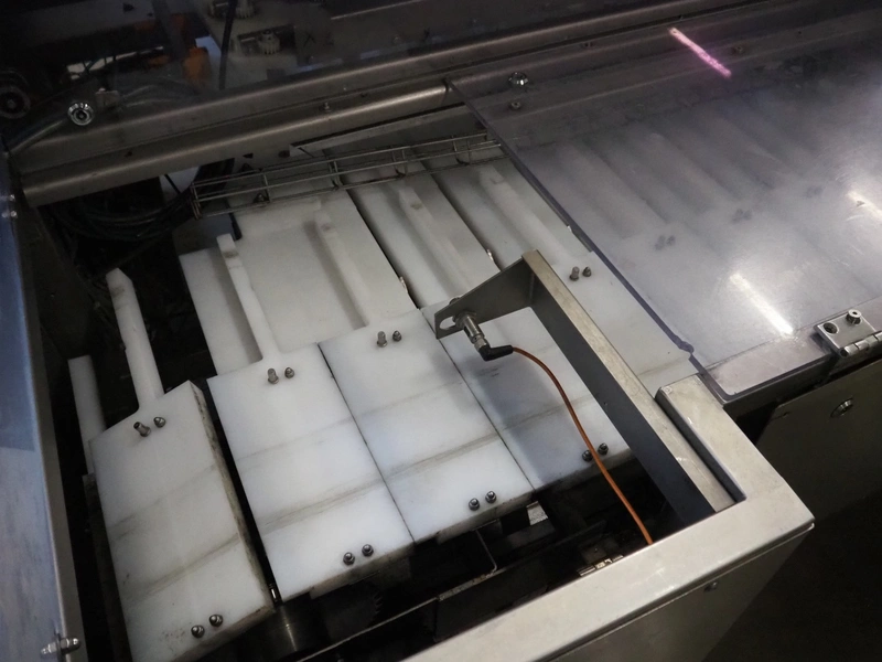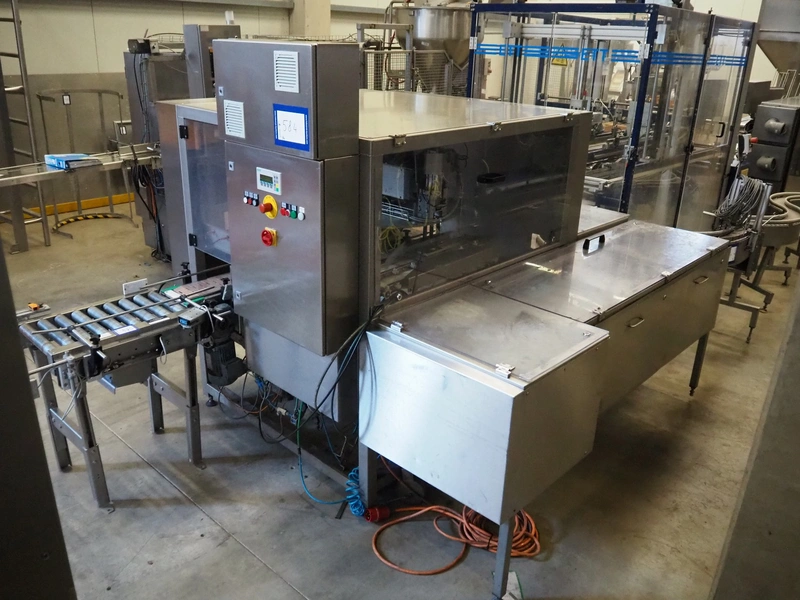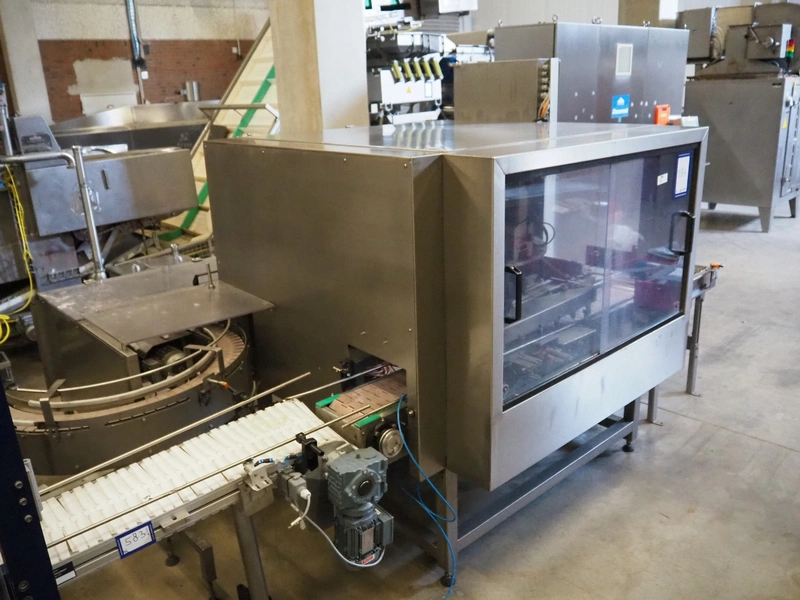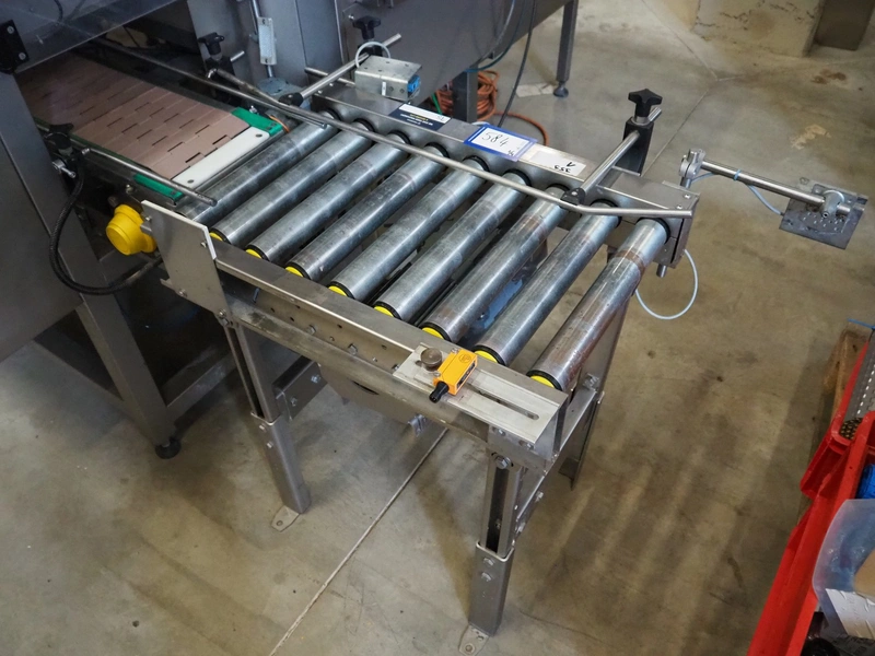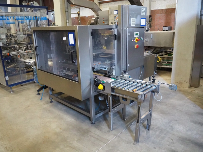 Buddenkotte Apparatebau GmbH & Co.KG box packaging machine, type: Packer, number: 1835, year of construction: 2005, 400 V, 3 Ph, 50 Hz, 16 A, 1.5 kW, plastic belt, belt width: 190 mm, s/s rollers, roller width: 350 mm, plastic chain conveyor with dividers, belt width: 230 mm, distance between dividers: 115 mm, divider height: 30 mm, plastic outfeed belt, belt width: 100 mm, total dimensions: 5000 mm x 2300 mm x 2000 mm.