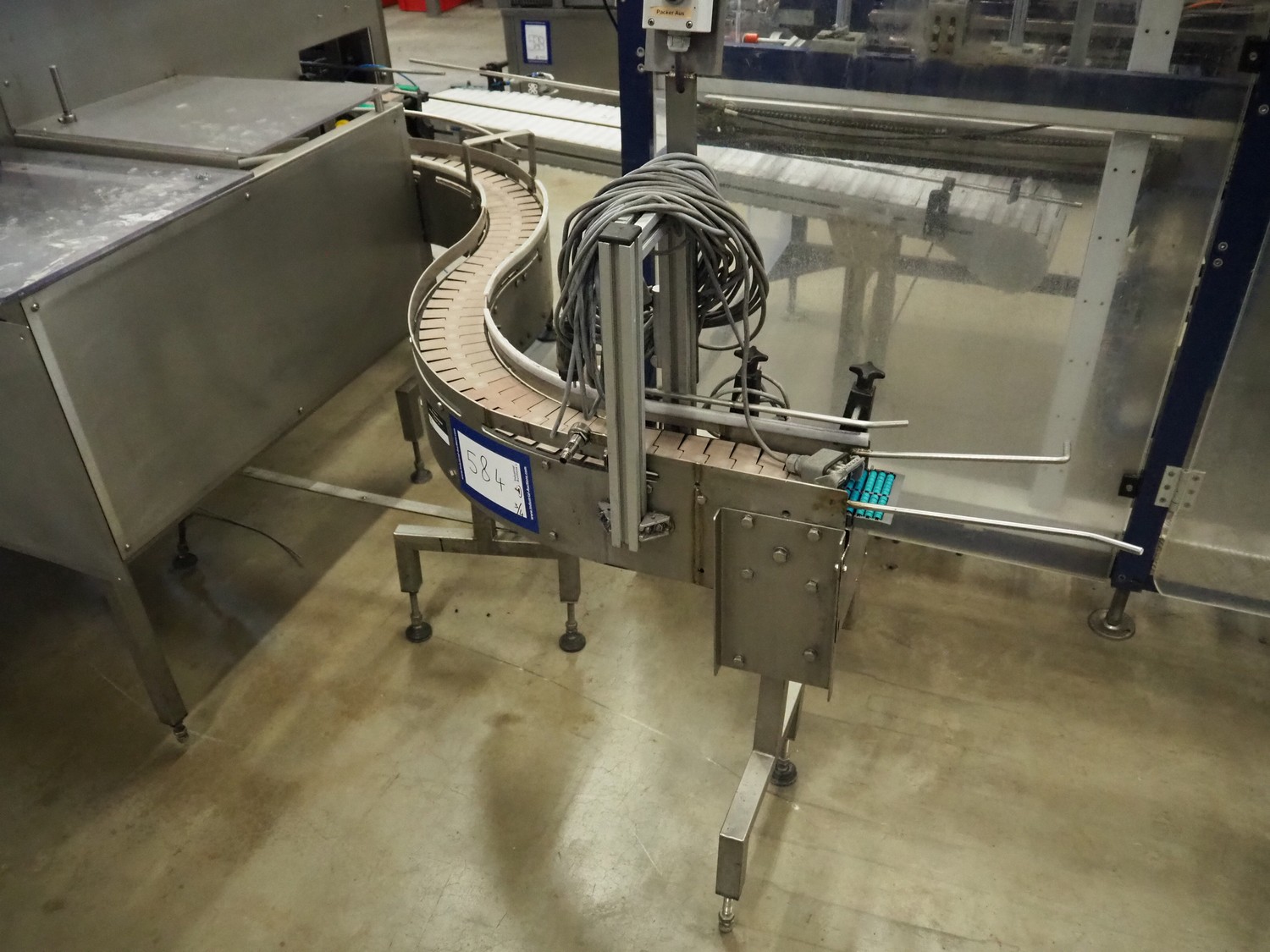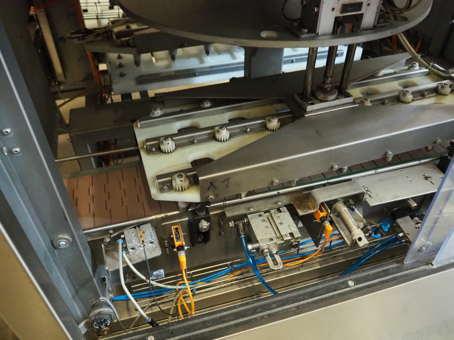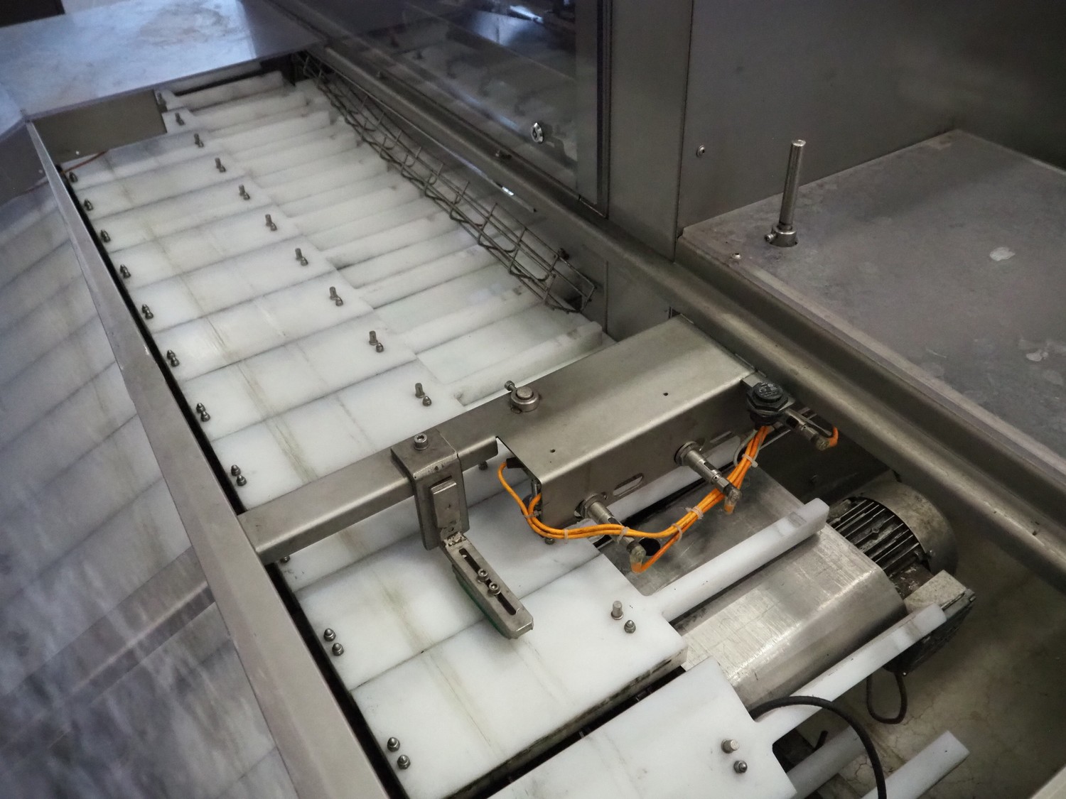 Buddenkotte Apparatebau GmbH & Co.KG box packaging machine, type: Packer, number: 1835, year of construction: 2005, 400 V, 3 Ph, 50 Hz, 16 A, 1.5 kW, plastic belt, belt width: 190 mm, s/s rollers, roller width: 350 mm, plastic chain conveyor with dividers, belt width: 230 mm, distance between dividers: 115 mm, divider height: 30 mm, plastic outfeed belt, belt width: 100 mm, total dimensions: 5000 mm x 2300 mm x 2000 mm.