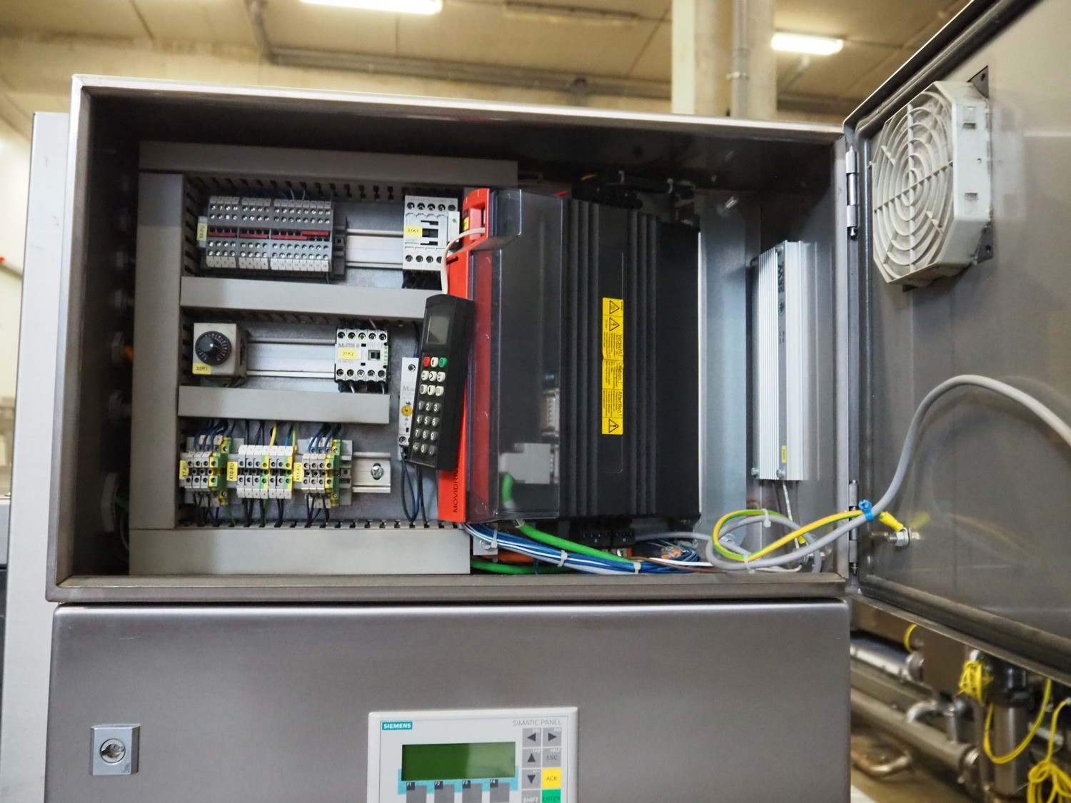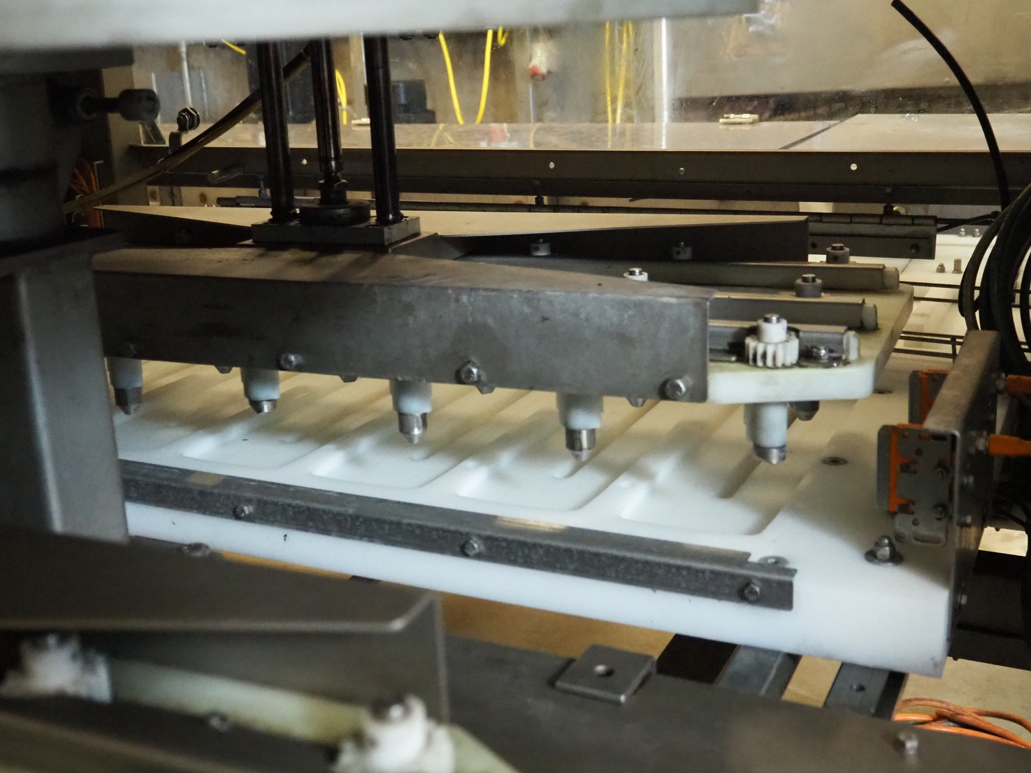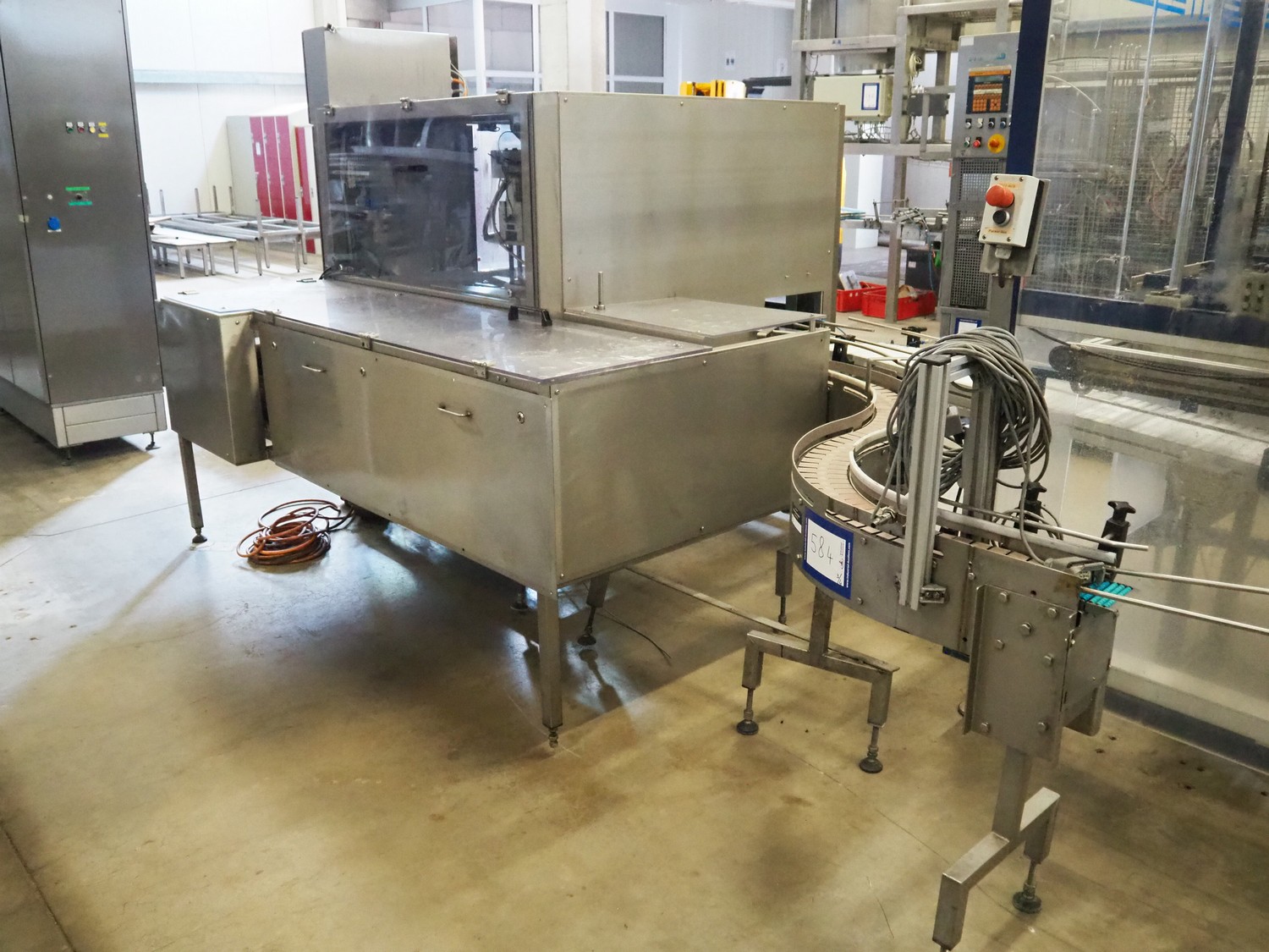 Buddenkotte Apparatebau GmbH & Co.KG box packaging machine, type: Packer, number: 1835, year of construction: 2005, 400 V, 3 Ph, 50 Hz, 16 A, 1.5 kW, plastic belt, belt width: 190 mm, s/s rollers, roller width: 350 mm, plastic chain conveyor with dividers, belt width: 230 mm, distance between dividers: 115 mm, divider height: 30 mm, plastic outfeed belt, belt width: 100 mm, total dimensions: 5000 mm x 2300 mm x 2000 mm.