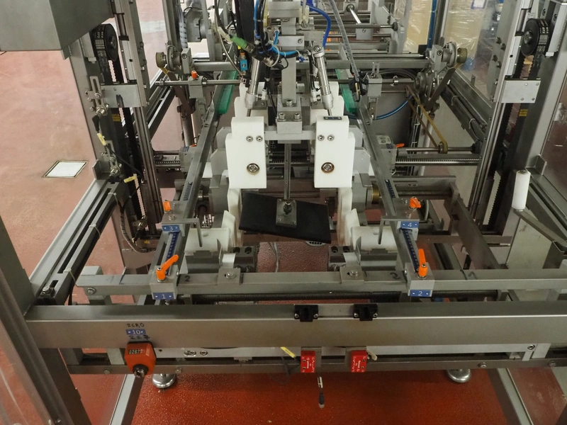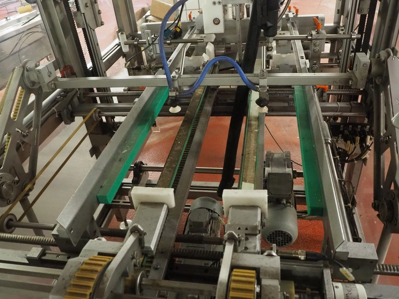 Envo carton erector, type: Aufrichter, serial number: S81, year of construction: 2014, 230/400 V, 580 Hz, 8 kW, belt width: 660 mm and 460 mm, clearance: 260 mm x 260 mm, total dimensions: 2800 mm x 1350 mm x 2400 mm. Including glue unit.