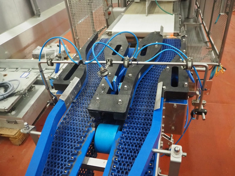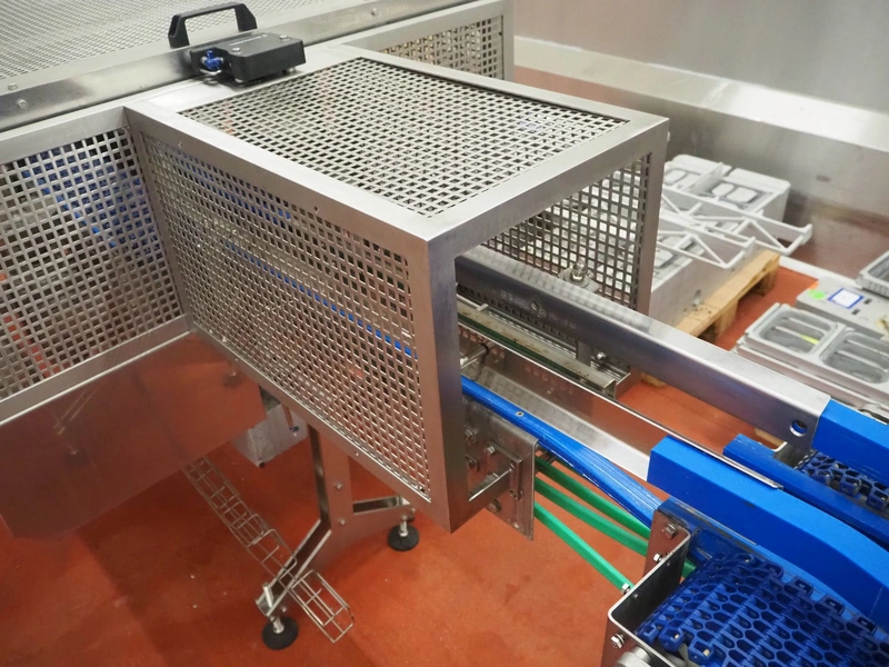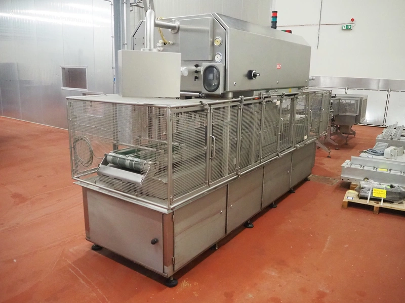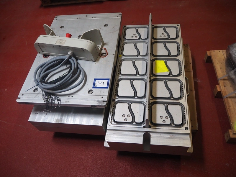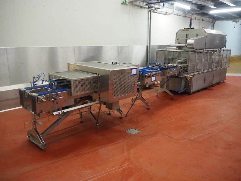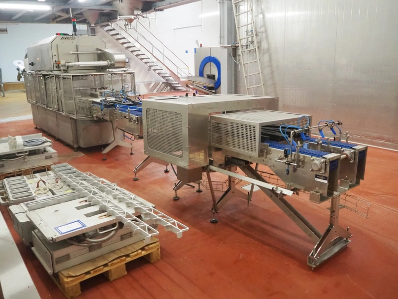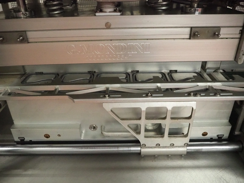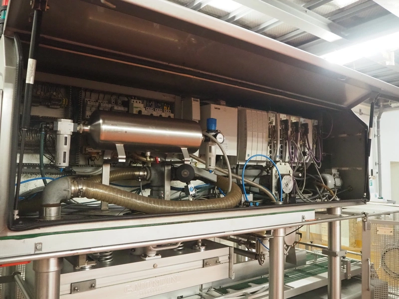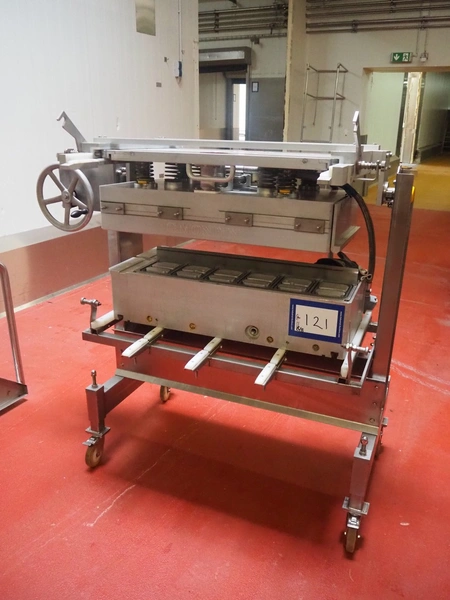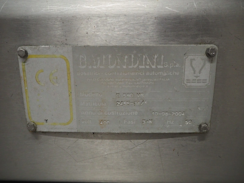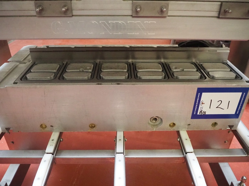 G.Mondini traysealer, model: E 590 VG, serial number: 2455-04/1, year of construction: 10-08-2004, 400 V, 3 Ph, 50 Hz, plastic string conveyor, belt width: 400 mm, dimensions dye: (10x) 200 mm x 150 mm, plastic outfeed belt, belt width: 450 mm, total dimensions: 4000 mm x 1250 mm x 2600 mm. With inliner, plastic mesh belts, belt width: (2x) 120 mm, total dimensions: 1600 mm x 800 mm x 1100 mm, and lane divider: plastic mesh belts, belt width: 120 mm, total dimensions: 2900 mm x 1300 mm x 1250 mm, 3 pallets with forms, dimensions dyes: (12x) 170 mm x 120 mm, (5x) 185 mm x 140 mm, (10x) 190 mm x 150 mm, and trolley with forms, dimensions dye: (12x) 160 mm x 120 mm, total dimensions: 1800 mm x 1000 mm x 1600 mm.