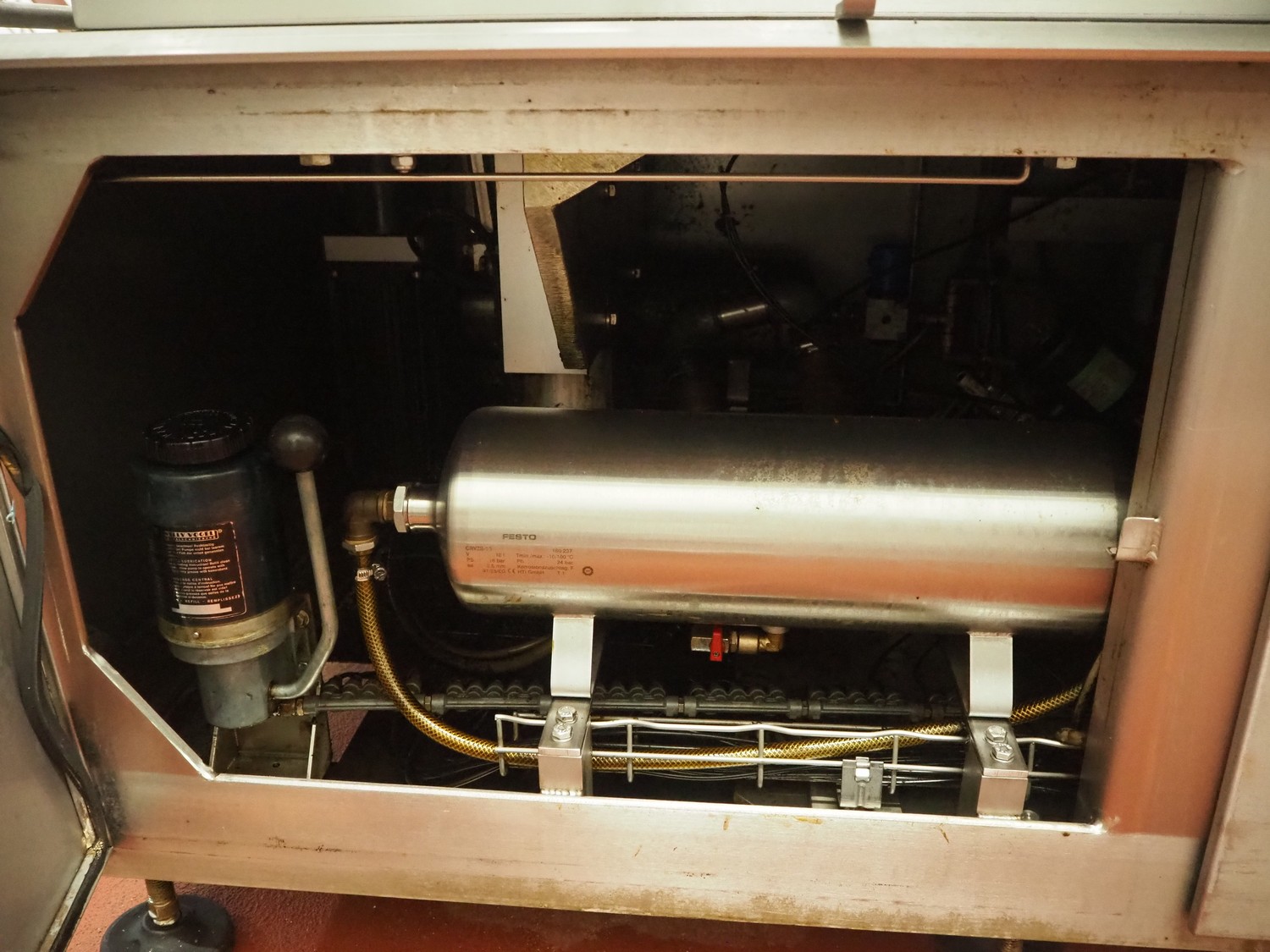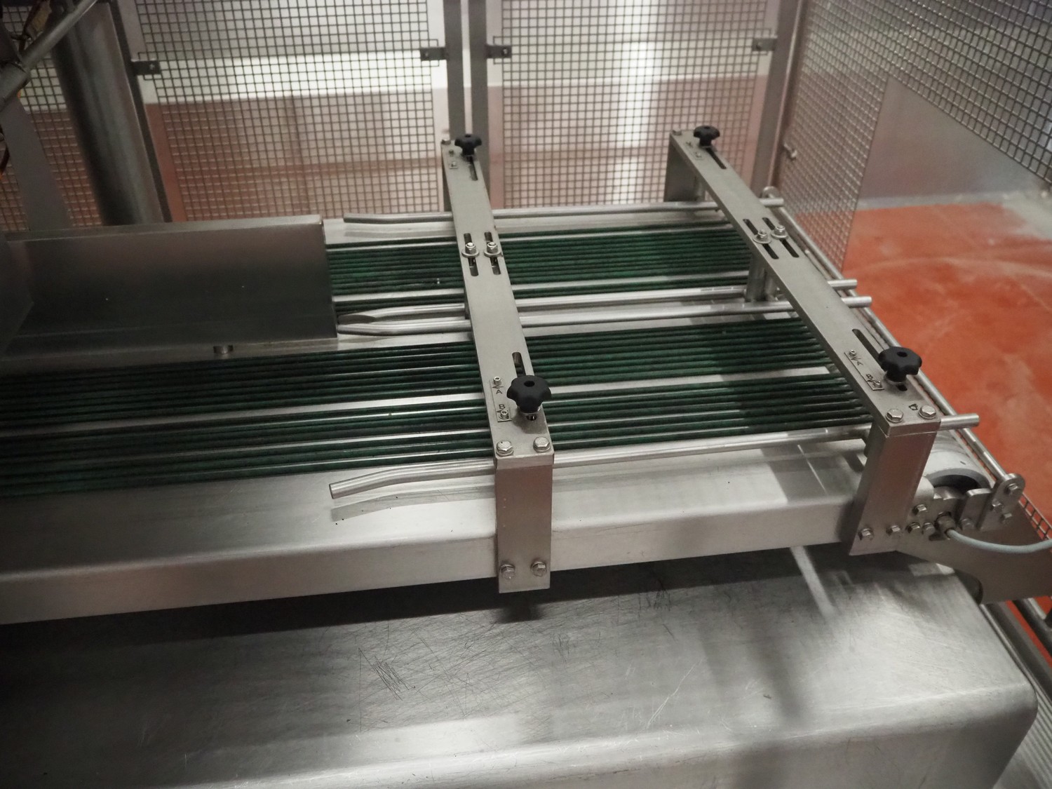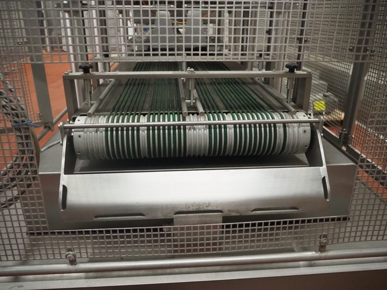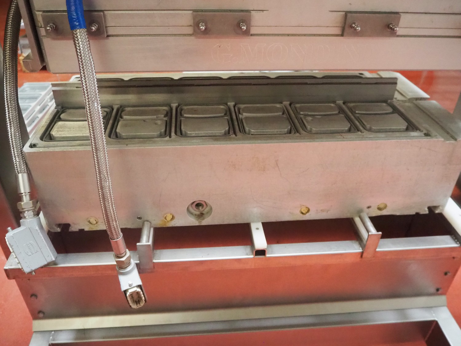G.Mondini traysealer, model: E 590 VG, serial number: 2455-04/1, year of construction: 10-08-2004, 400 V, 3 Ph, 50 Hz, plastic string conveyor, belt width: 400 mm, dimensions dye: (10x) 200 mm x 150 mm, plastic outfeed belt, belt width: 450 mm, total dimensions: 4000 mm x 1250 mm x 2600 mm. With inliner, plastic mesh belts, belt width: (2x) 120 mm, total dimensions: 1600 mm x 800 mm x 1100 mm, and lane divider: plastic mesh belts, belt width: 120 mm, total dimensions: 2900 mm x 1300 mm x 1250 mm, 3 pallets with forms, dimensions dyes: (12x) 170 mm x 120 mm, (5x) 185 mm x 140 mm, (10x) 190 mm x 150 mm, and trolley with forms, dimensions dye: (12x) 160 mm x 120 mm, total dimensions: 1800 mm x 1000 mm x 1600 mm.