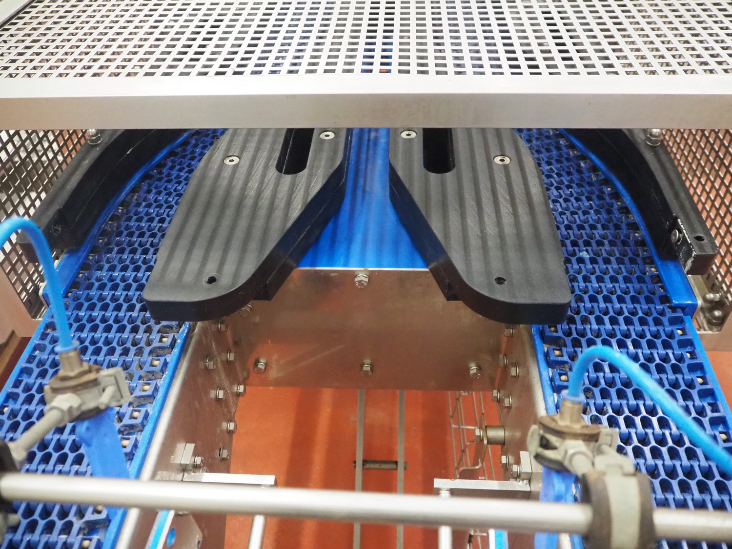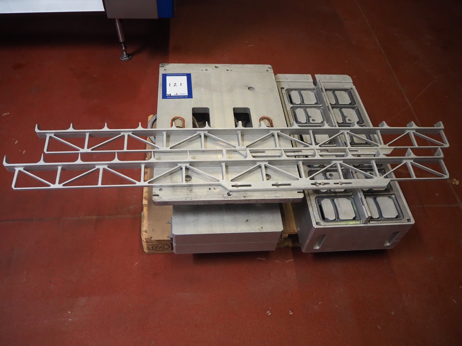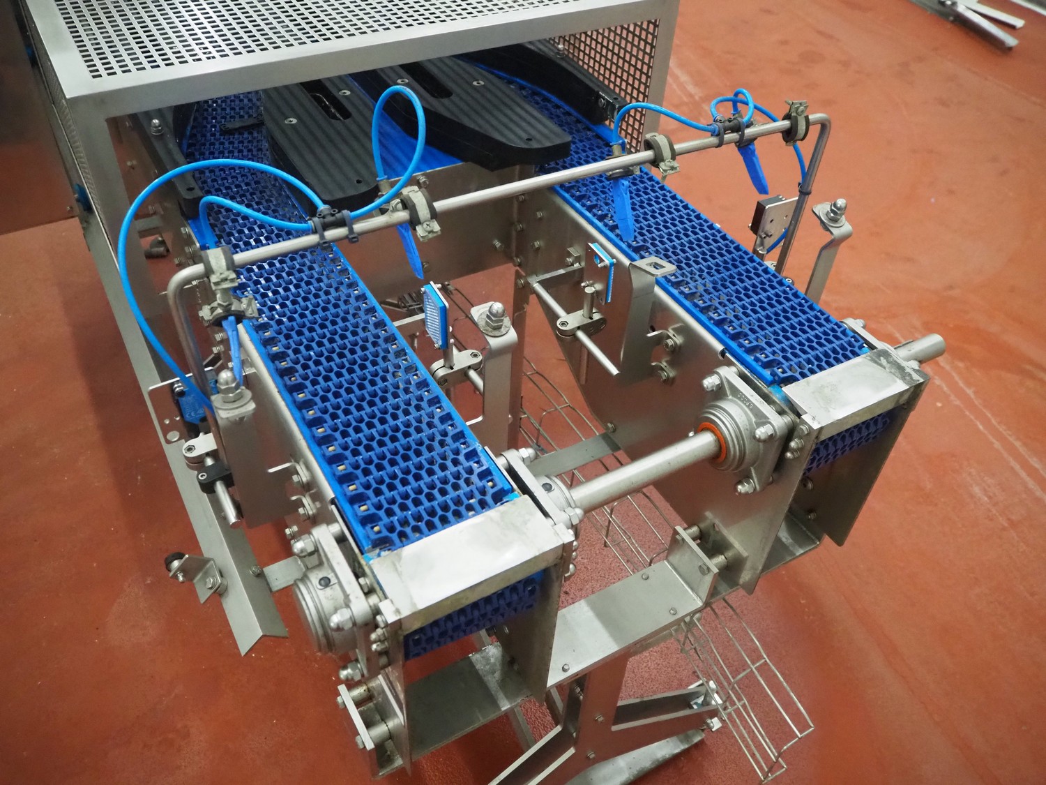 G.Mondini traysealer, model: E 590 VG, serial number: 2455-04/1, year of construction: 10-08-2004, 400 V, 3 Ph, 50 Hz, plastic string conveyor, belt width: 400 mm, dimensions dye: (10x) 200 mm x 150 mm, plastic outfeed belt, belt width: 450 mm, total dimensions: 4000 mm x 1250 mm x 2600 mm. With inliner, plastic mesh belts, belt width: (2x) 120 mm, total dimensions: 1600 mm x 800 mm x 1100 mm, and lane divider: plastic mesh belts, belt width: 120 mm, total dimensions: 2900 mm x 1300 mm x 1250 mm, 3 pallets with forms, dimensions dyes: (12x) 170 mm x 120 mm, (5x) 185 mm x 140 mm, (10x) 190 mm x 150 mm, and trolley with forms, dimensions dye: (12x) 160 mm x 120 mm, total dimensions: 1800 mm x 1000 mm x 1600 mm.