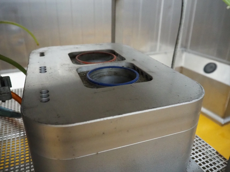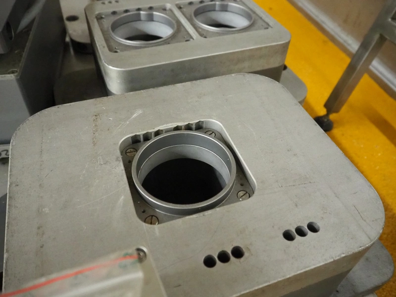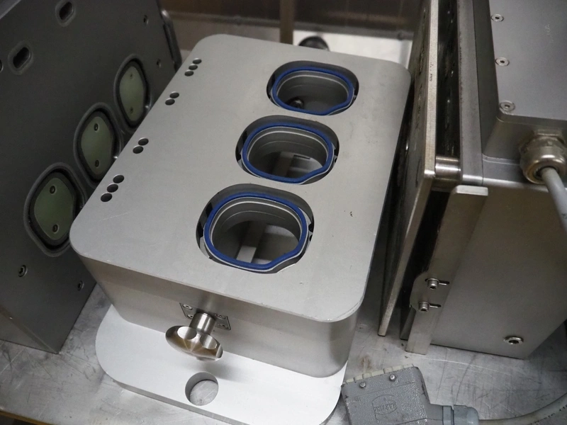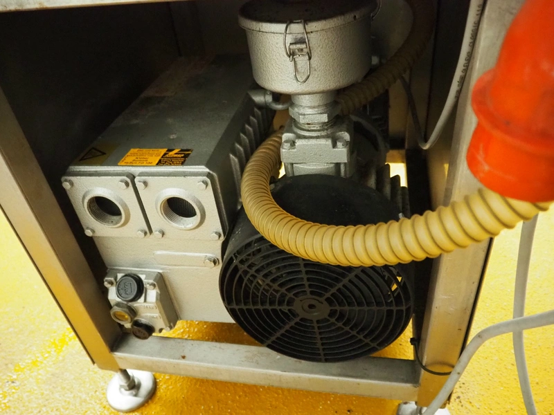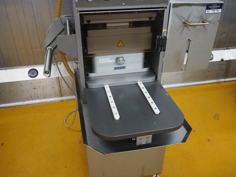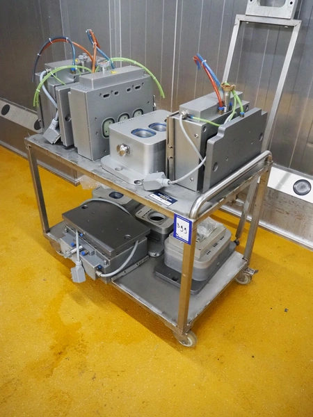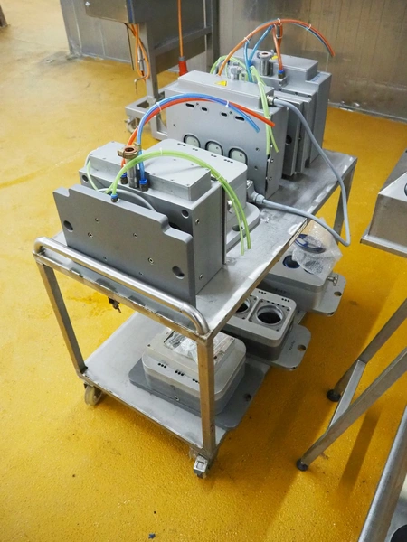 Sealpac GmbH traysealer with various dyes, type: Sealpac Mini, serial number: TVG 0346801, year of construction: 2001, 3 x 400/230 V, 1.5 kW, 270 kg, Busch vacuum pump, dimensions traysealer: 1050 mm x 1050 mm x 1800 mm, 2 trolleys with dyes, dimensions trolleys: 810 mm x 550 mm x 860 mm and 1000 mm x 600 mm x 1080 mm.
