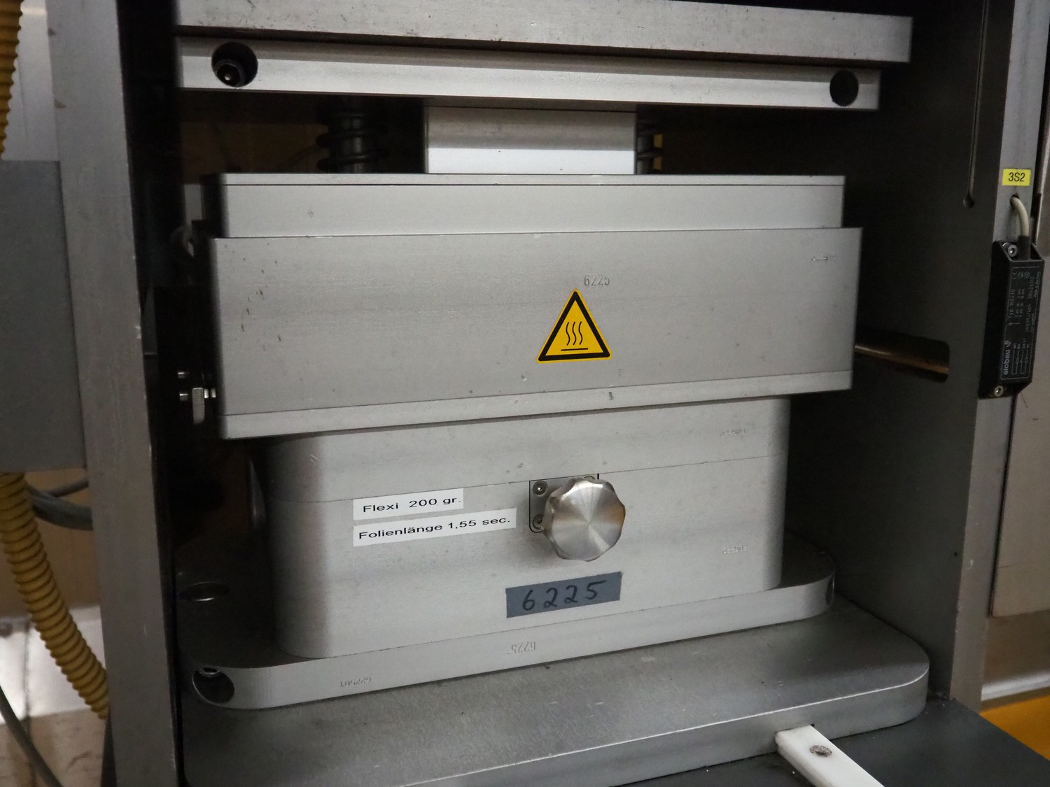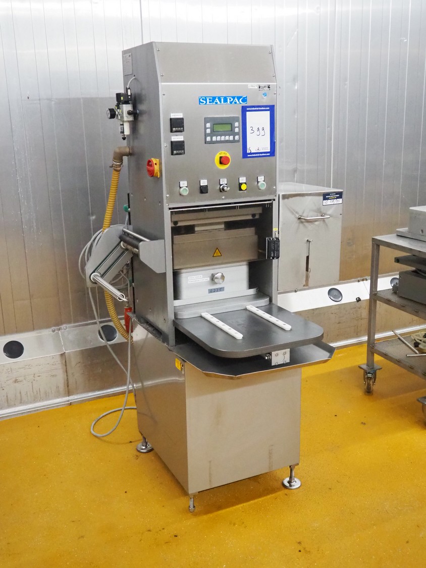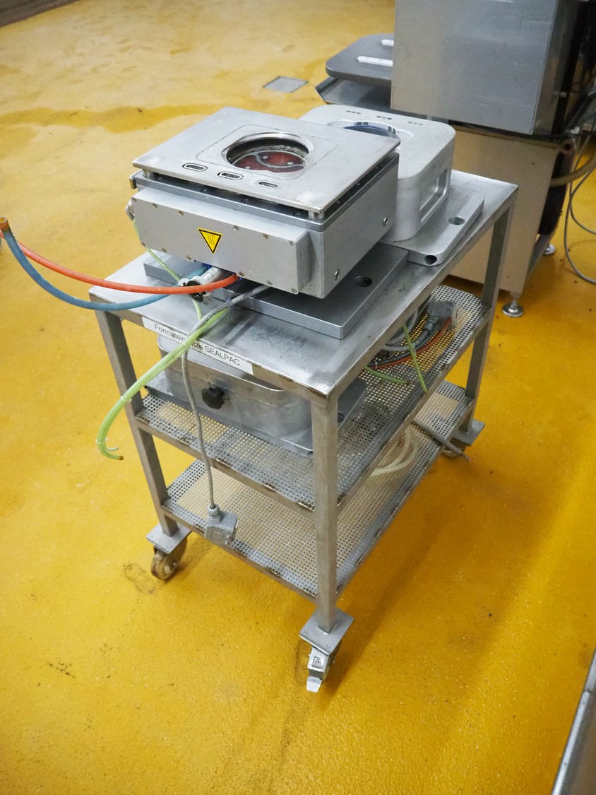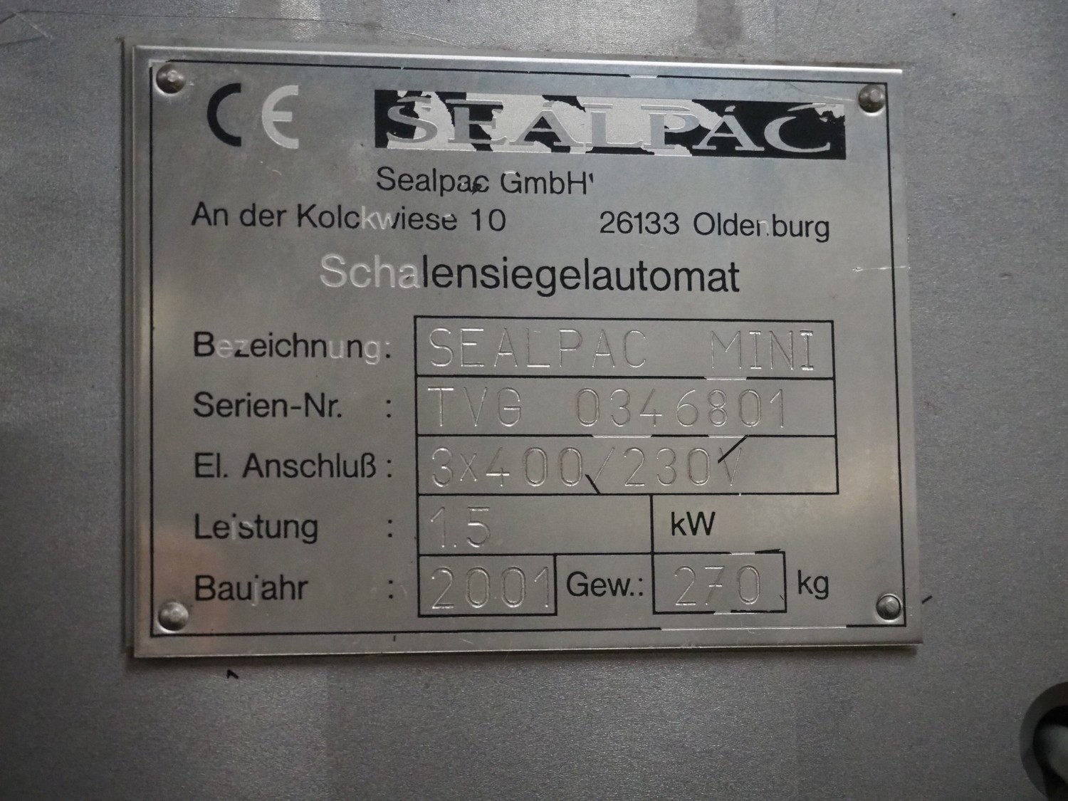 Sealpac GmbH traysealer with various dyes, type: Sealpac Mini, serial number: TVG 0346801, year of construction: 2001, 3 x 400/230 V, 1.5 kW, 270 kg, Busch vacuum pump, dimensions traysealer: 1050 mm x 1050 mm x 1800 mm, 2 trolleys with dyes, dimensions trolleys: 810 mm x 550 mm x 860 mm and 1000 mm x 600 mm x 1080 mm.