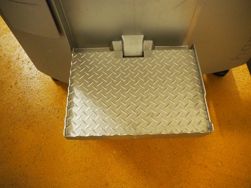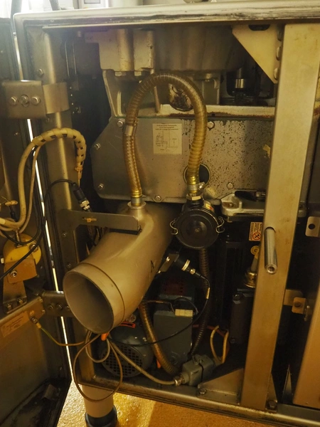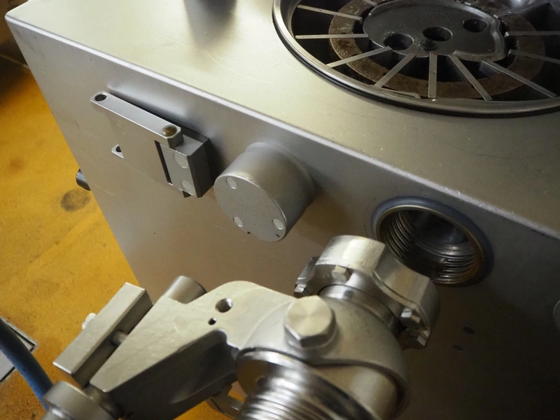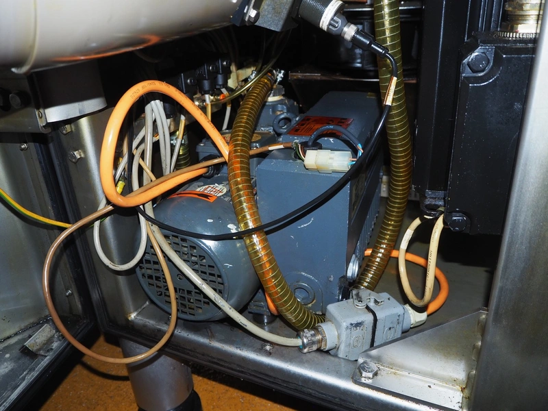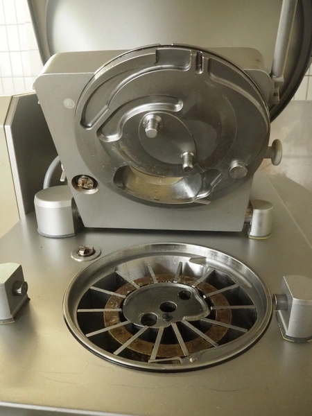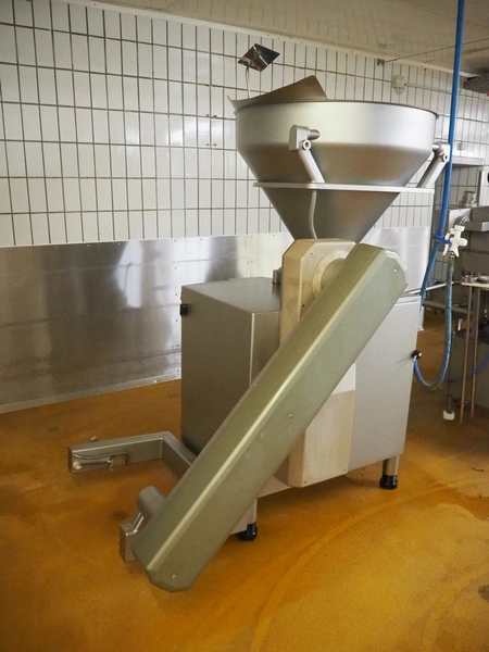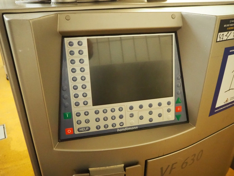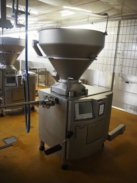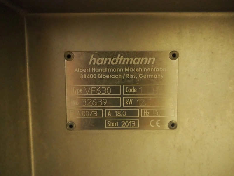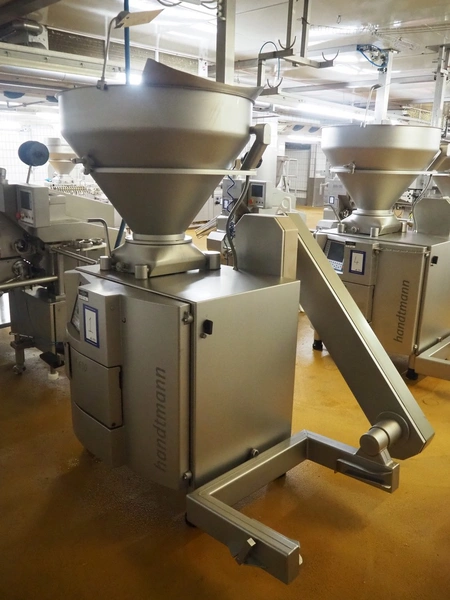 Handtmann vacuum filling machine with lifter for meat bins, type: VF630, number: 32639, year of construction: 2013, 400 V, 3 Ph, 50 Hz, 18.0 A, 12.5 kW, Busch vacuum pump, type: KB 0040 D, serial number: 03040978, capacity: 48 m³ per hour, dimensions: 2000 mm x 1400 mm x 2200 mm.