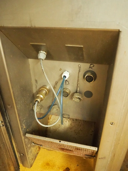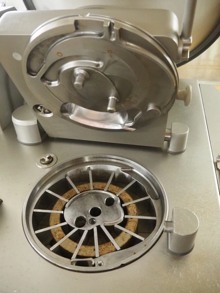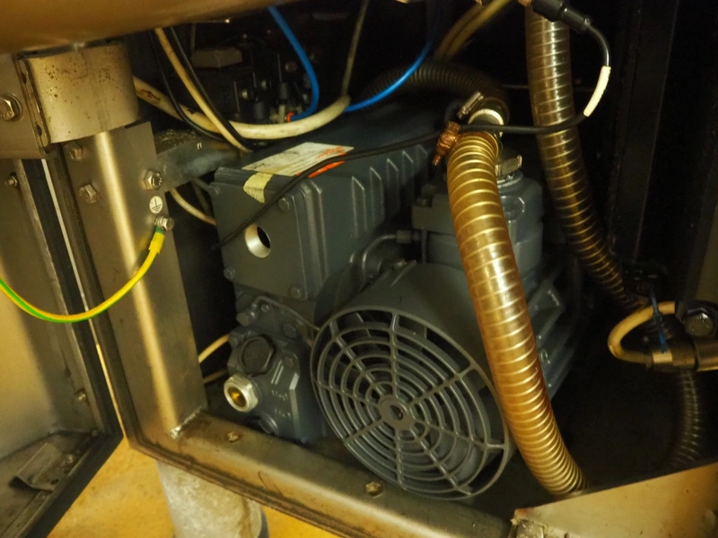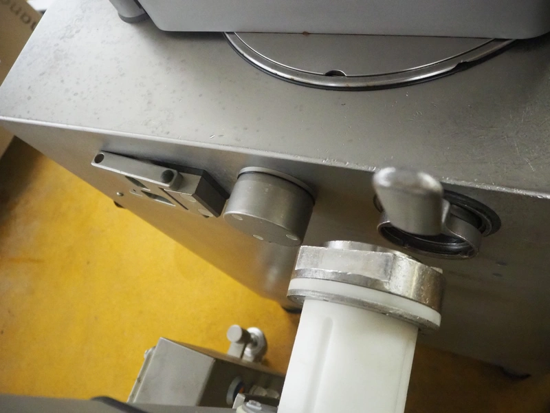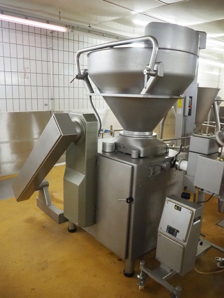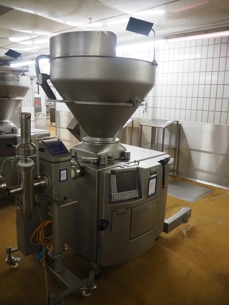 Handtmann vacuum filling machine with lifter for meat bins, type: VF630, number: 28087 S, year of construction: 2010, 400 V, 3 Ph, 50 Hz, 18.0 A, 12.5 kW, Busch vacuum pump, dimensions: 1800 mm x 1400 mm x 2200 mm.
