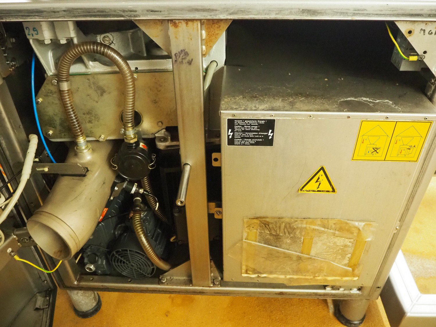 Handtmann vacuum filling machine with lifter for meat bins, type: VF630, number: 28087 S, year of construction: 2010, 400 V, 3 Ph, 50 Hz, 18.0 A, 12.5 kW, Busch vacuum pump, dimensions: 1800 mm x 1400 mm x 2200 mm.
