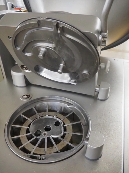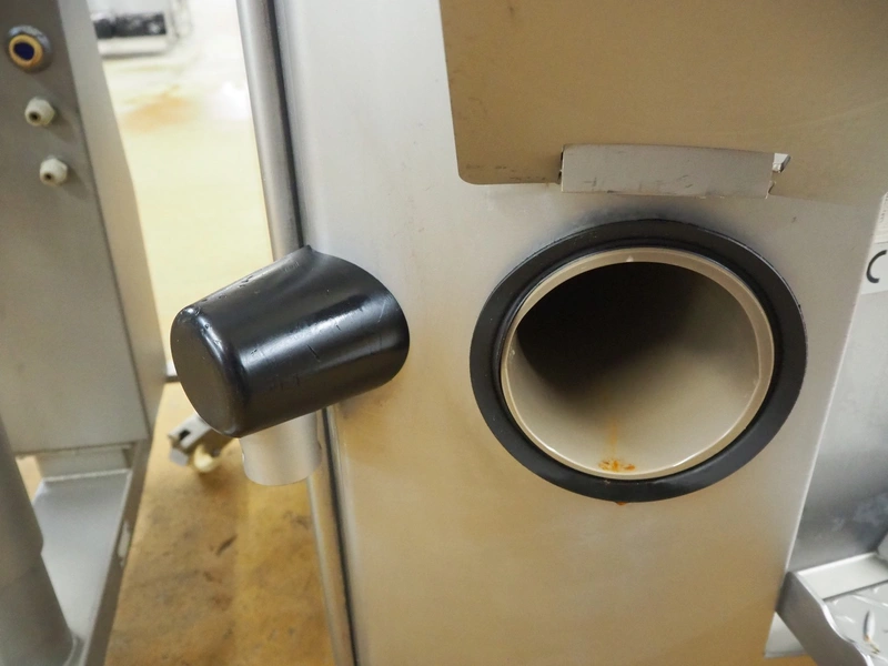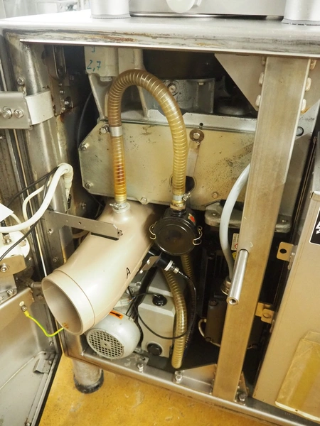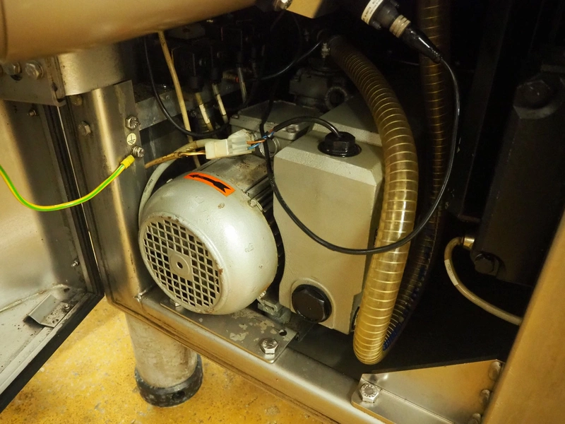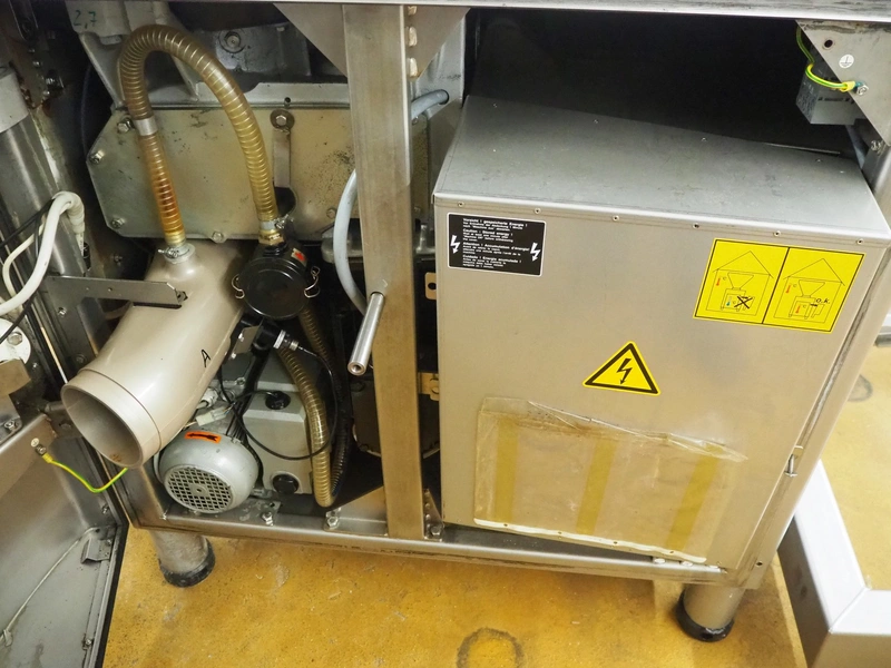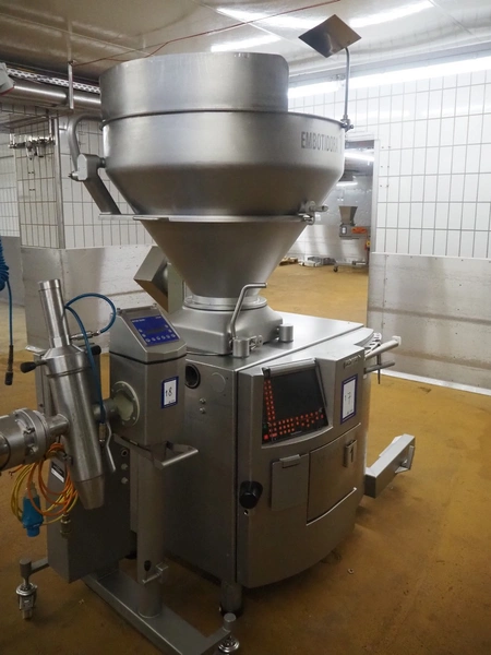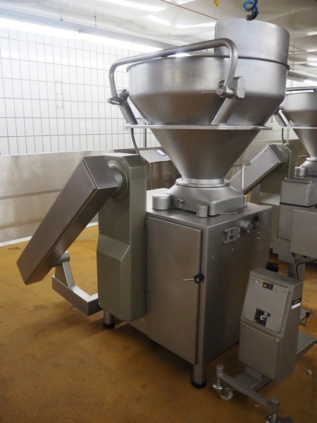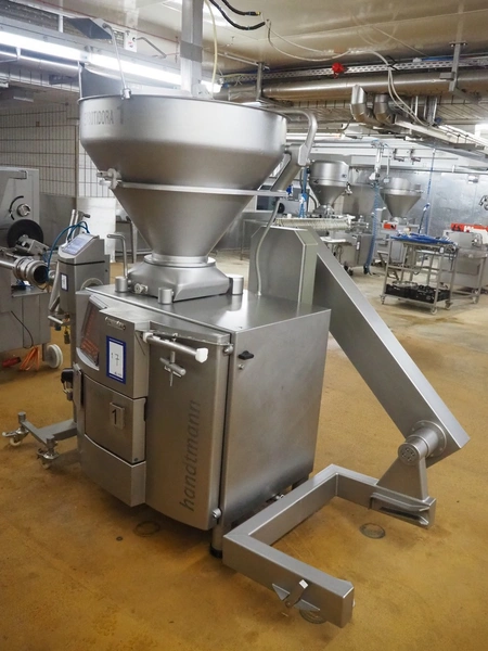 Handtmann vacuum filling machine with lifter for meat bins, type: VF630, number: 26690 S, year of construction: 2009, 400 V, 3 Ph, 50 Hz, 26.0 A, 18.0 kW, Busch vacuum pump, type: KB 0040 D IZO, number: 100019520, year of construction: 2009, capacity: 40 m³ per hour, dimensions: 1800 mm x 1400 mm x 2200 mm.
