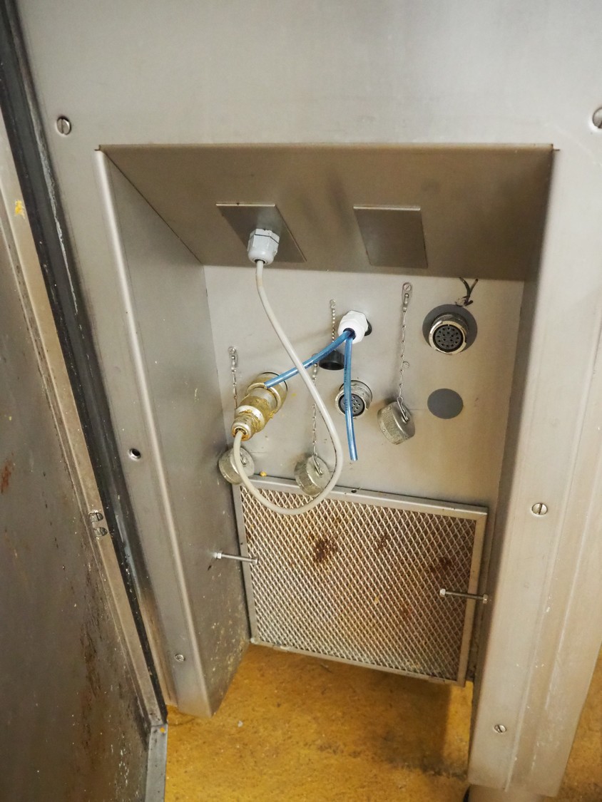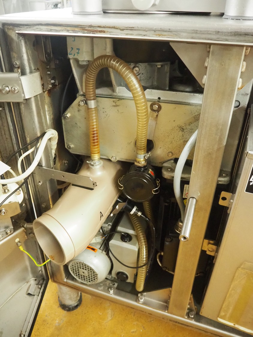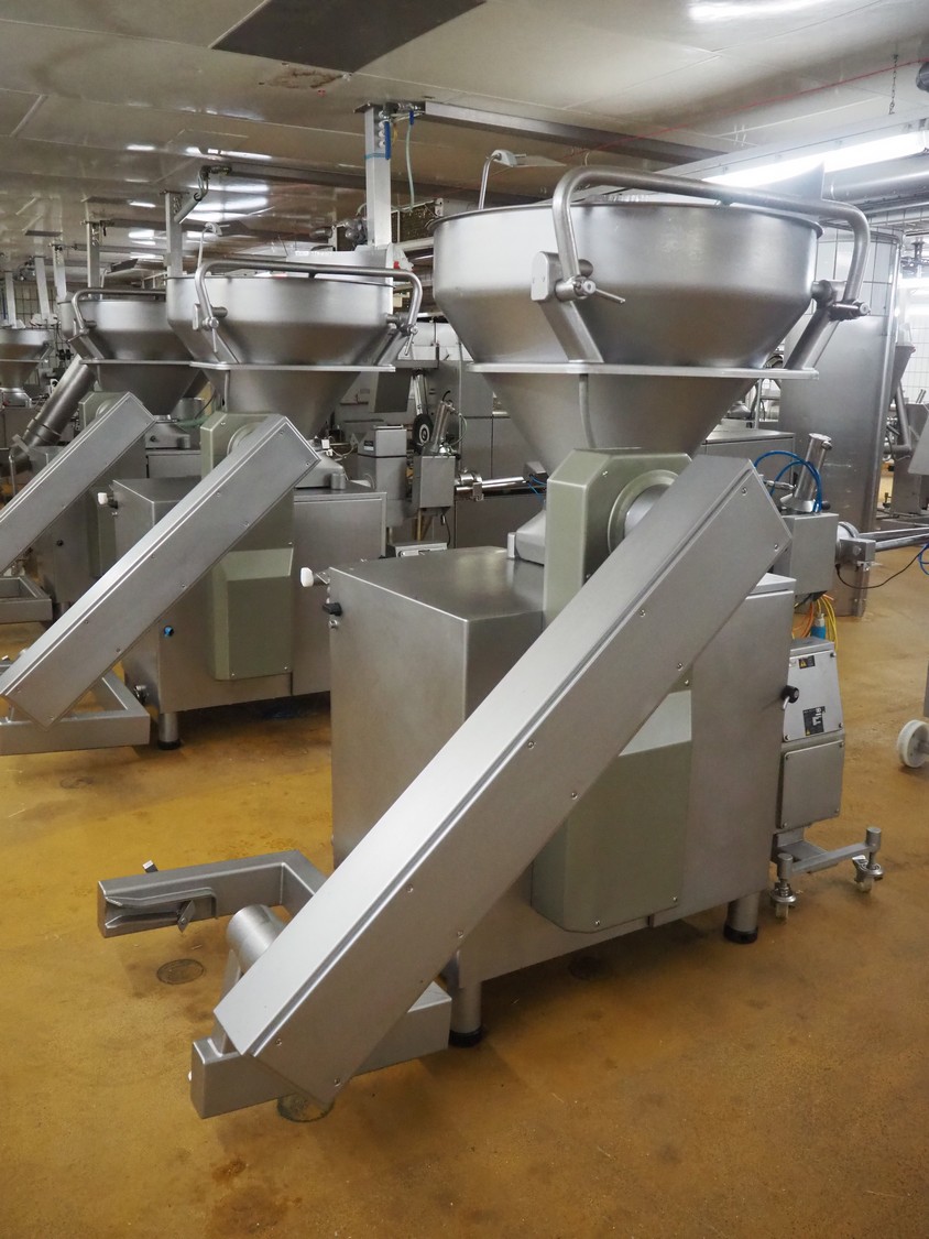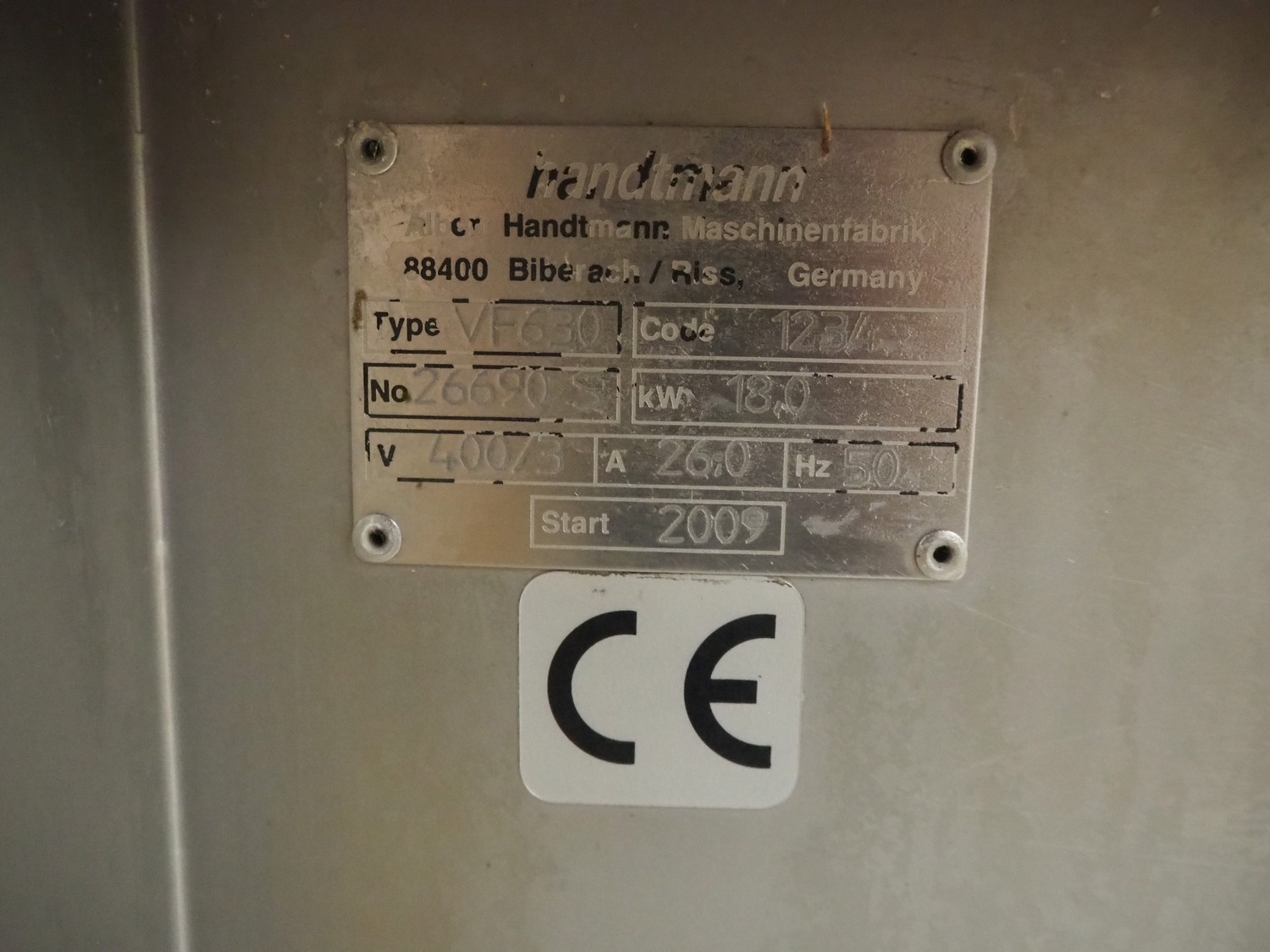 Handtmann vacuum filling machine with lifter for meat bins, type: VF630, number: 26690 S, year of construction: 2009, 400 V, 3 Ph, 50 Hz, 26.0 A, 18.0 kW, Busch vacuum pump, type: KB 0040 D IZO, number: 100019520, year of construction: 2009, capacity: 40 m³ per hour, dimensions: 1800 mm x 1400 mm x 2200 mm.