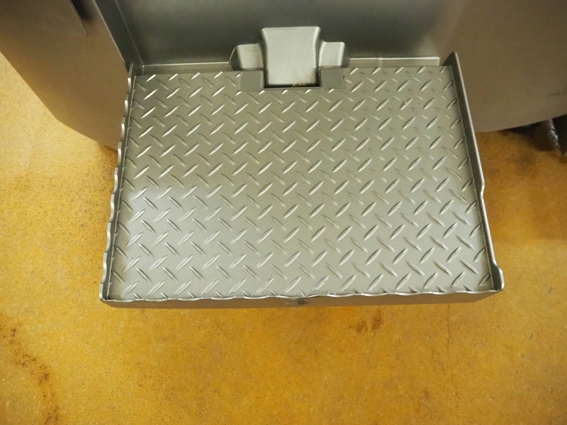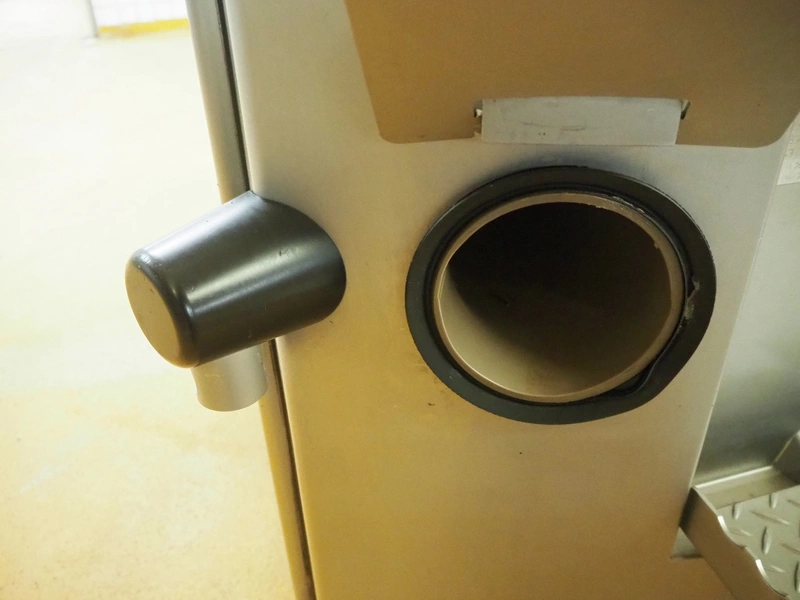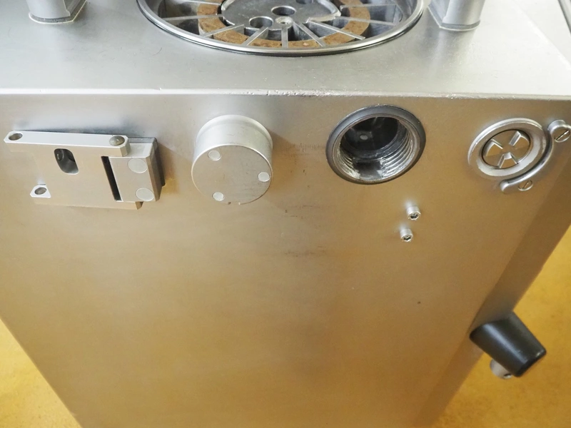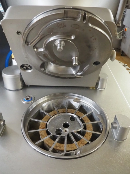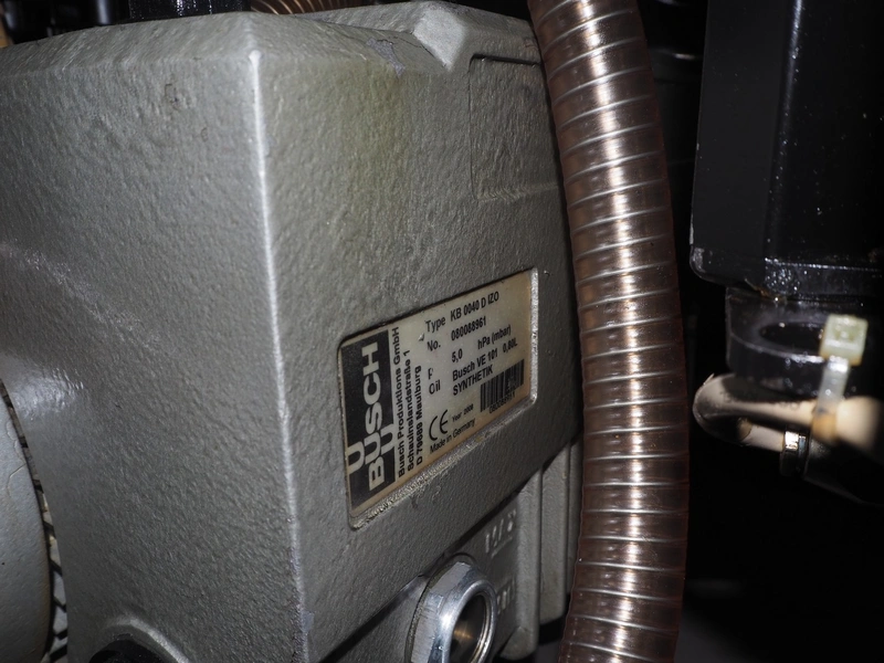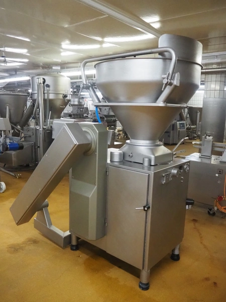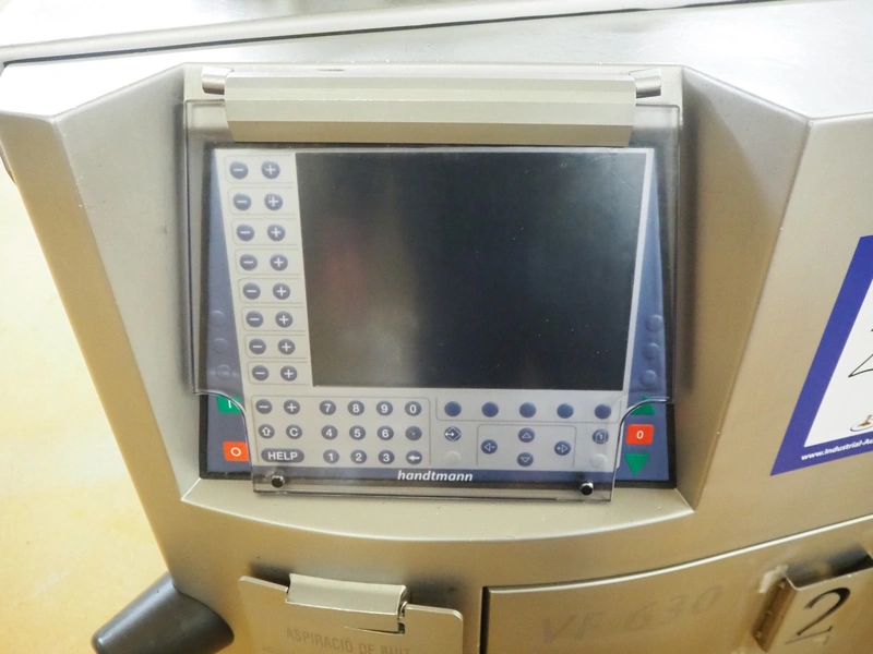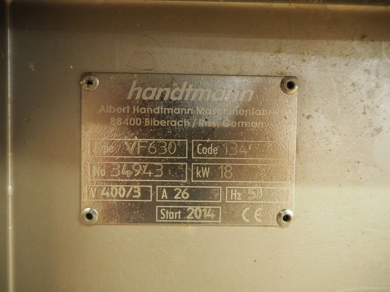 Handtmann vacuum filling machine with lifter for meat bins, type: VF630, number: 34943, year of construction: 2014, 400 V, 3 Ph, 50 Hz, 26 A, 18 kW, Busch vacuum pump, type: KB 0040 D IZO, number: 080088961, year of construction: 2008, capacity: 40 m³ per hour, dimensions: 1800 mm x 1400 mm x 2200 mm.