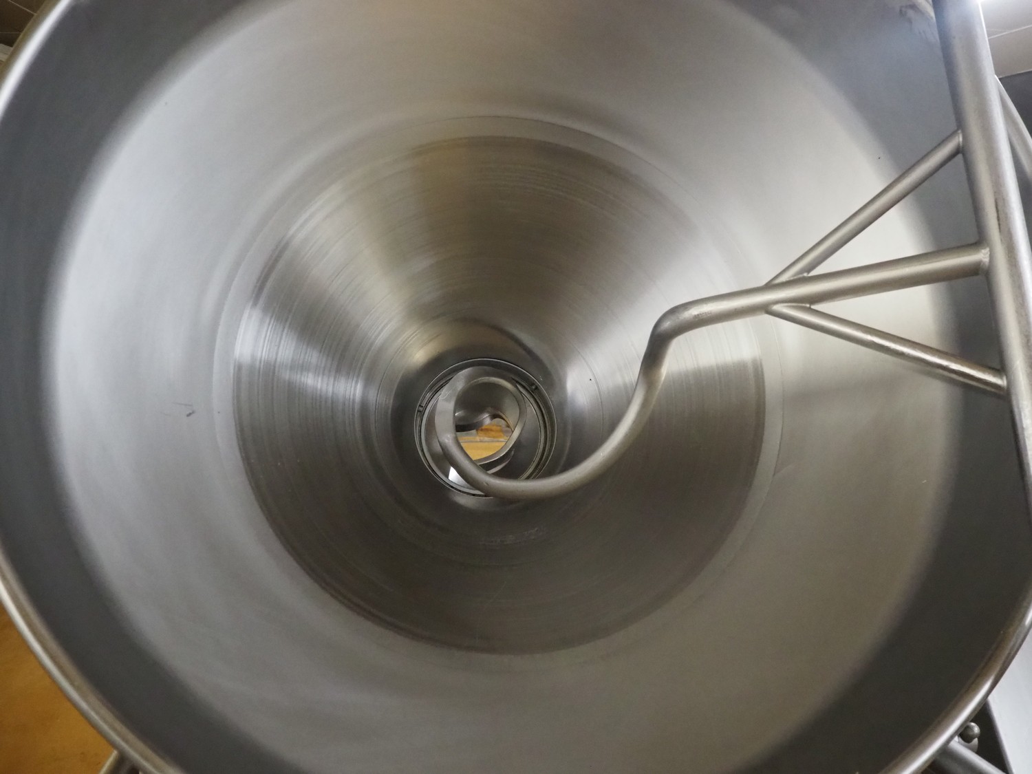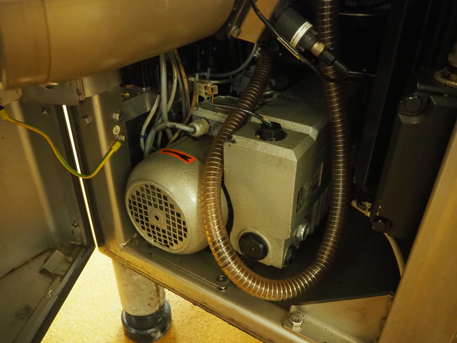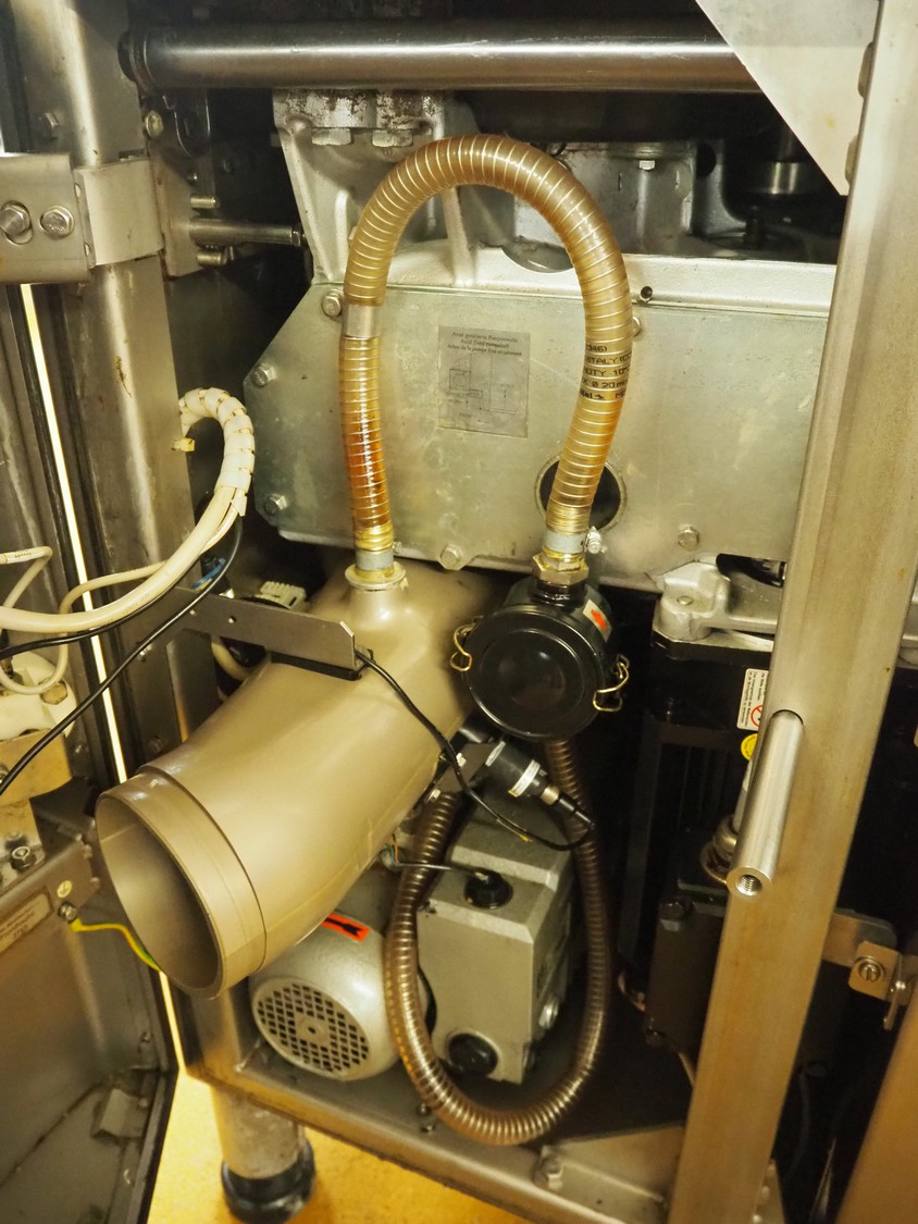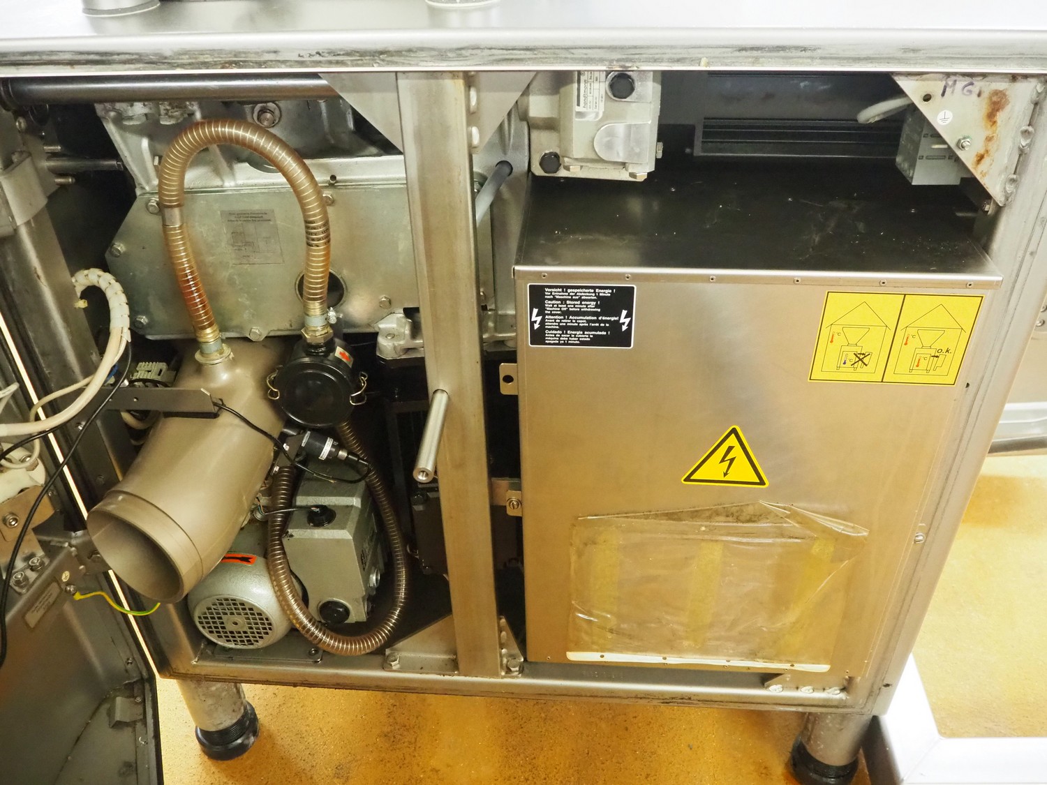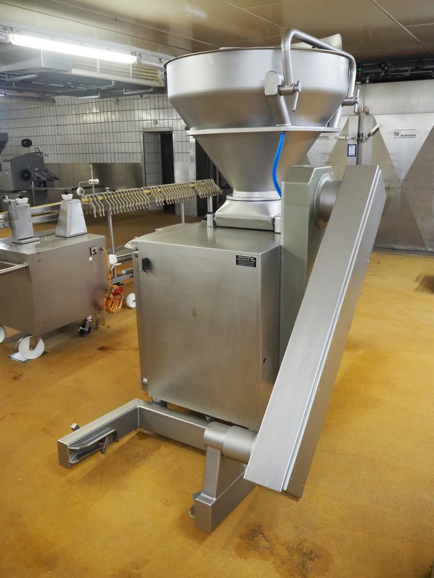 Handtmann vacuum filling machine with lifter for meat bins, type: VF630, number: 34943, year of construction: 2014, 400 V, 3 Ph, 50 Hz, 26 A, 18 kW, Busch vacuum pump, type: KB 0040 D IZO, number: 080088961, year of construction: 2008, capacity: 40 m³ per hour, dimensions: 1800 mm x 1400 mm x 2200 mm.
