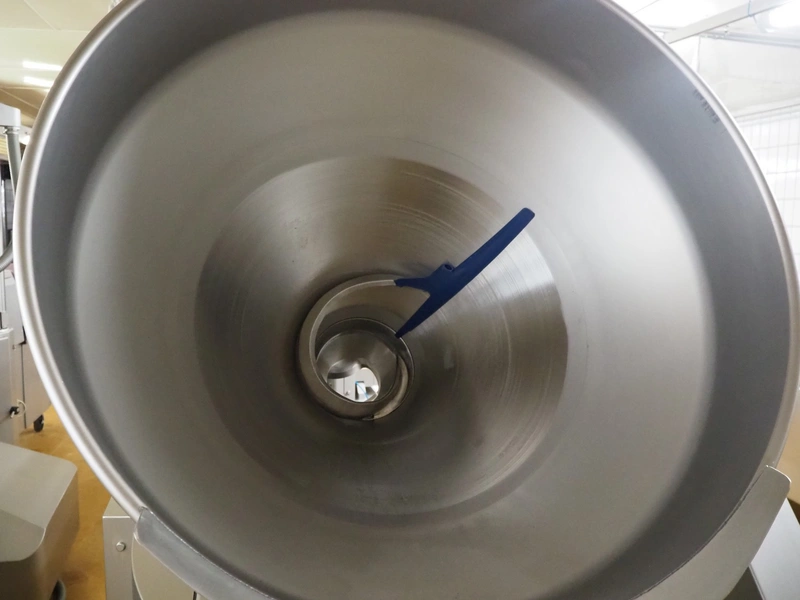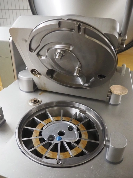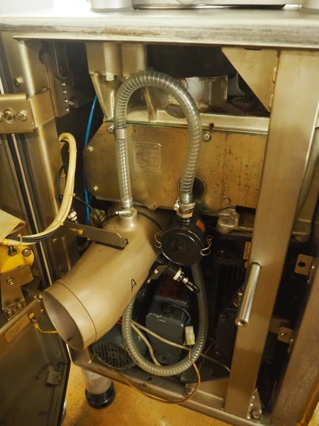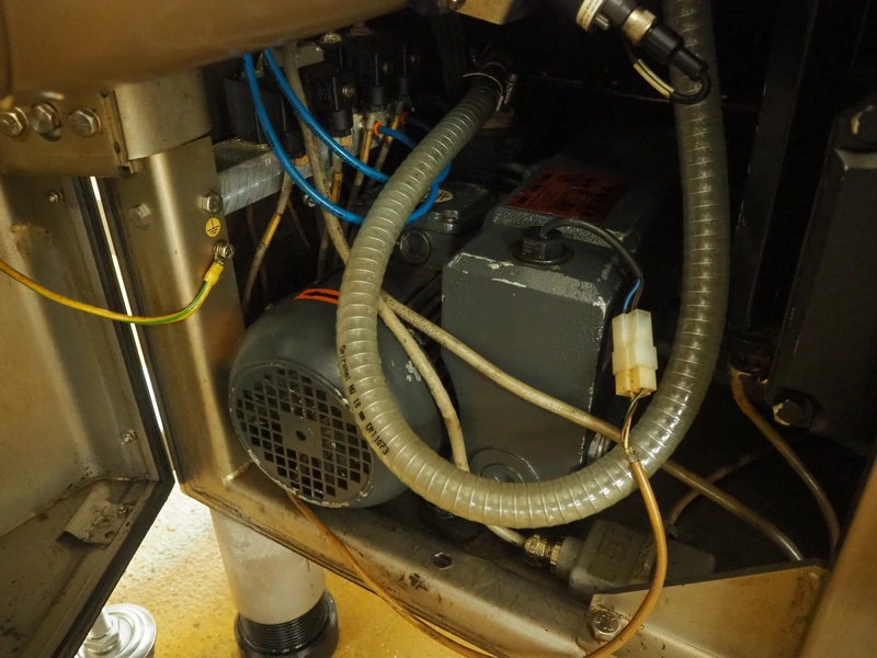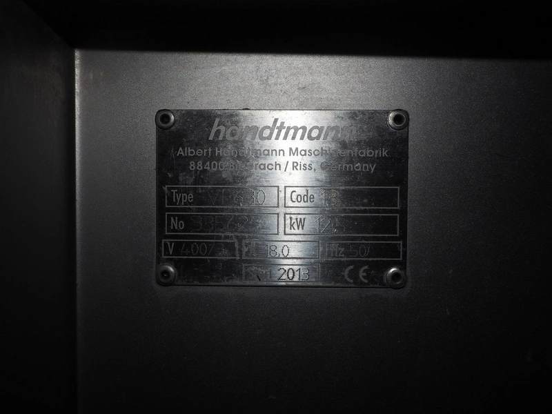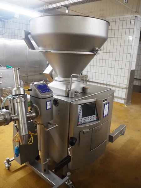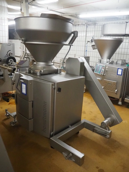 Handtmann vacuum filling machine with lifter for meat bins, type: VF630, number: 33562, year of construction: 2013, 400 V, 3 Ph, 50 Hz, 18.0 A, 12.5 kW, Busch vacuum pump, dimensions: 2000 mm x 1400 mm x 2200 mm.