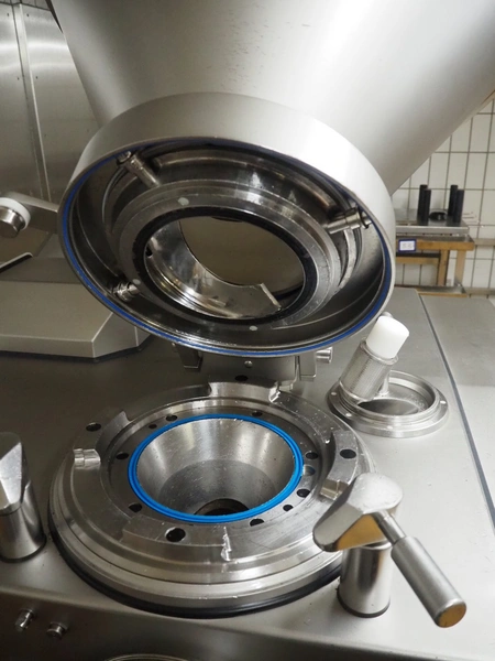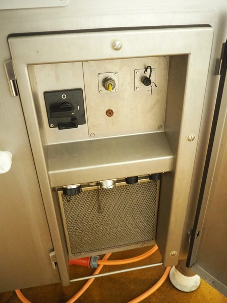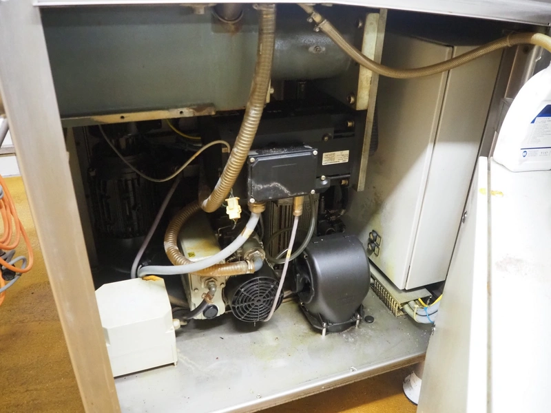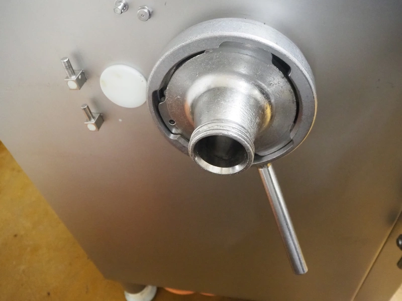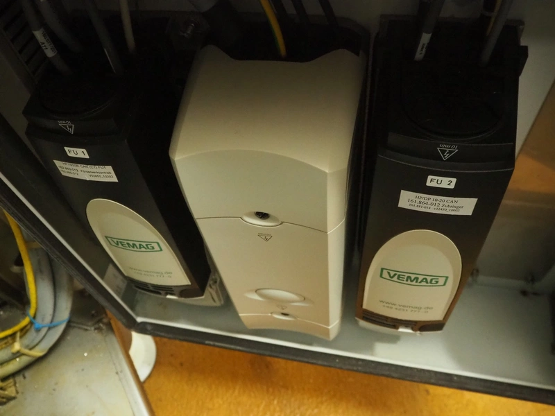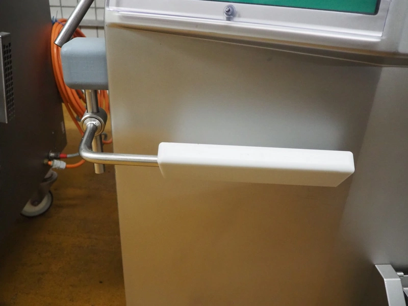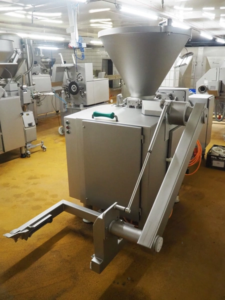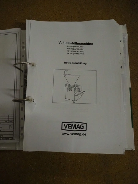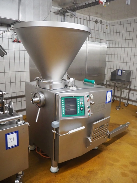 Vemag vacuum filling machine with lifter for 200 liter meat bins, model: HP20E, serial number: 1630677, year of construction: 2014, 220-240 V / 400-460 V / 575 V, 3 Ph, 50/60 Hz, 37 A, 20 kW, total dimensions: 2100 mm x 1700 mm x 2450 mm, including tool trolley, dimensions: 1200 mm x 900 mm x 1100 mm. Missing vacuum pot and scraper.
