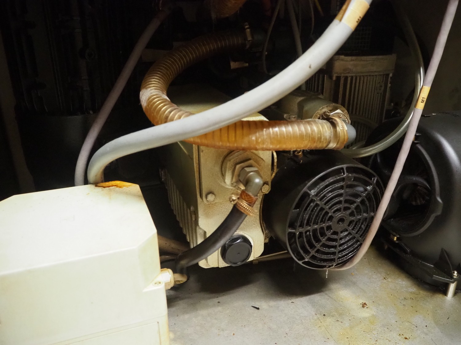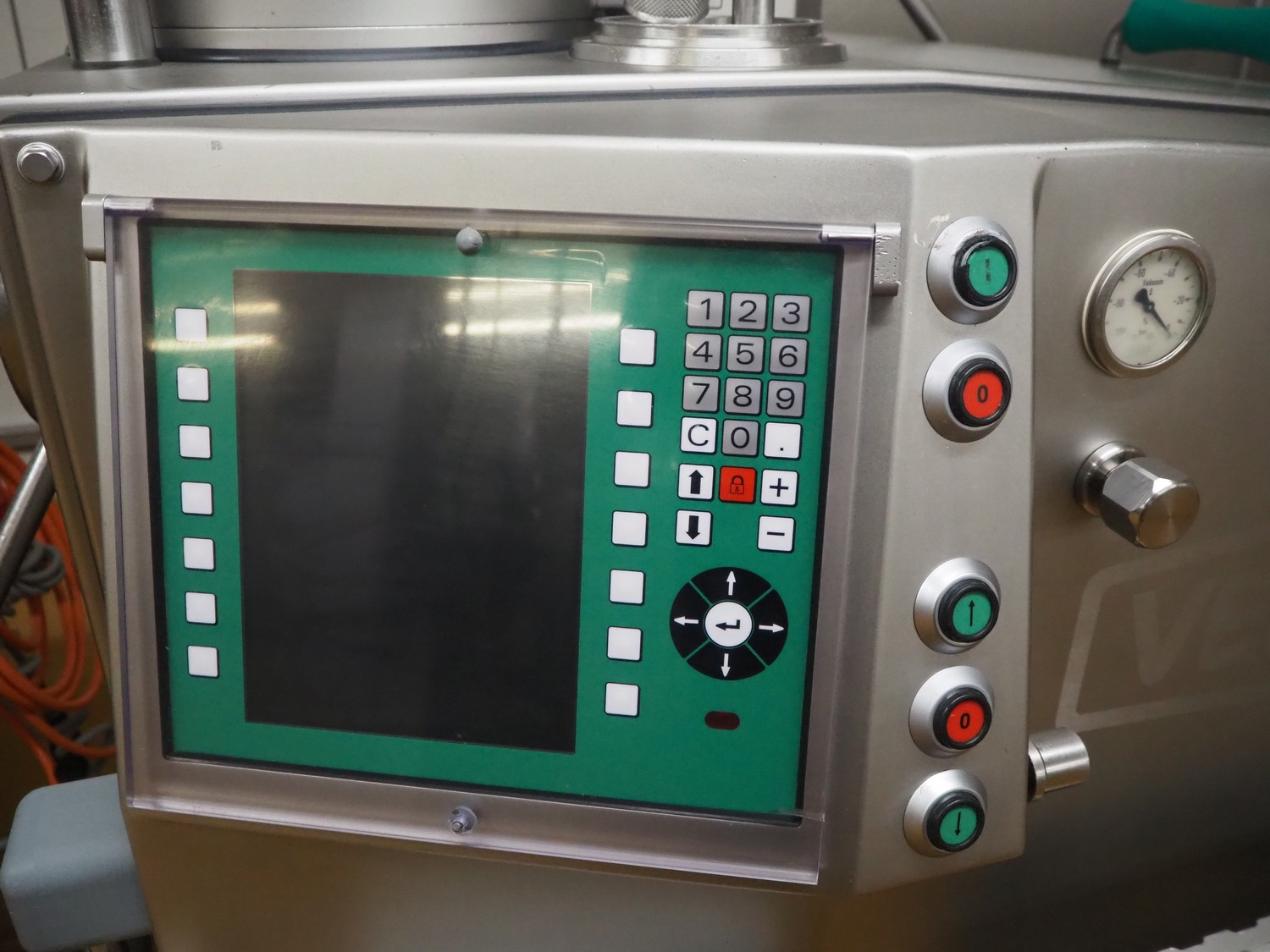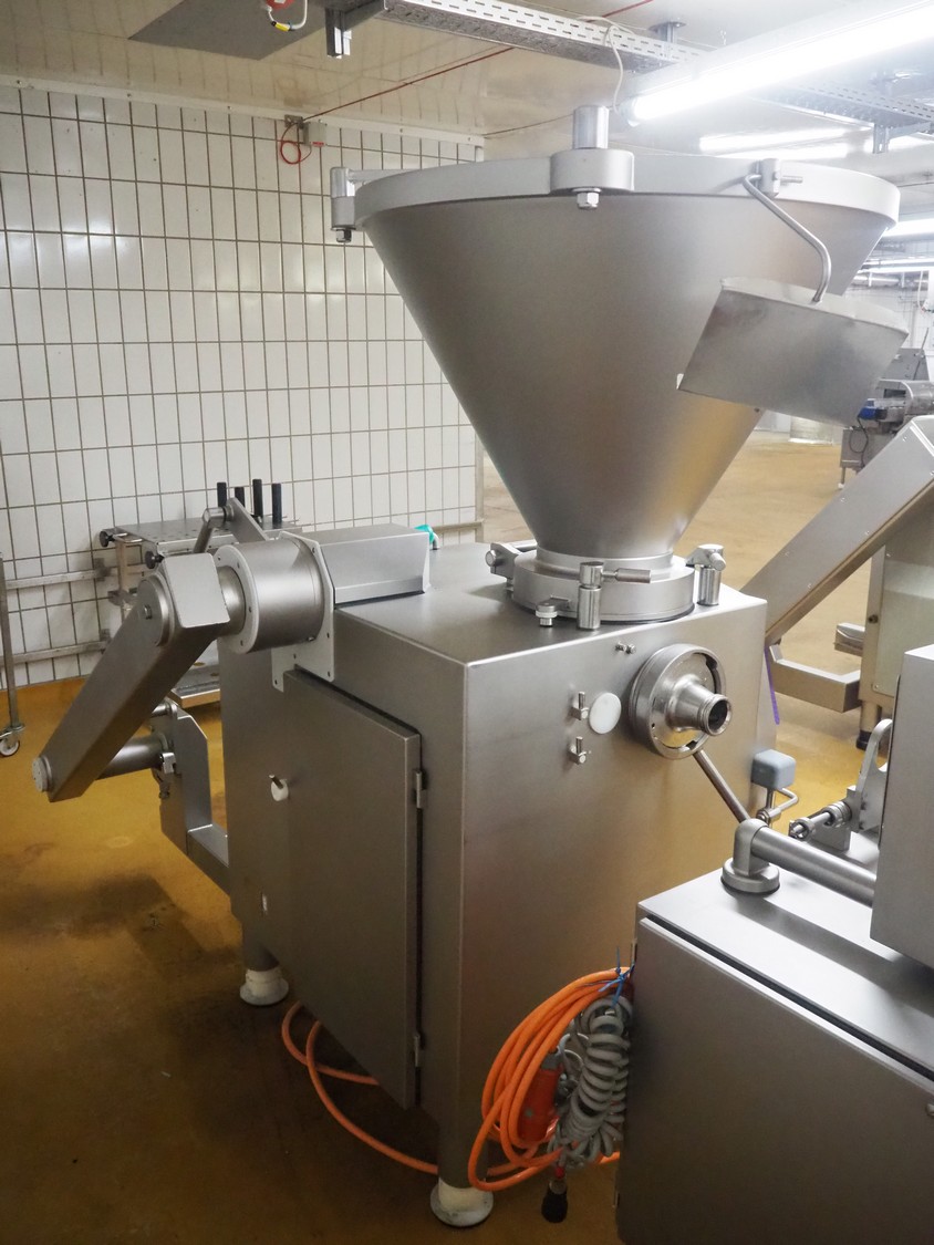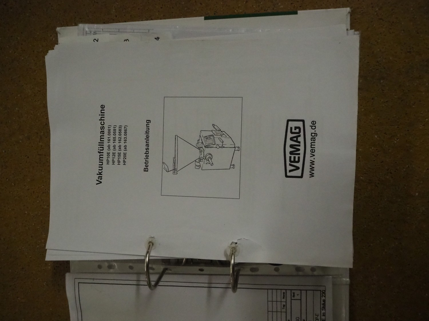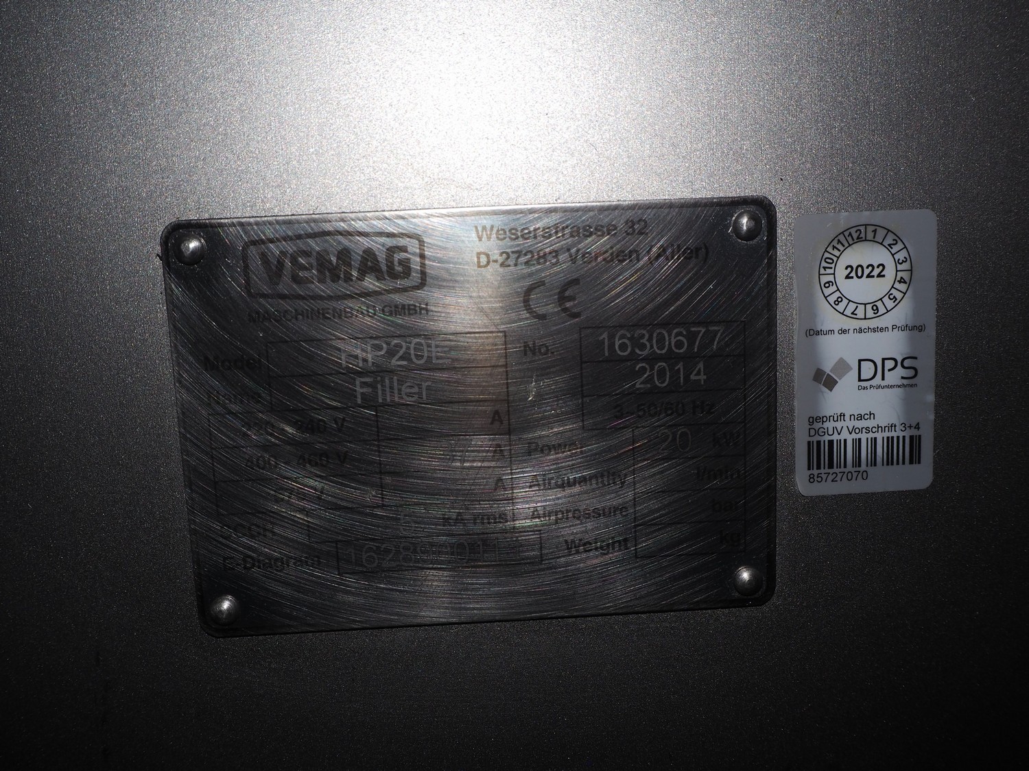 Vemag vacuum filling machine with lifter for 200 liter meat bins, model: HP20E, serial number: 1630677, year of construction: 2014, 220-240 V / 400-460 V / 575 V, 3 Ph, 50/60 Hz, 37 A, 20 kW, total dimensions: 2100 mm x 1700 mm x 2450 mm, including tool trolley, dimensions: 1200 mm x 900 mm x 1100 mm. Missing vacuum pot and scraper.