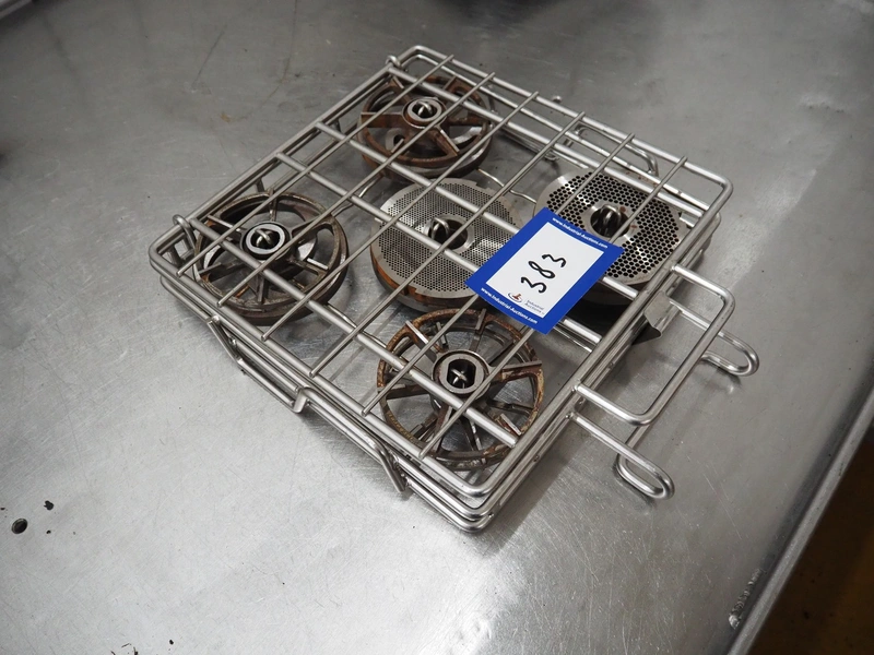 S/s basket with 4 knives and 6 plates for Handtmann grinding head, plate diameter: 130 mm.