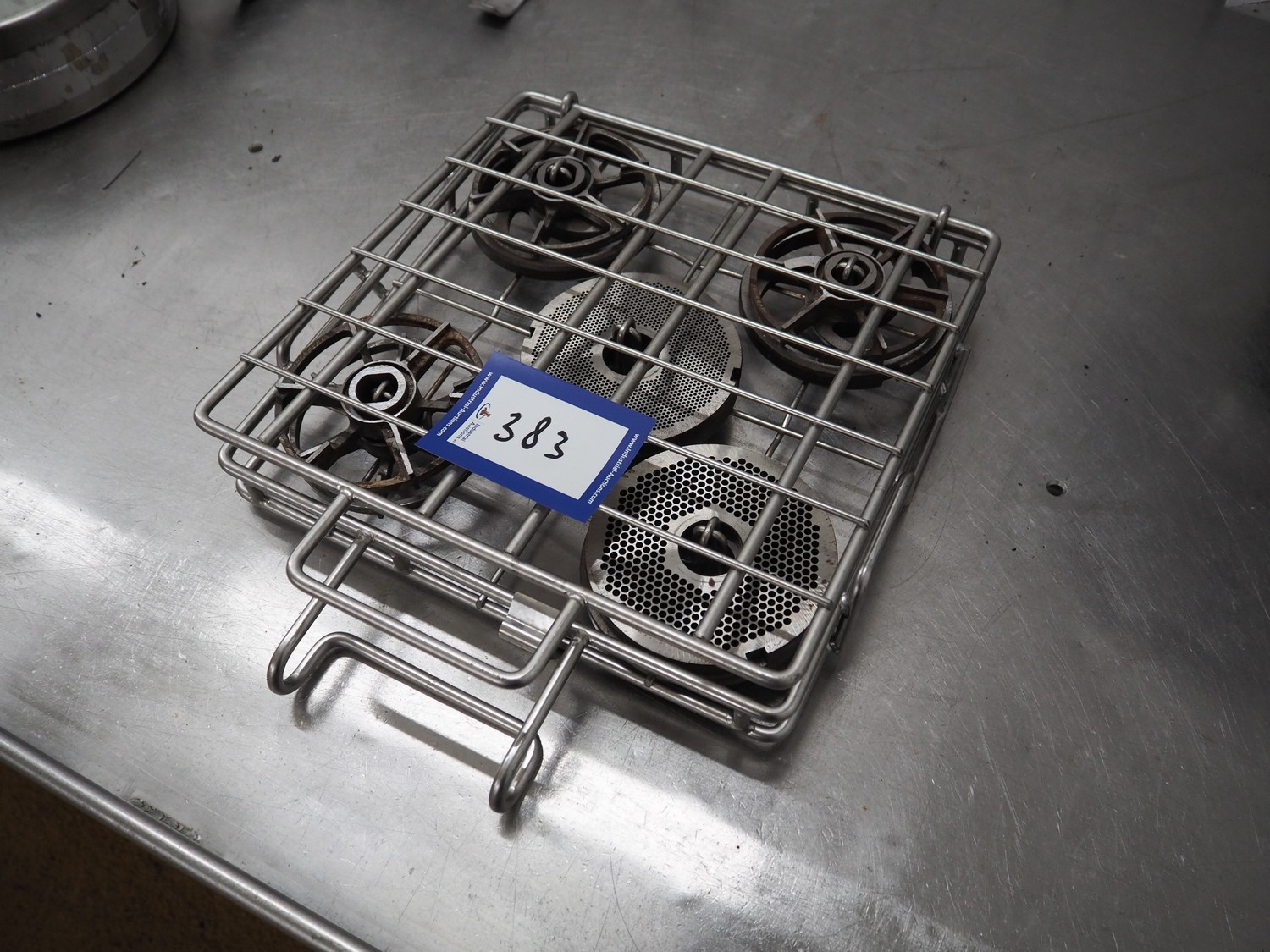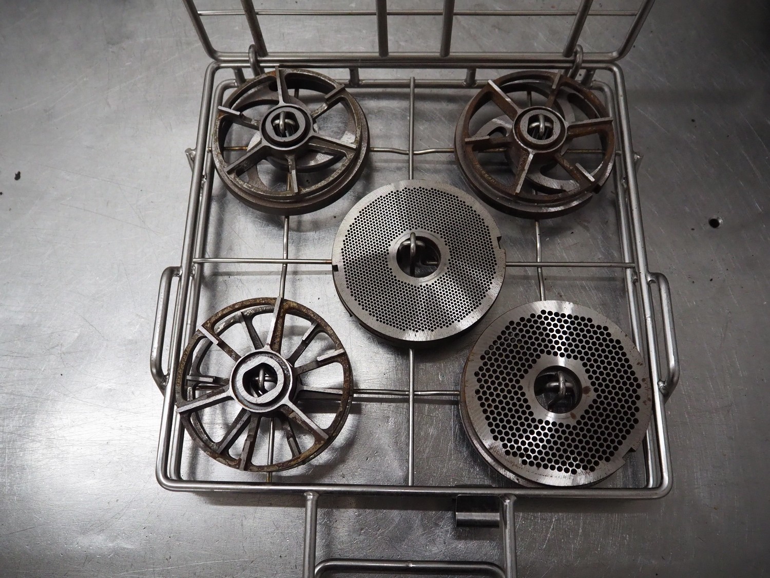 S/s basket with 4 knives and 6 plates for Handtmann grinding head, plate diameter: 130 mm.