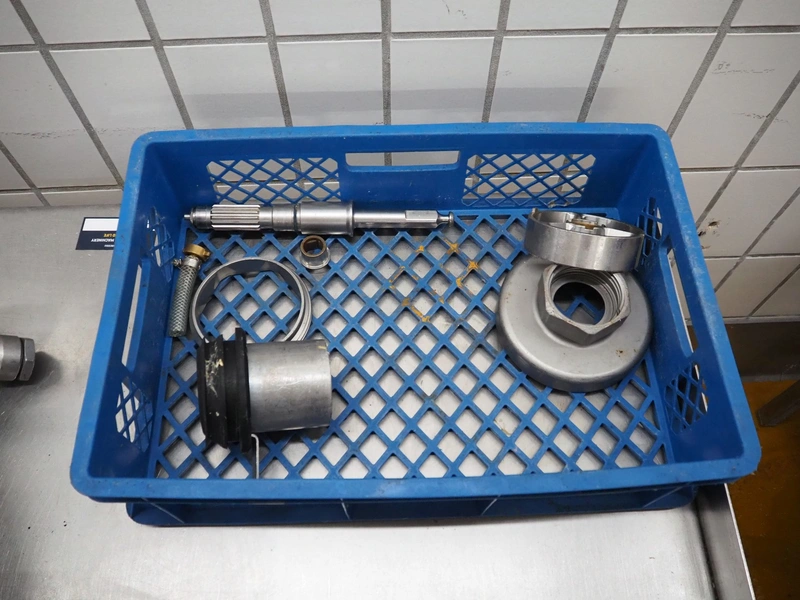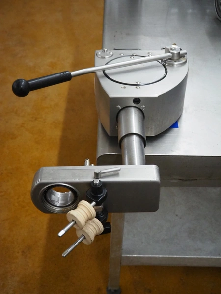 Handtmann inline grinding system and case holding device, type: 93-3, number: 14302079, plate diameter: 130 mm, total dimensions: 330 mm x 200 mm x 230 mm. Handtmann case holding device, type: 416, number: 16302375, year of construction: 2014, dimensions: 750 mm x 130 mm x 350 mm.