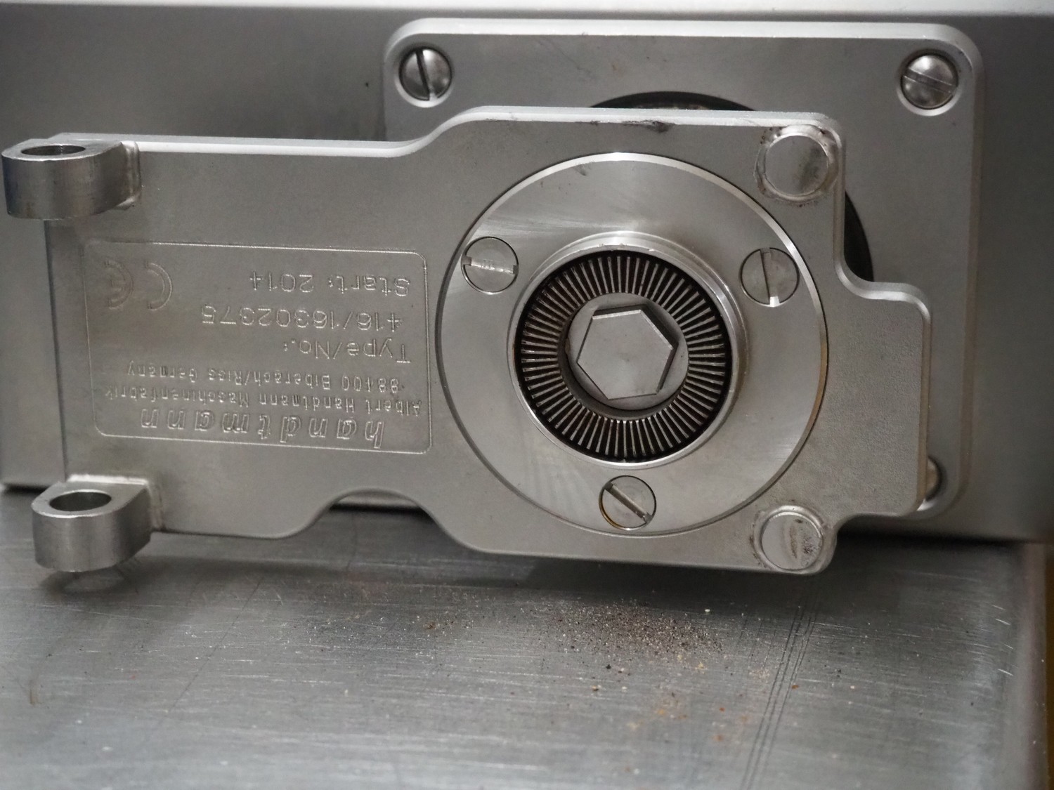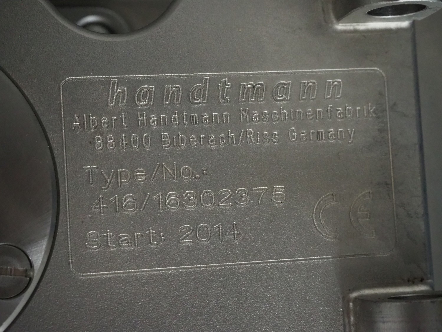 Handtmann inline grinding system and case holding device, type: 93-3, number: 14302079, plate diameter: 130 mm, total dimensions: 330 mm x 200 mm x 230 mm. Handtmann case holding device, type: 416, number: 16302375, year of construction: 2014, dimensions: 750 mm x 130 mm x 350 mm.