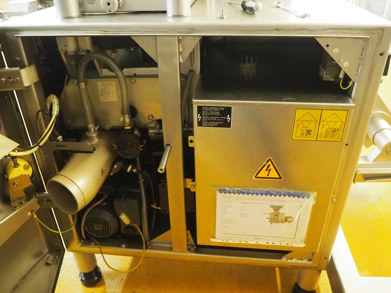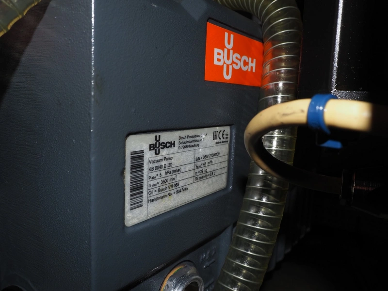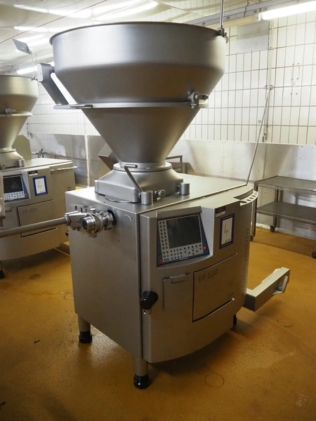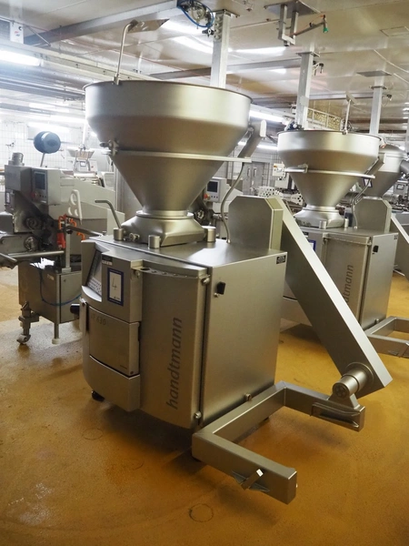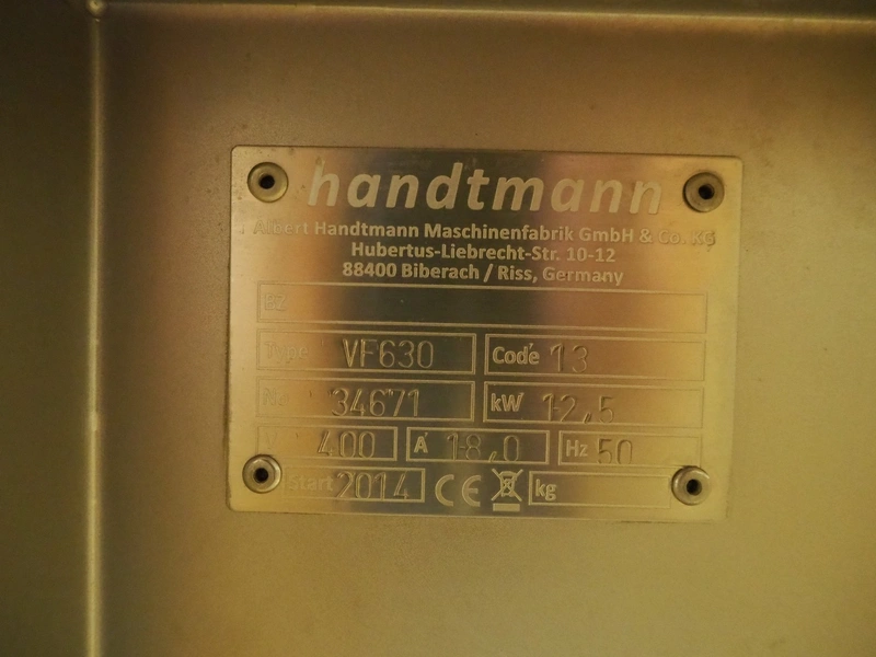 Handtmann vacuum filling machine with lifter for meat bins, type: VF630, number: 34671, year of construction: 2014, 400 V, 3 Ph, 50 Hz, 18.0 A, 12.5 kW, Busch vacuum pump, type: KB 0040 D IZO, serial number: DEM121500139, year of construction: 2021, capacity: 48 m³ per hour, dimensions: 2000 mm x 1400 mm x 2200 mm. Complete overhauled by Handtmann in 2022.