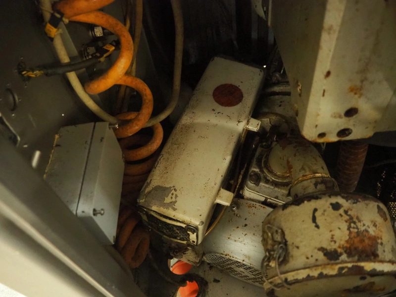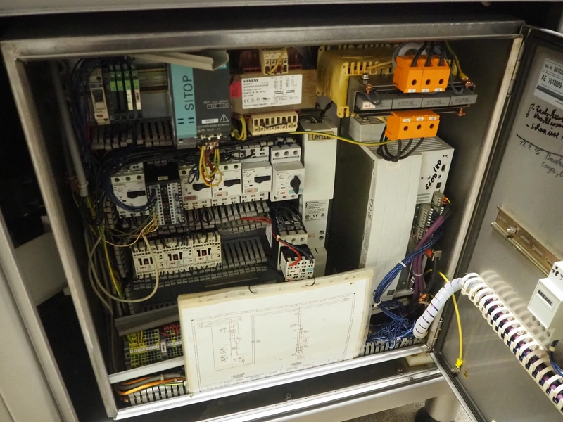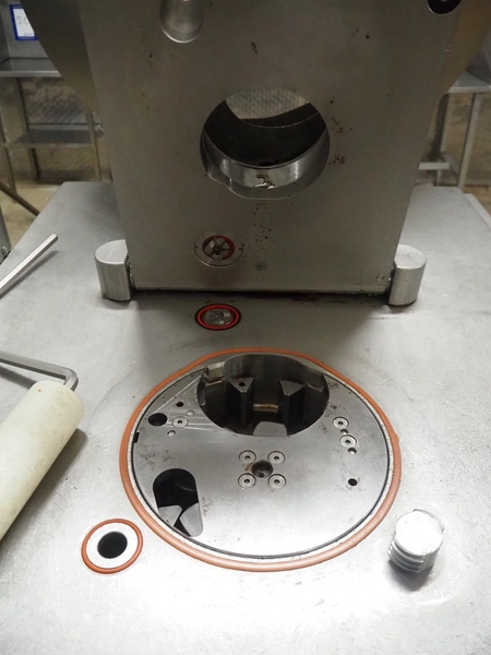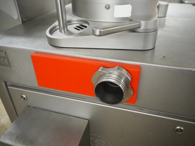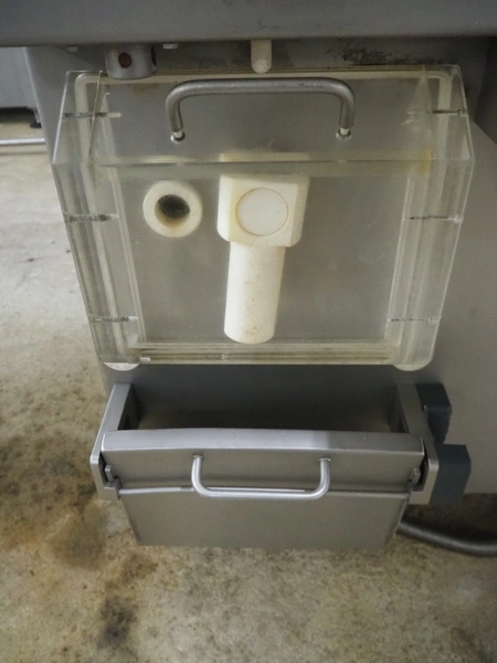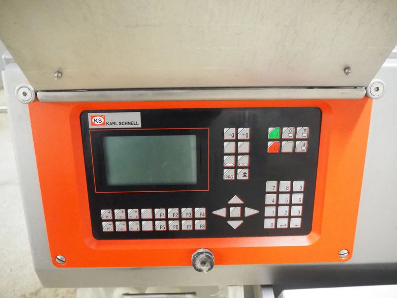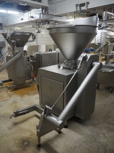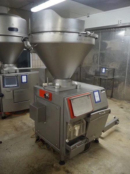 Karl Schnell vacuum filling machine with lifter for meat bins, type: P10SE, machine number: 21783, year of construction: 2005, 400 V, 3 Ph, 50 Hz, 22.6 A, 10.9 kW, dimensions: 1850 mm x 1350 mm x 2150 mm. Missing veins.