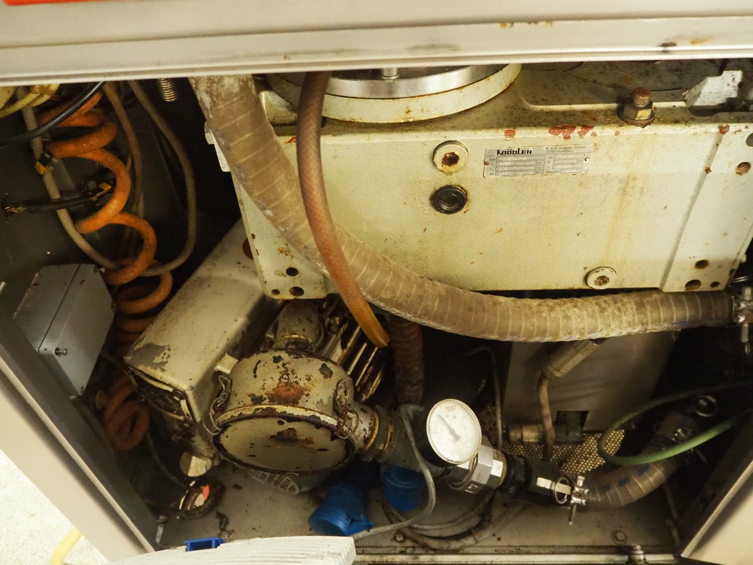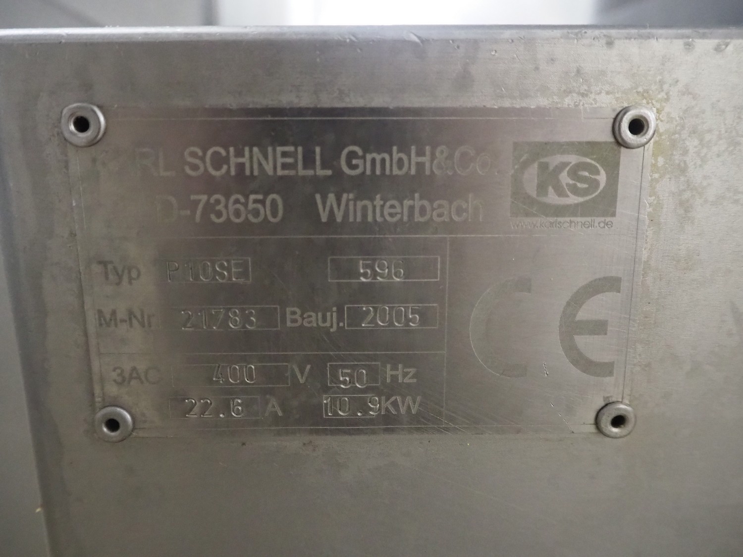 Karl Schnell vacuum filling machine with lifter for meat bins, type: P10SE, machine number: 21783, year of construction: 2005, 400 V, 3 Ph, 50 Hz, 22.6 A, 10.9 kW, dimensions: 1850 mm x 1350 mm x 2150 mm. Missing veins.