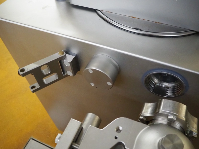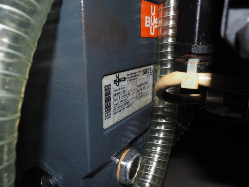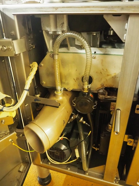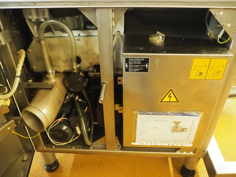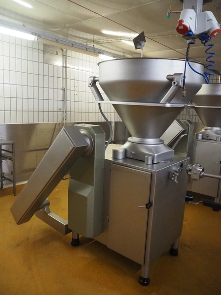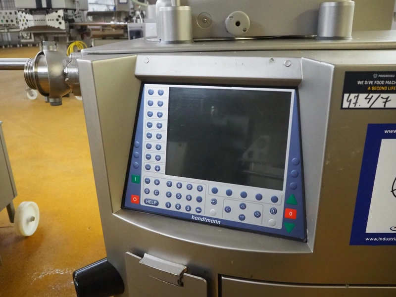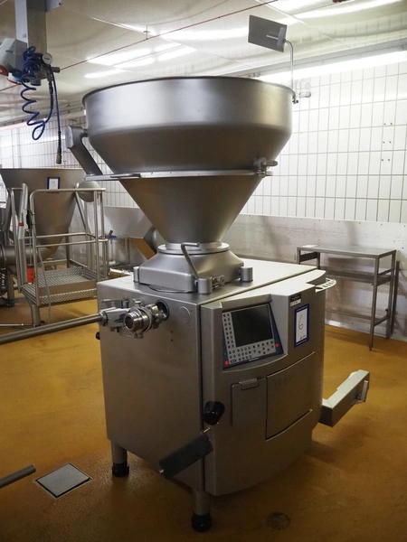 Handtmann vacuum filling machine with lifter for meat bins, type: VF630, number: 28079, year of construction: 2010, 400 V, 50 Hz, 18.0 A, 12.5 kW, Busch vacuum pump, type: KB 0040 D IZO, serial number: DEM122060546, year of construction: 2002, capacity: 48 m³ per hour, dimensions: 2000 mm x 1400 mm x 2200 mm. Complete overhauled by Handtmann in 2022.
