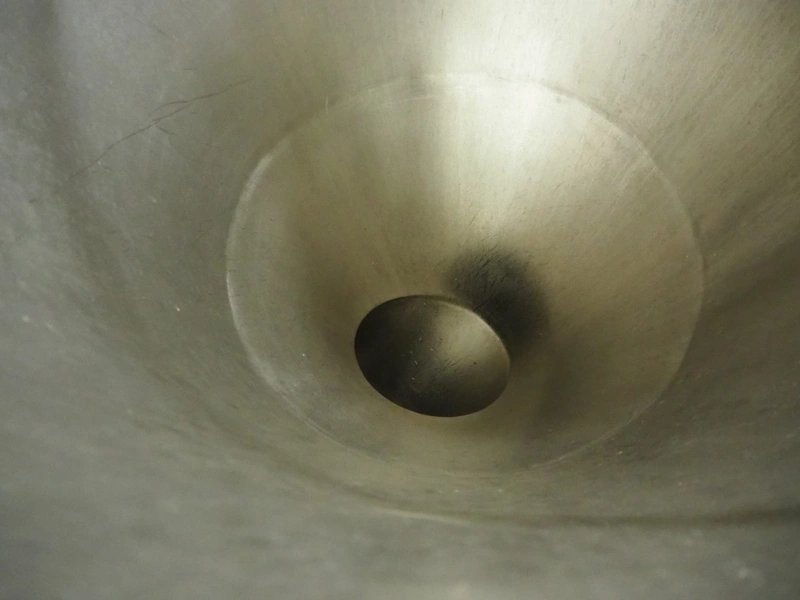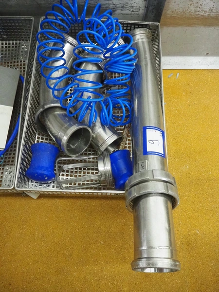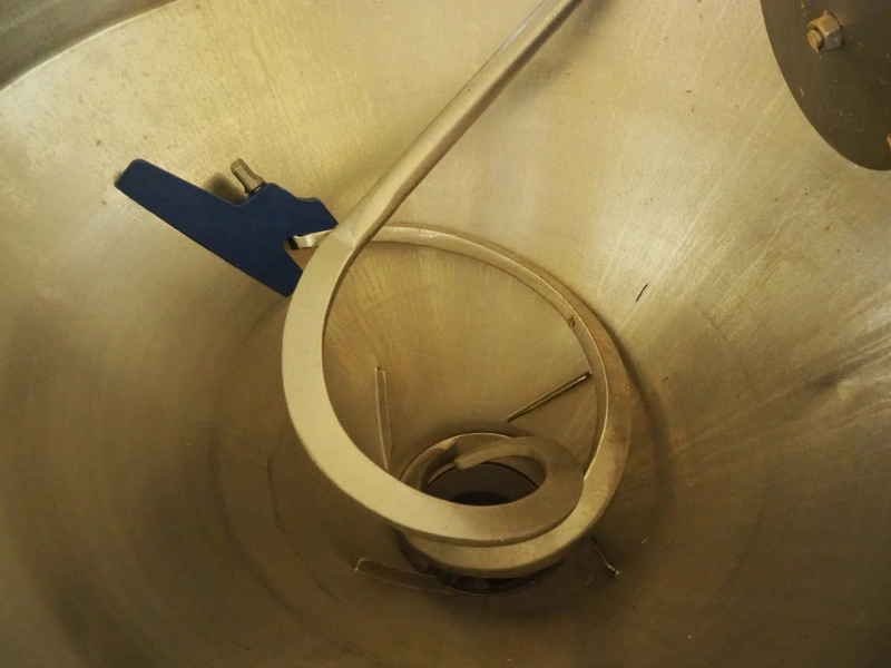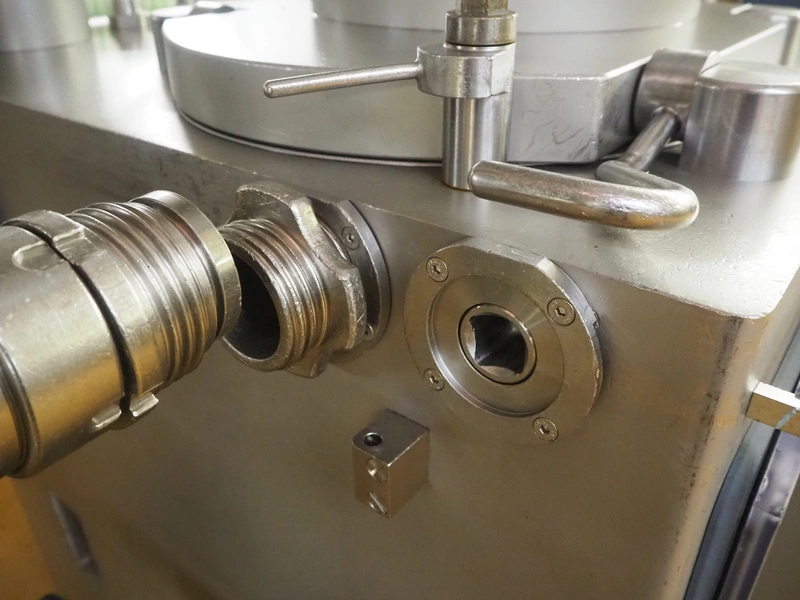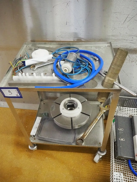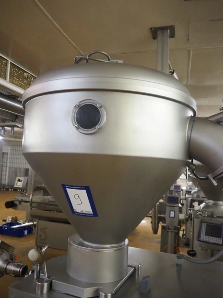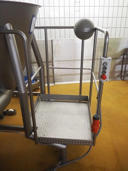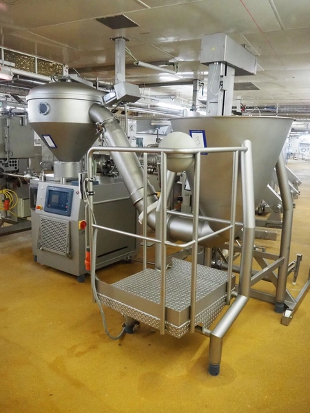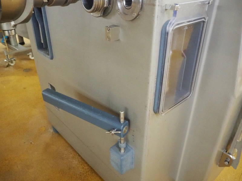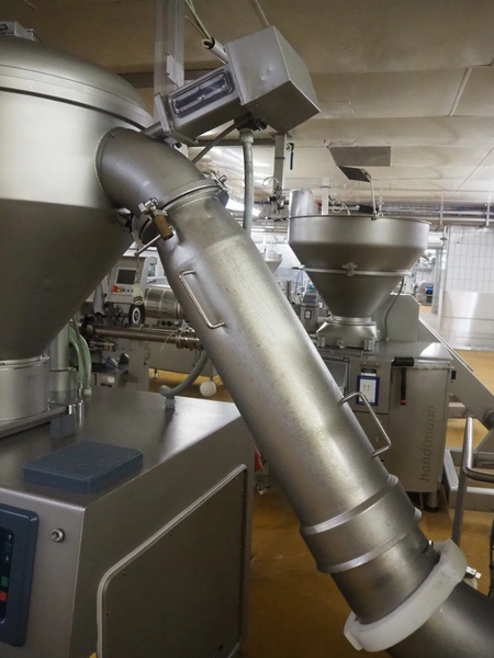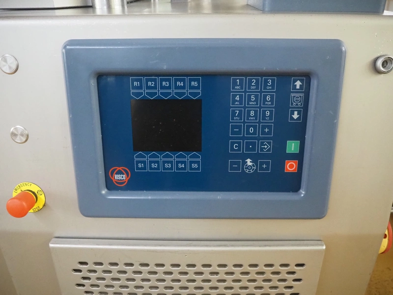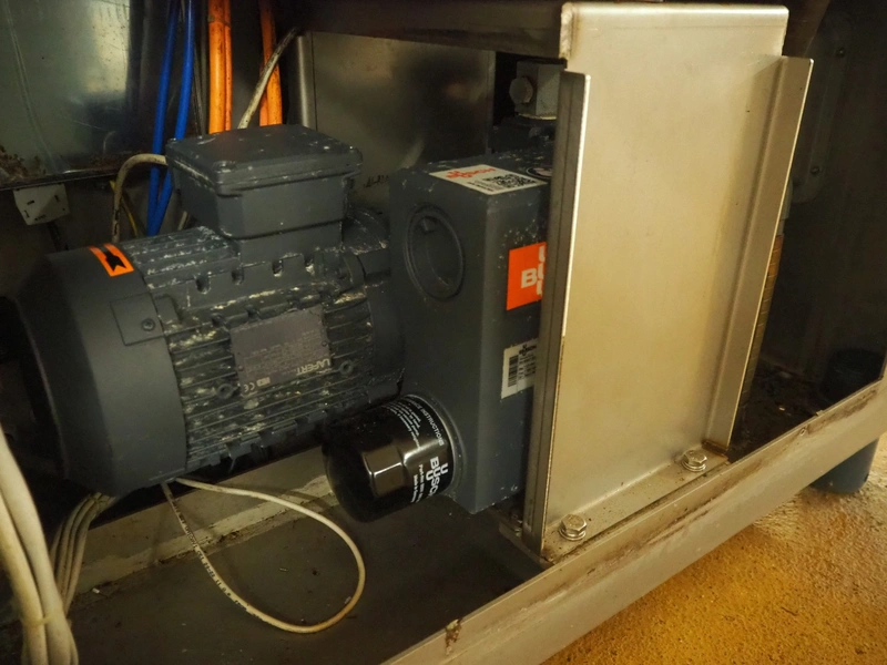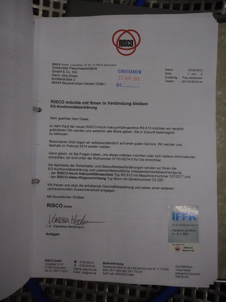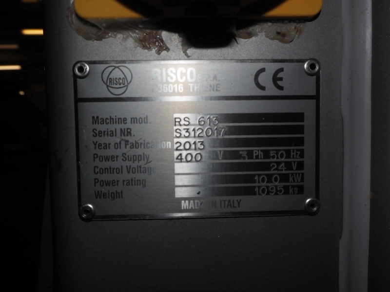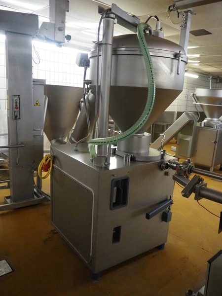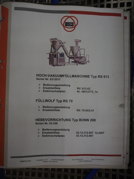 Risco S.P.A. high vacuum filling machine with infeed hopper, machine model: RS 613, serial number: S312017, year of construction: 2013, 400 V, 3 Ph, 50 Hz, 10.0 kW, Busch vacuum pump, type: RA 0040 F 503, number: 080080500, capacity: 48 m³ per hour, weight: 1095 kg, dimensions vacuum filler: 1100 mm x 1600 mm x 2500 mm, including infeed hopper, dimensions hopper: 2000 mm x 1700 mm x 1800 mm.