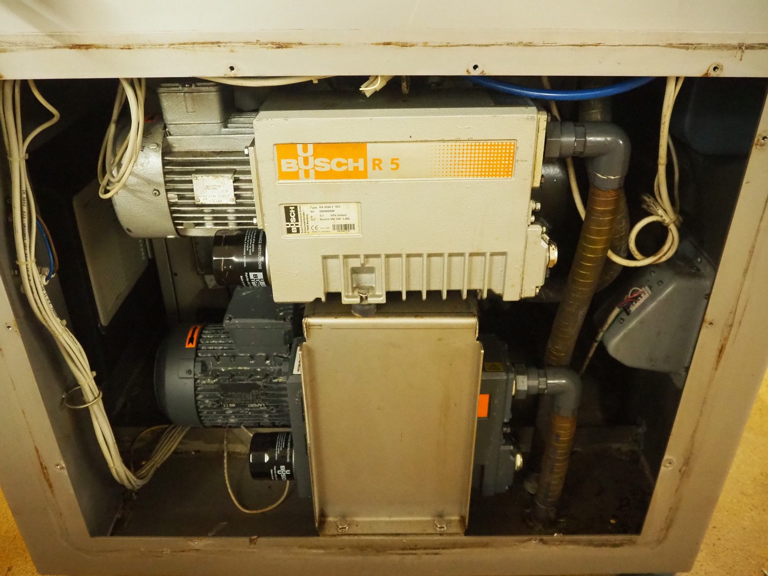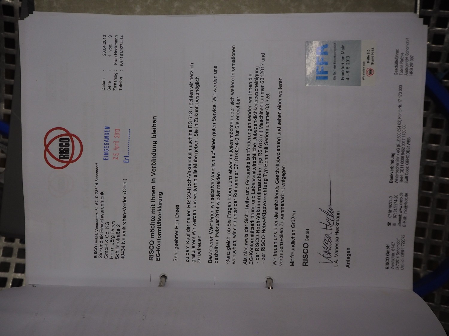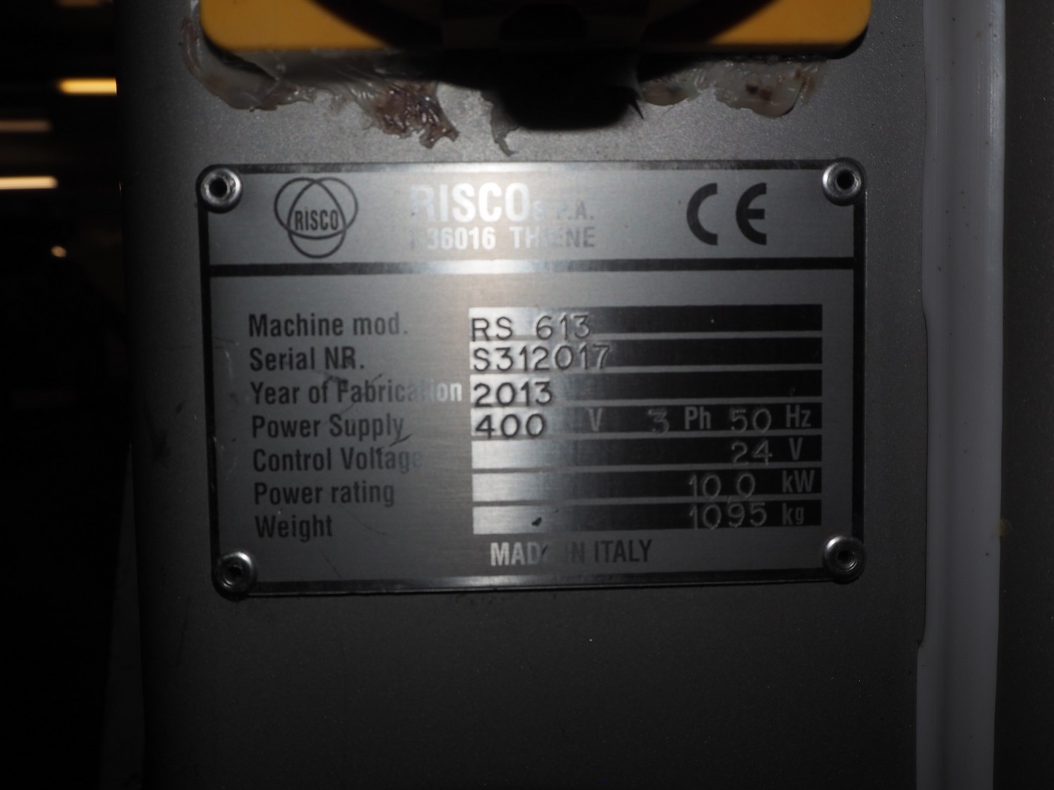 Risco S.P.A. high vacuum filling machine with infeed hopper, machine model: RS 613, serial number: S312017, year of construction: 2013, 400 V, 3 Ph, 50 Hz, 10.0 kW, Busch vacuum pump, type: RA 0040 F 503, number: 080080500, capacity: 48 m³ per hour, weight: 1095 kg, dimensions vacuum filler: 1100 mm x 1600 mm x 2500 mm, including infeed hopper, dimensions hopper: 2000 mm x 1700 mm x 1800 mm.