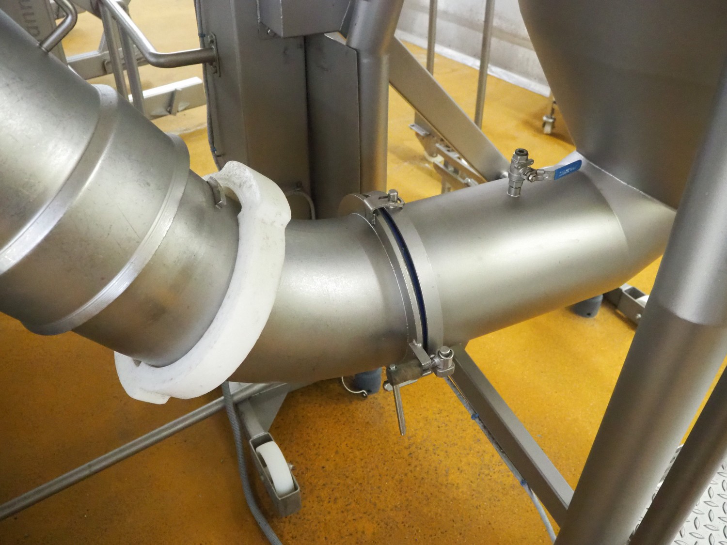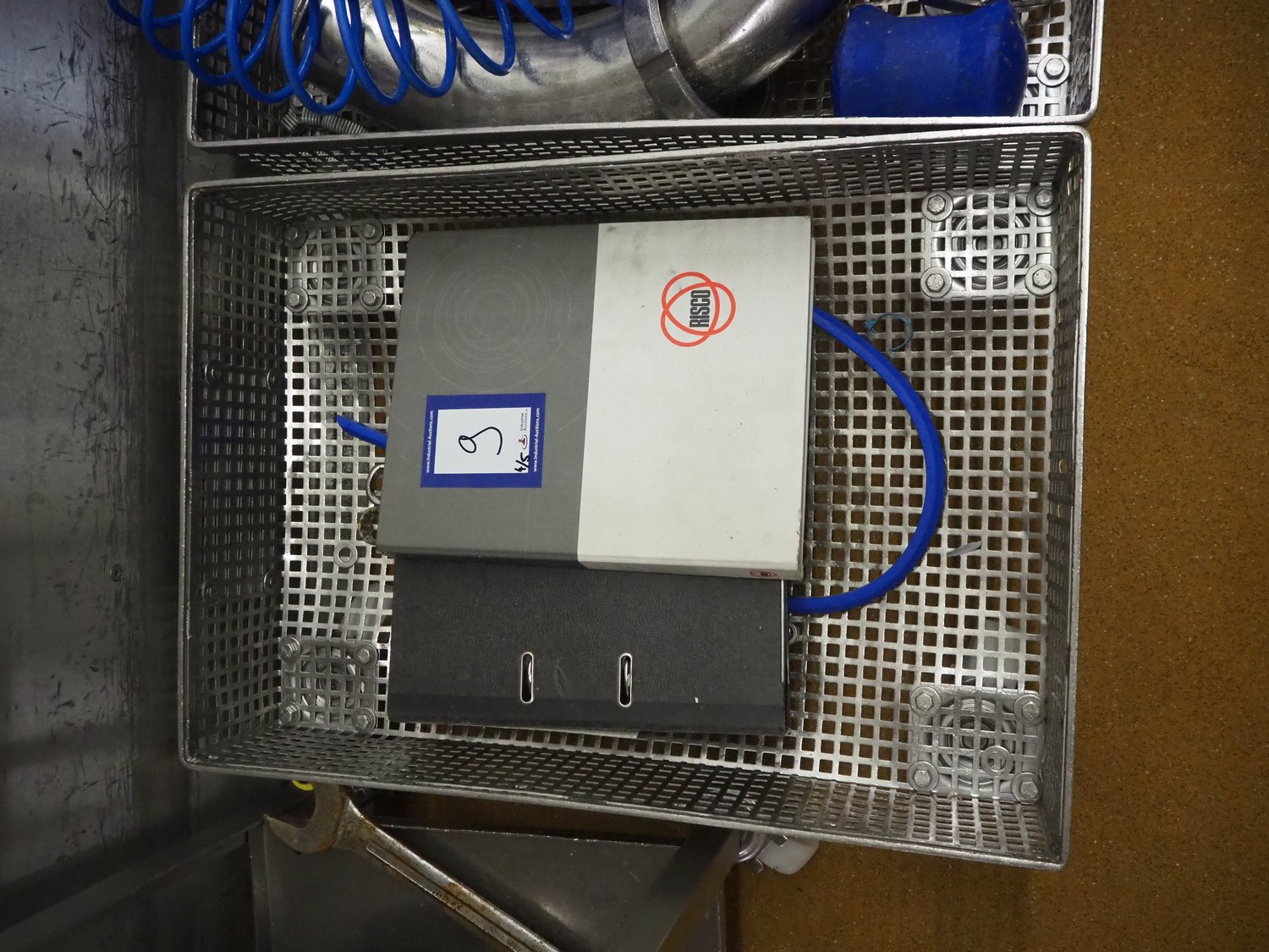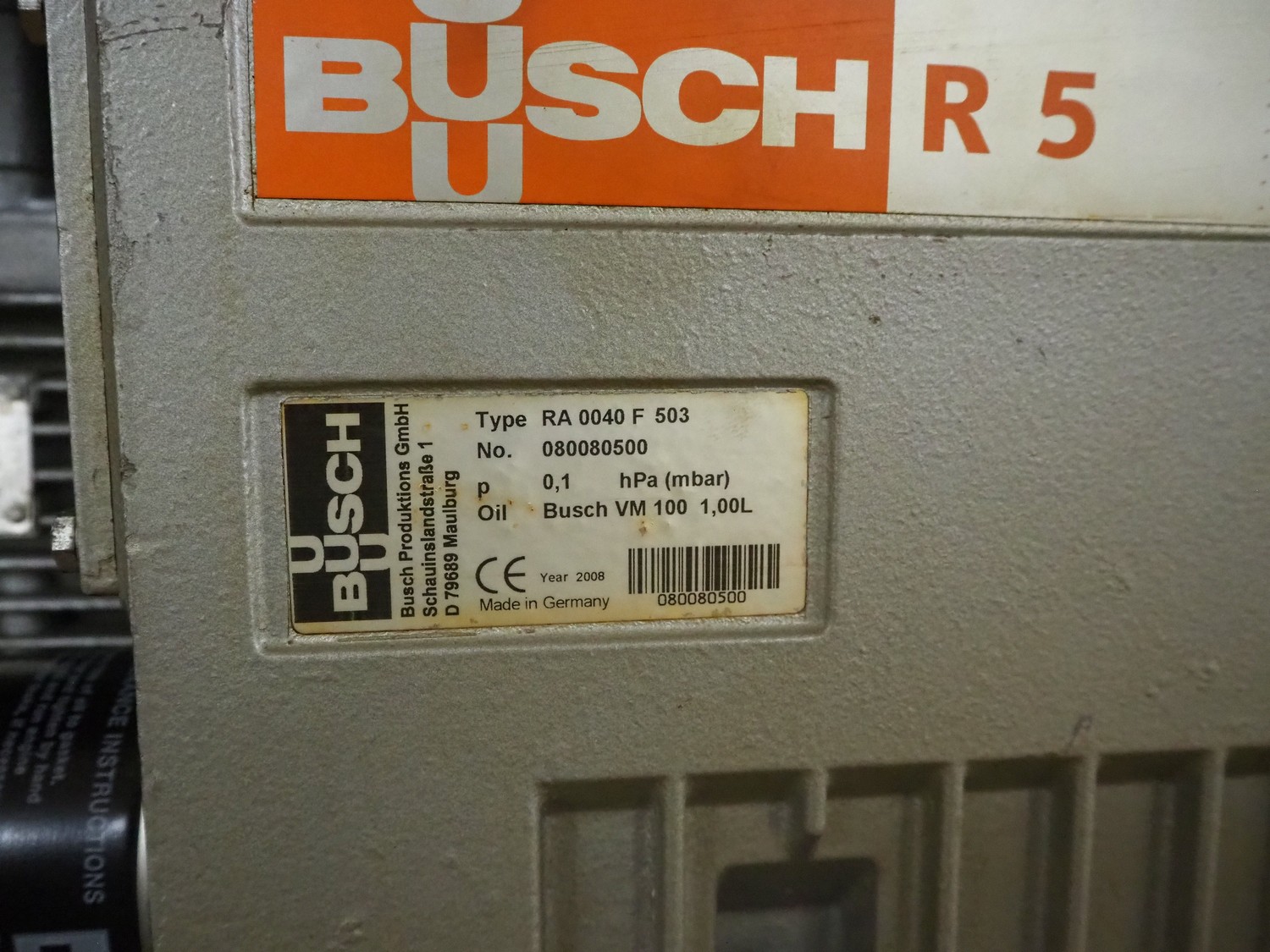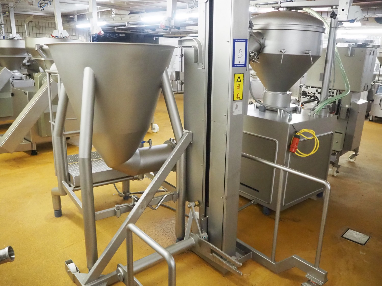 Risco S.P.A. high vacuum filling machine with infeed hopper, machine model: RS 613, serial number: S312017, year of construction: 2013, 400 V, 3 Ph, 50 Hz, 10.0 kW, Busch vacuum pump, type: RA 0040 F 503, number: 080080500, capacity: 48 m³ per hour, weight: 1095 kg, dimensions vacuum filler: 1100 mm x 1600 mm x 2500 mm, including infeed hopper, dimensions hopper: 2000 mm x 1700 mm x 1800 mm.