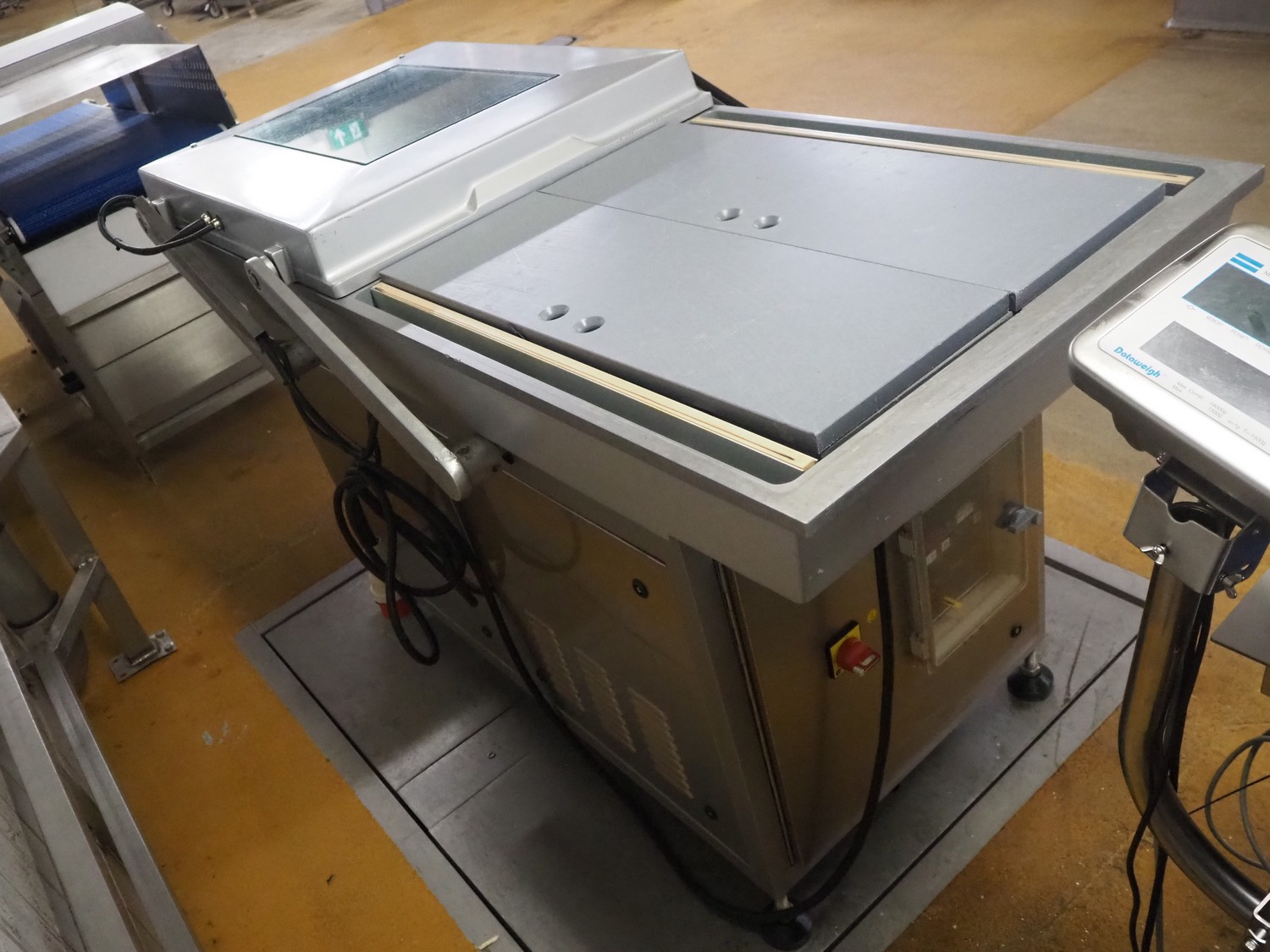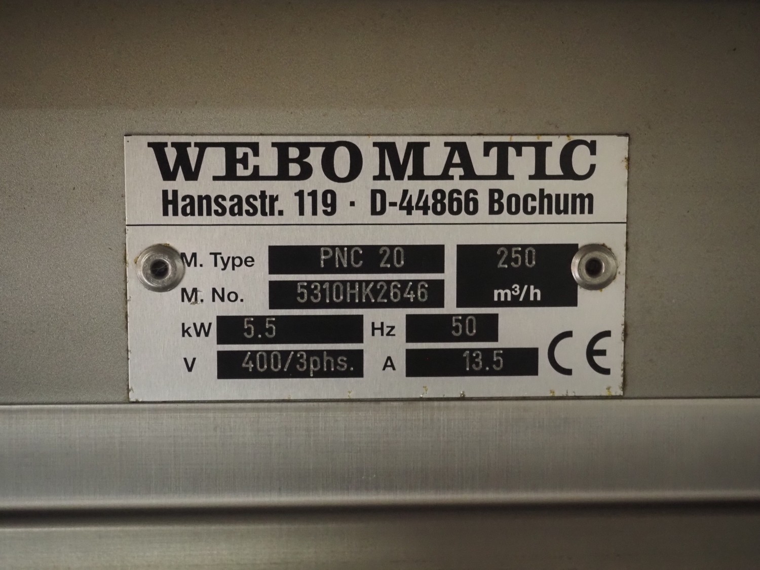 Webomatic double chamber vacuum machine, type: PNC 20, machine number: 5310HK2646, 400 V, 3 Ph, 50 Hz, 13.5 A, 5.5 kW, Busch vacuum pump, type: RA 0250 C 4ZI CUZZ, number: 0E02610201, capacity: 250 m³ per hour, seal length: (2x) 820 mm, dimensions chamber: 850 mm x 710 mm, total dimensions: 1900 mm x 900 mm x 1100 mm.