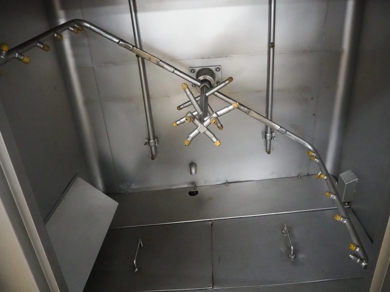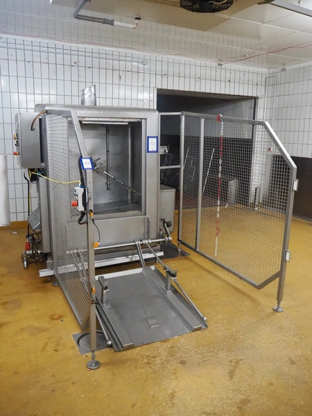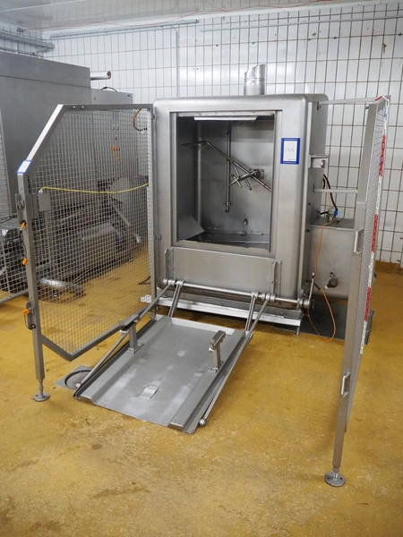 Nieros meat bin washer with safety fence, type: Cleanmaster 200/CL200 Disp/4530-053, serial number: N3 M 11 001, year of construction: 2001, 400 V, 50 Hz, dimensions: 2900 mm x 2100 mm x 2400 mm.