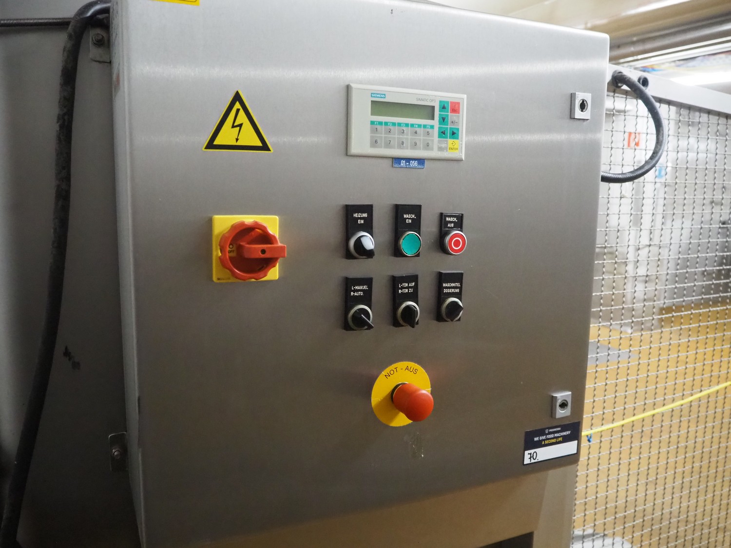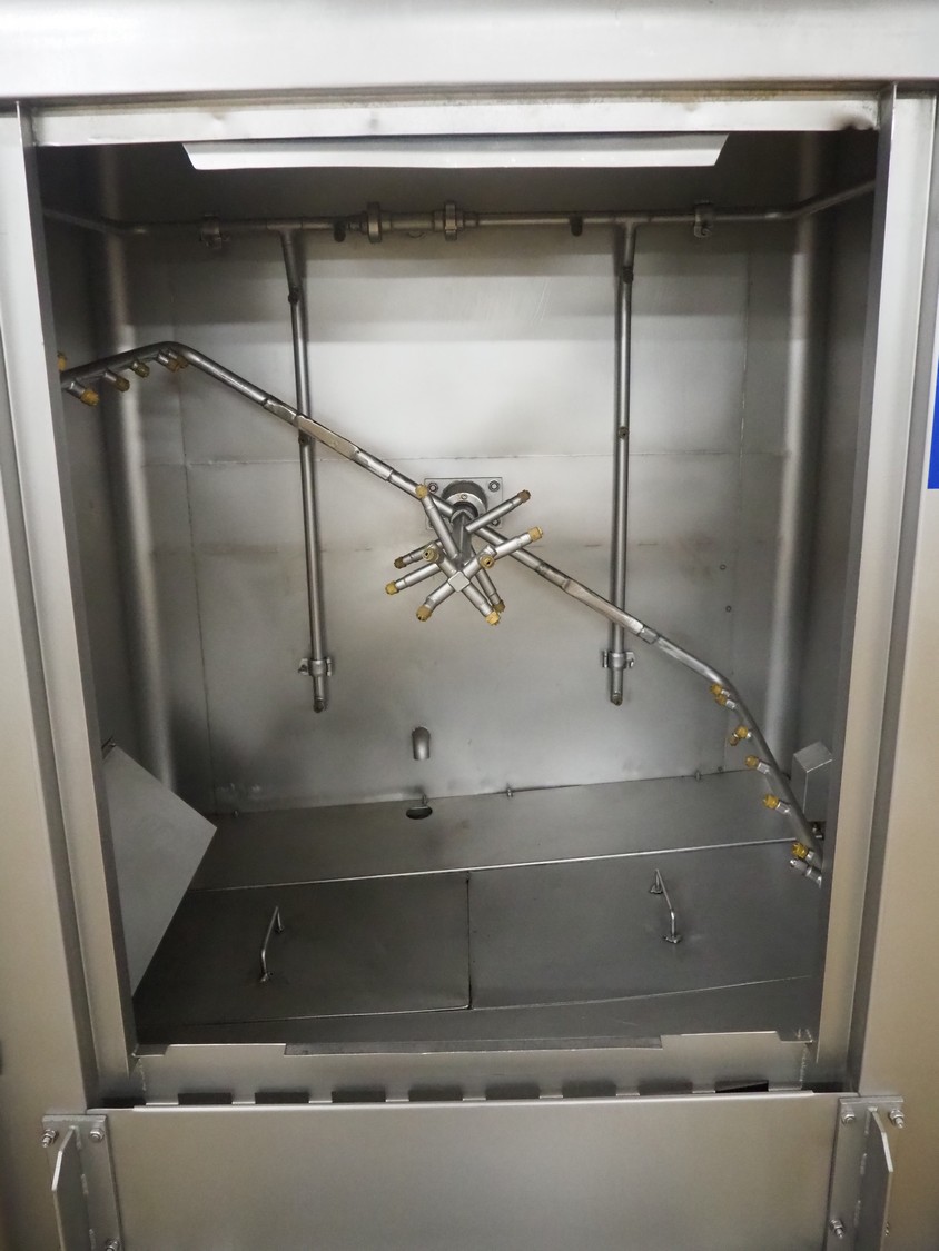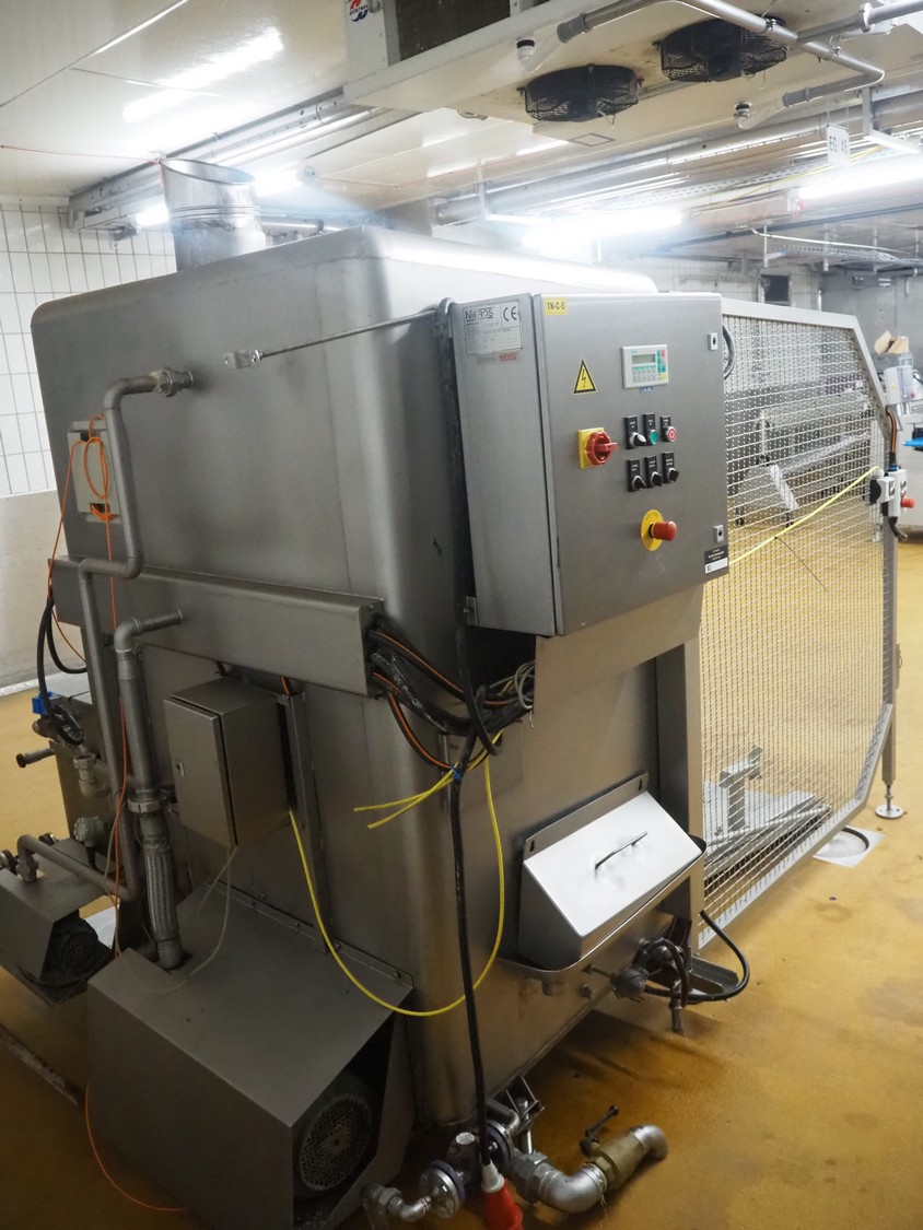 Nieros meat bin washer with safety fence, type: Cleanmaster 200/CL200 Disp/4530-053, serial number: N3 M 11 001, year of construction: 2001, 400 V, 50 Hz, dimensions: 2900 mm x 2100 mm x 2400 mm.