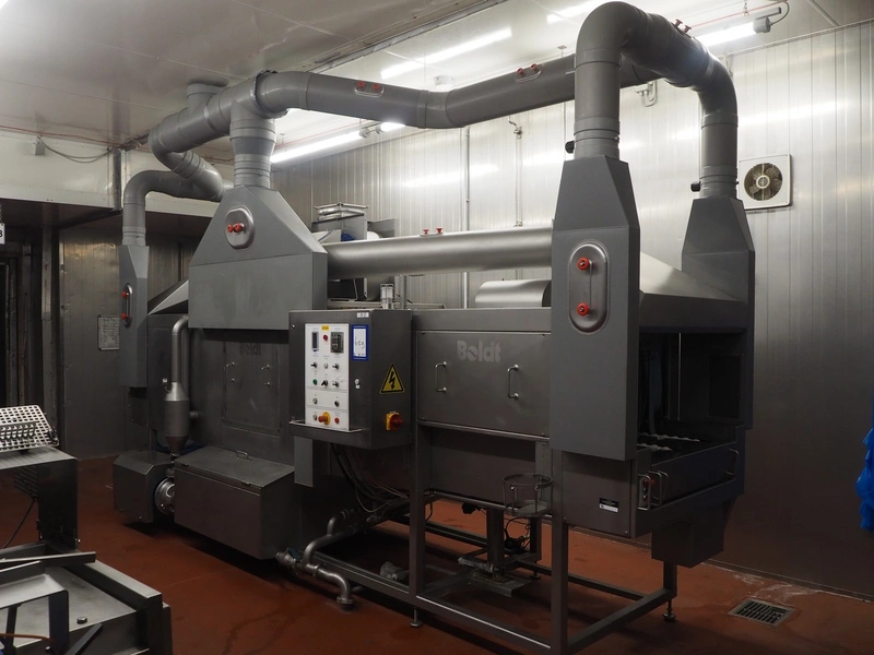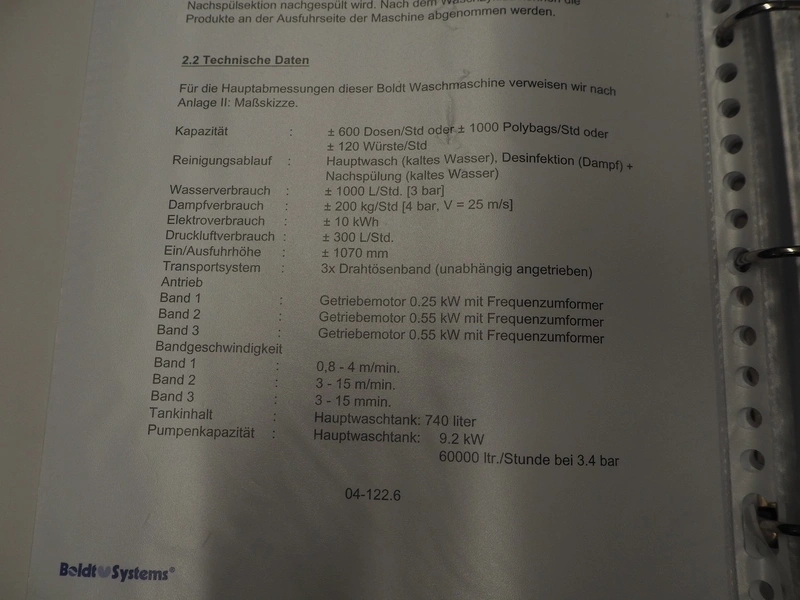 Boldt Systems washing machine for crates, buckets, lids and pallets, model: WSD 360, serial number: BWO 98-091, year of construction: 1989, suitable for the following emballage, plastic buckets, dimensions: Ø 230 mm x 215 mm, Ø 265 mm x 290 mm, Ø 325 mm x 330 mm and Ø 365 mm x 410 mm, plastic lids, dimensions: max Ø 375 mm x 25 mm, plastic crates, dimensions: 550 mm x 390 mm x 300 mm and plastic pallets, dimensions: 1200 mm x 800 mm x 155/170 mm, clearance: 840 mm x 400 mm, total dimensions: 5700 mm x 1800 mm x 2750 mm.