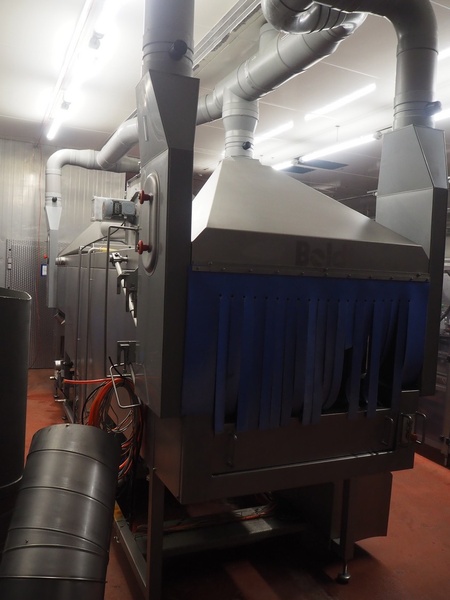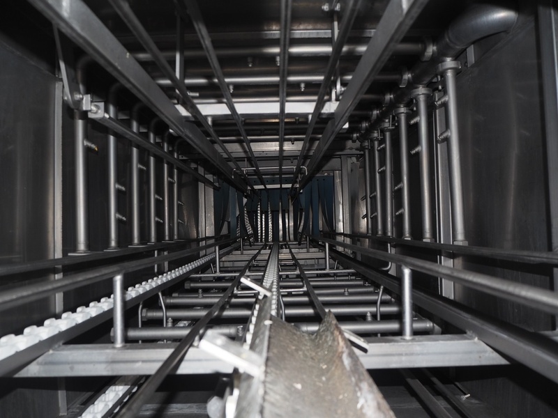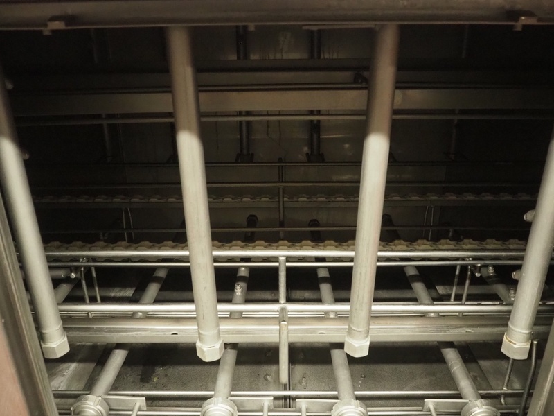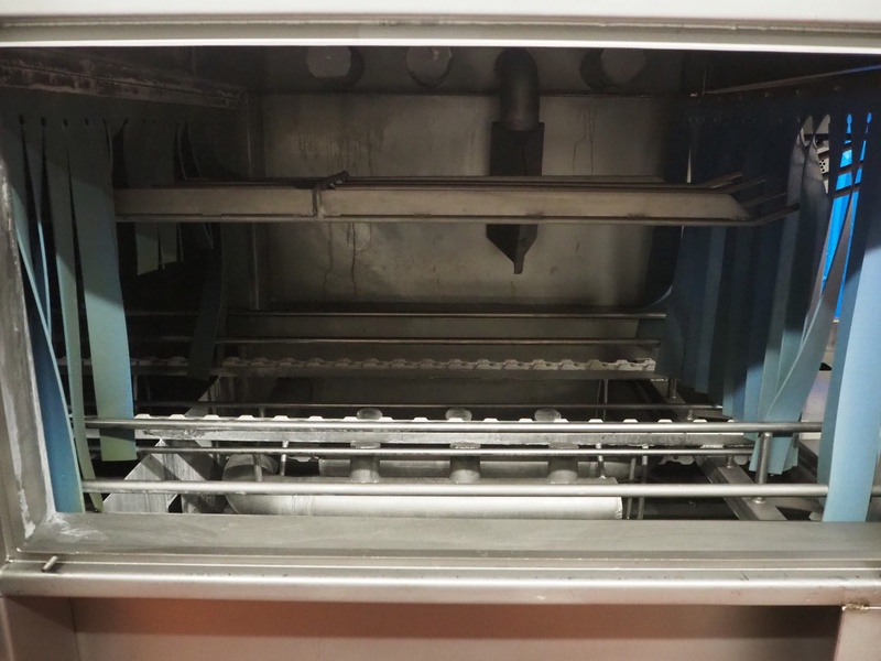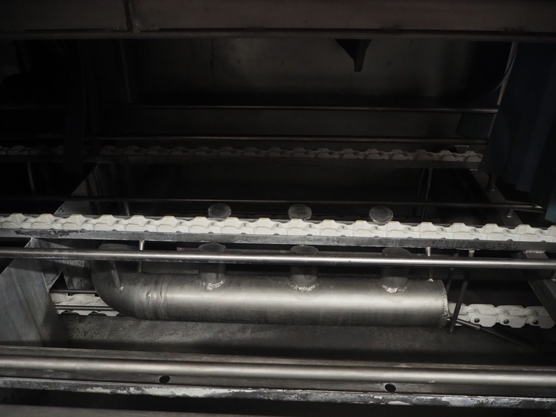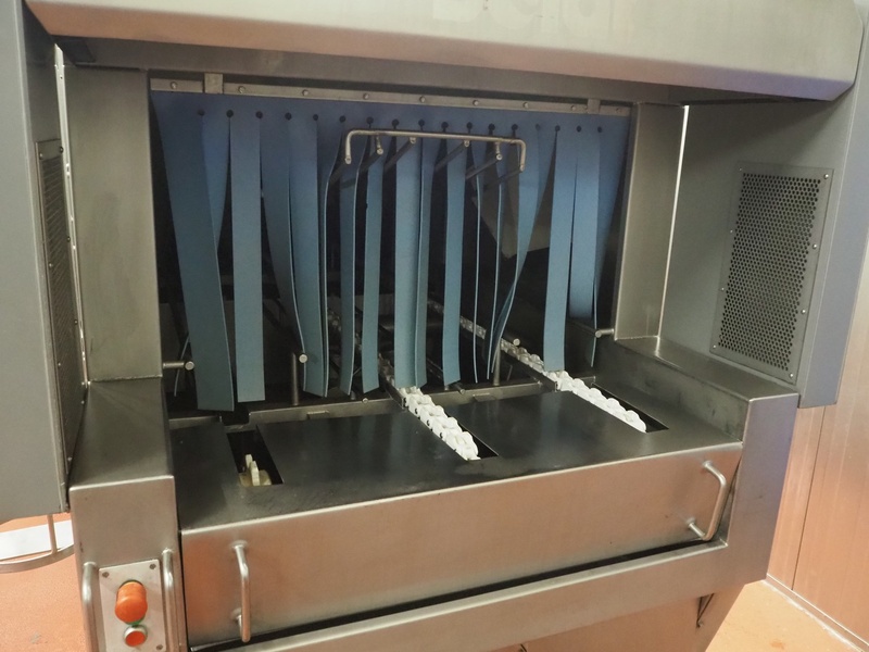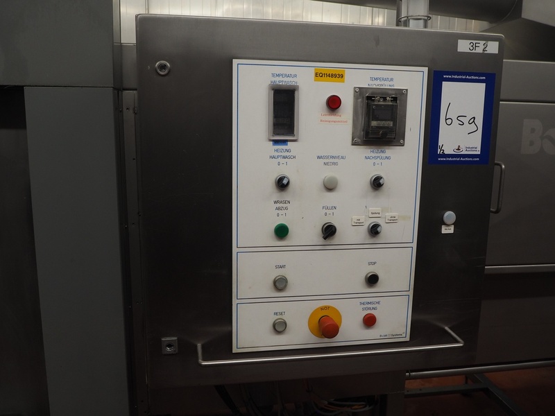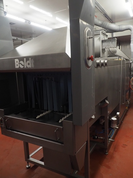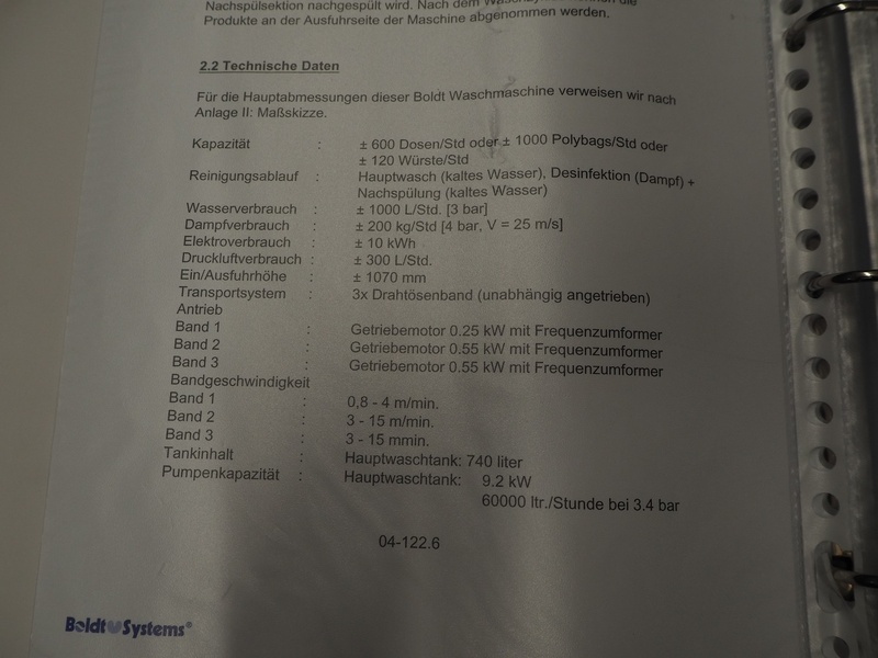 Boldt Systems washing machine for crates, buckets, lids and pallets, model: WSD 360, serial number: BWO 98-091, year of construction: 1989, suitable for the following emballage, plastic buckets, dimensions: Ø 230 mm x 215 mm, Ø 265 mm x 290 mm, Ø 325 mm x 330 mm and Ø 365 mm x 410 mm, plastic lids, dimensions: max Ø 375 mm x 25 mm, plastic crates, dimensions: 550 mm x 390 mm x 300 mm and plastic pallets, dimensions: 1200 mm x 800 mm x 155/170 mm, clearance: 840 mm x 400 mm, total dimensions: 5700 mm x 1800 mm x 2750 mm.