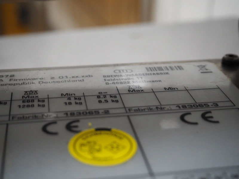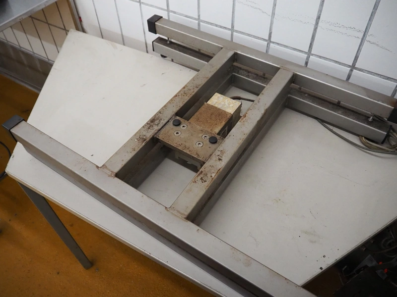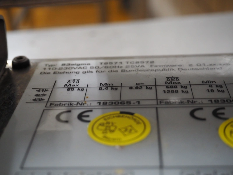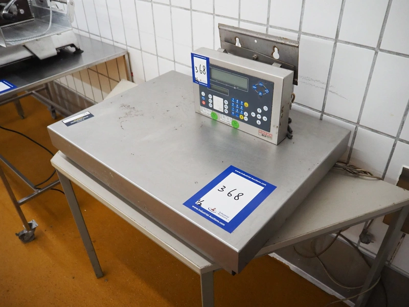 Rhewa weighing scale with indicator, type: 83sigma, number: 183065-1, maximum: 60 kg, minimum: 0.4 kg, e= 0.02 kg, scale dimensions: 800 mm x 600 mm, indicator dimensions: 330 mm x 170 mm x 290 mm.