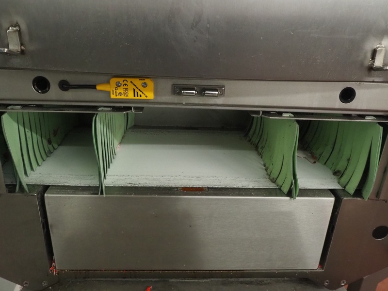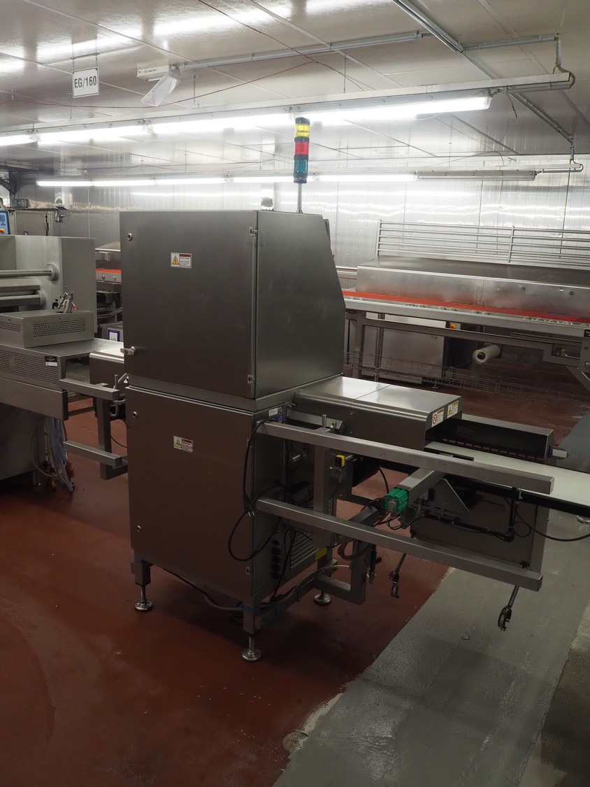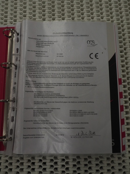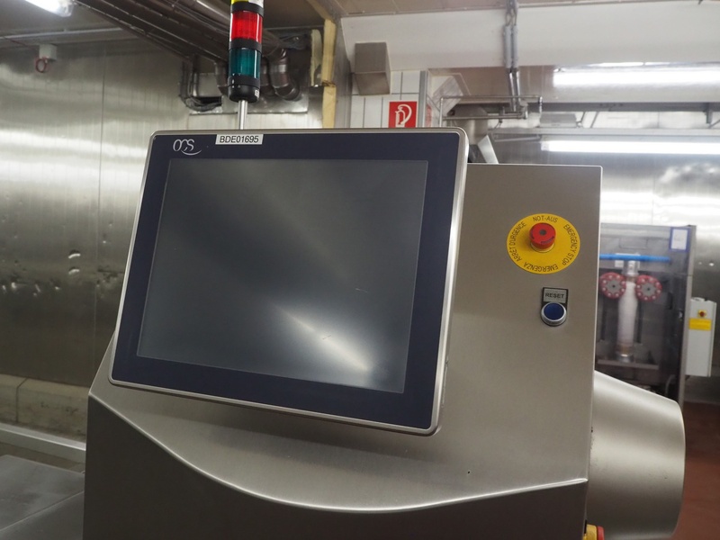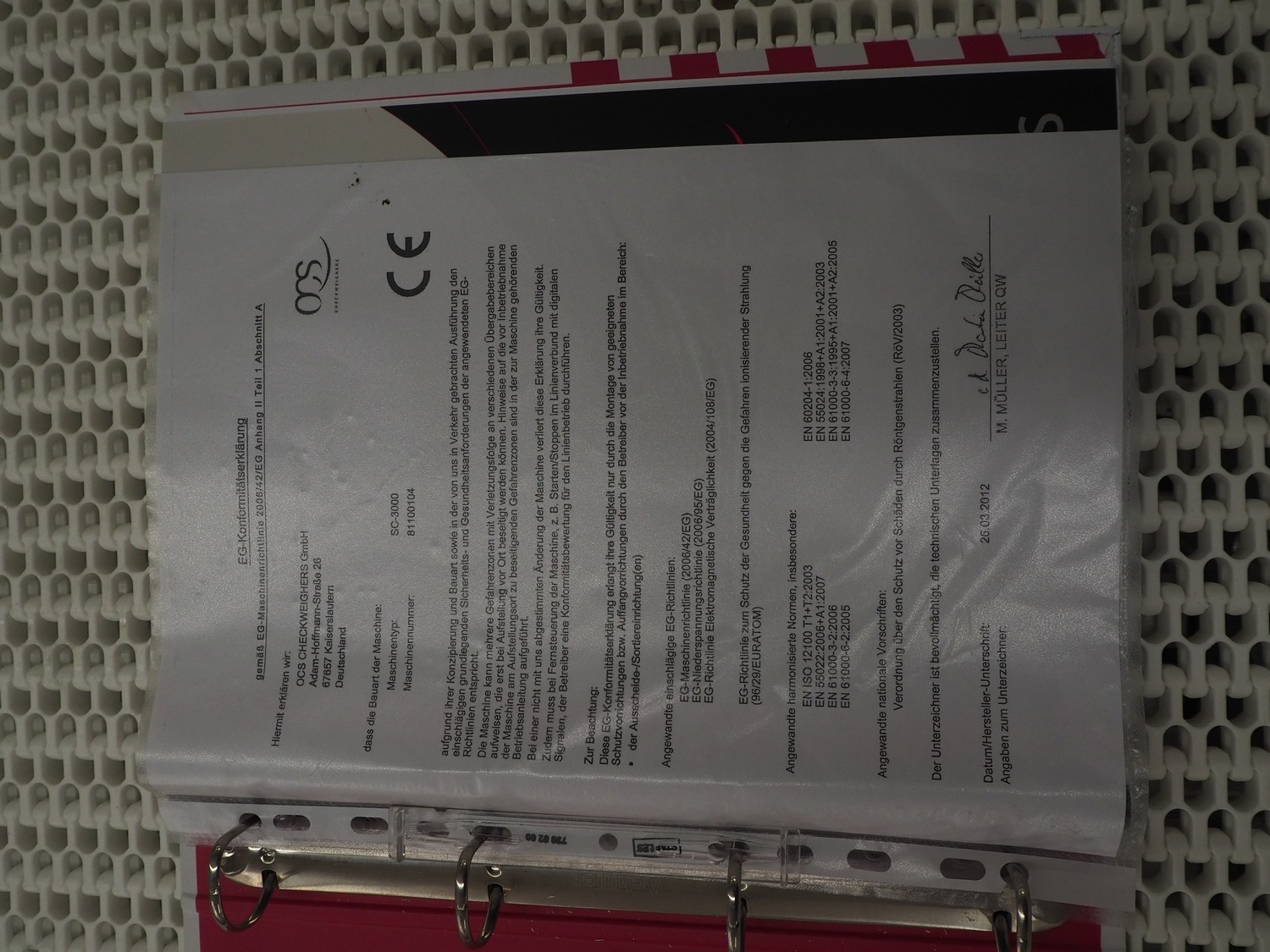 OCS X-ray scanner with rejecter, serial number: 1100104, year of construction: 2012, 230 V, 50 Hz, operating hours: 29291.8, plastic belt, belt width: 295 mm, total dimensions: 2500 mm x 950 mm x 2050 mm.