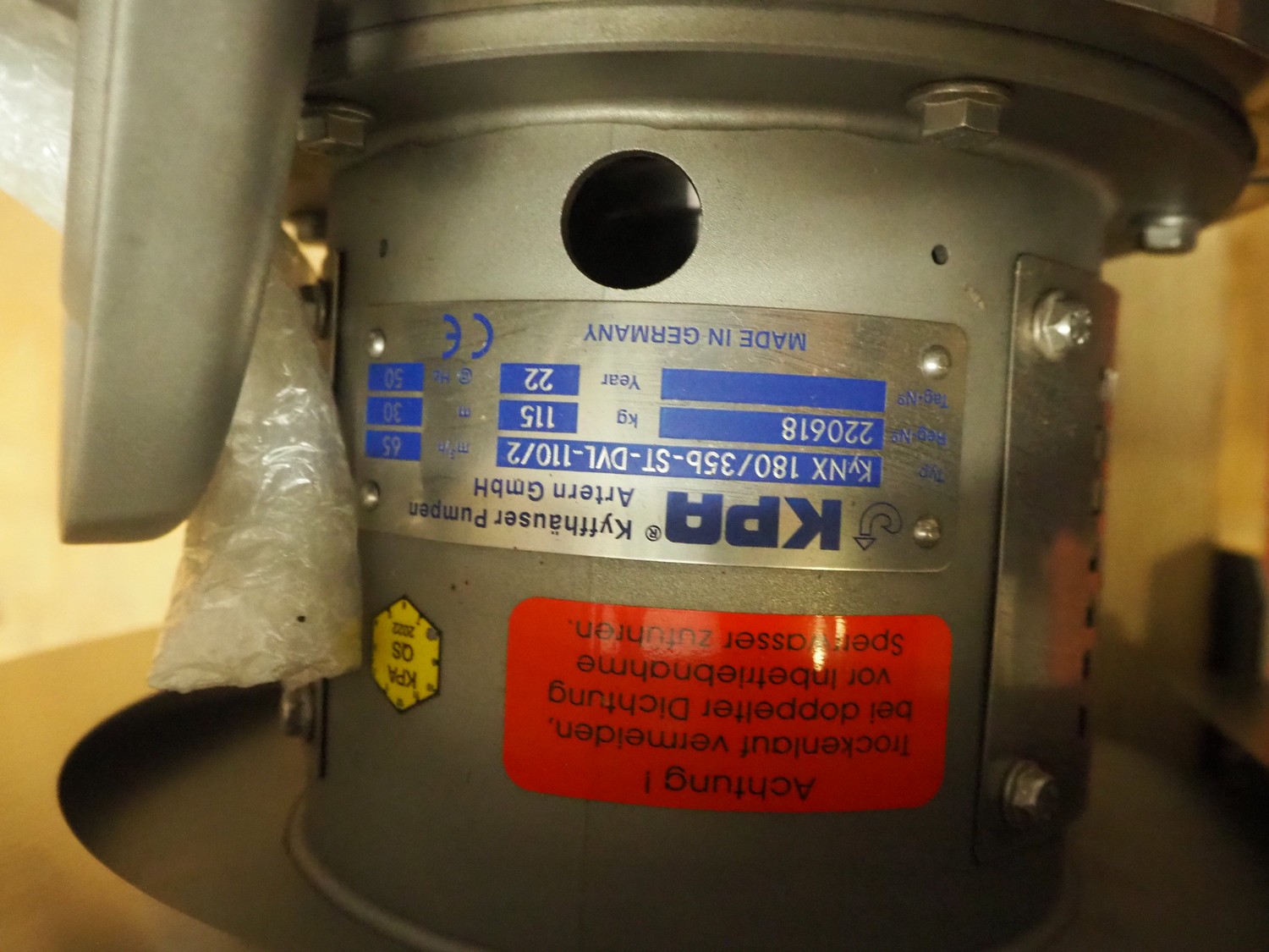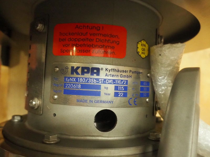 KPA Kyffhäuser Pumpen Artern GmbH centrifugal pump, type: KyNX 180/35b-ST-DVL-110/2, registration number: 220618, year of construction: 2022, 50 Hz, capacity: 65 m³/ hour, dimensions: 8520 mm x 450 mm x 500 mm.