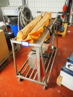 S/s trolley with safety equipment, consisting of: bag with stretcher, fire extinguisher, and fire blanket, dimensions: 1250 mm x 60…0 bidsLot is closed