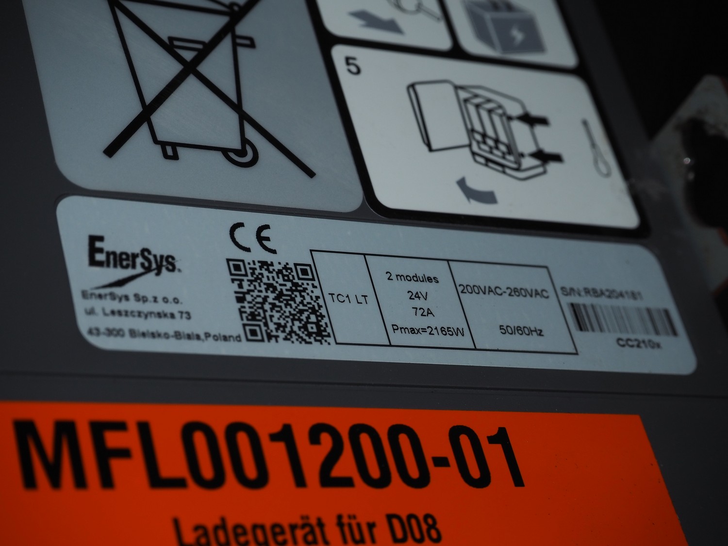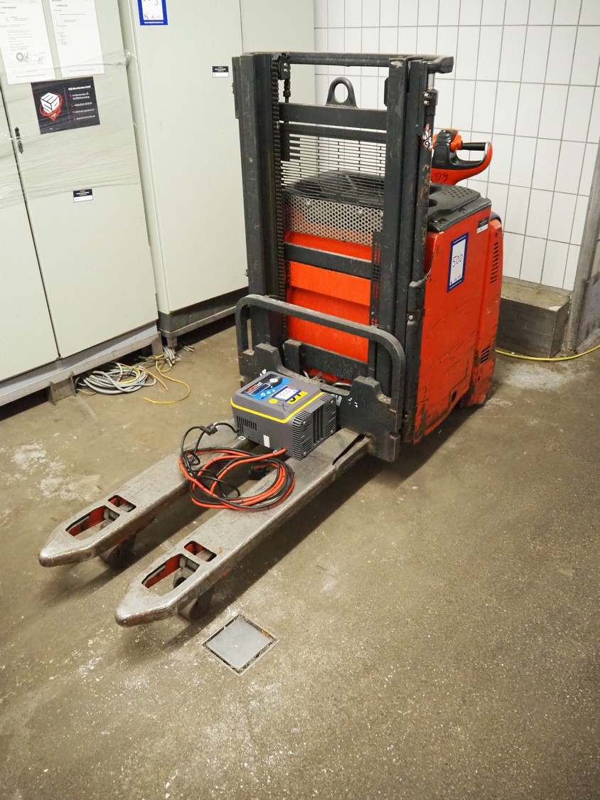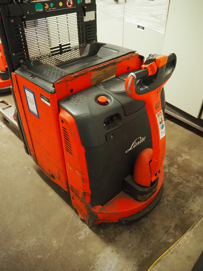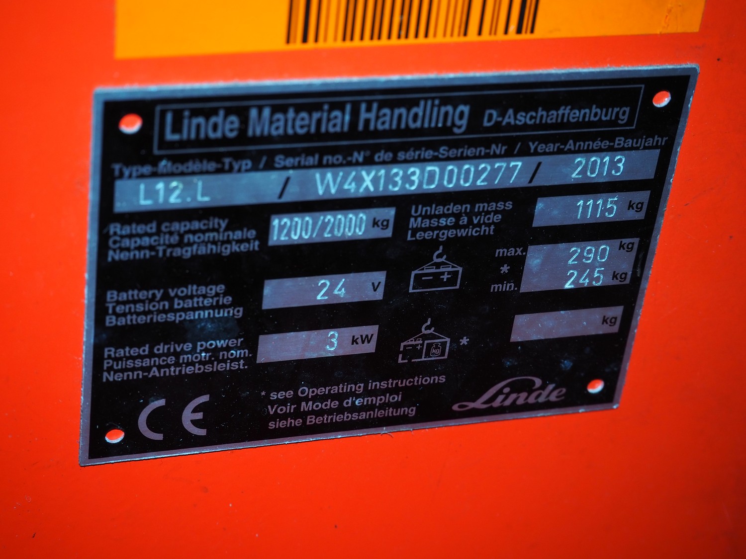 Linde Material Handling electric pallet lifter, type: L12.L, serial number: W4X133D00277, year of construction: 2013, 24 V, 3 kW, rated capacity: 1200/2000 kg, fork length: (2x) 1150 mm, distance between forks: 200 mm, fork width: 560 mm, lifting height: 2010 mm, total dimensions: 2300 mm x 800 mm x 1450 mm. Including Life Tech battery charger, type: CC210, serial number: RBA204181, 200/260 V, 50/60 Hz, 72 A, Pmax= 2165 W.