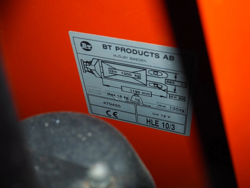 BT Products AB electric pallet lifter, model: HLE 10/3, number: 479495, capacity: 1000 kg, fork width: 560 mm, fork length: 1190 mm, total dimensions: 1680 mm x 560 mm x 1300 mm.