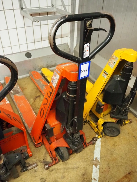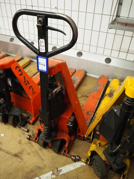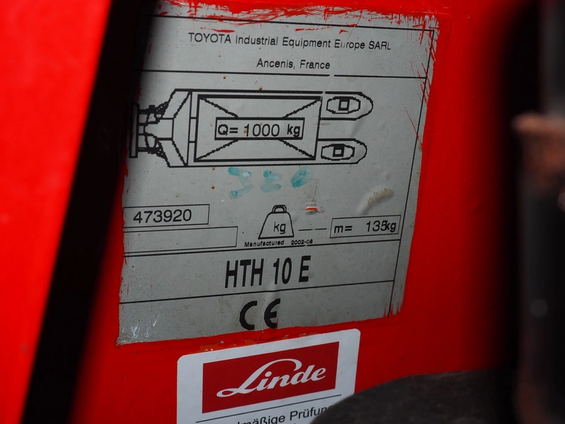 Toyota electric pallet lifter, model: HTH 10 E, serial number: 473920, year of construction: 2002-06, maximum capacity: 1000 kg, fork length: 1190 mm, fork width: 560 mm, weight: 135 kg, total dimensions: 1700 mm x 560 mm x 1270 mm.
