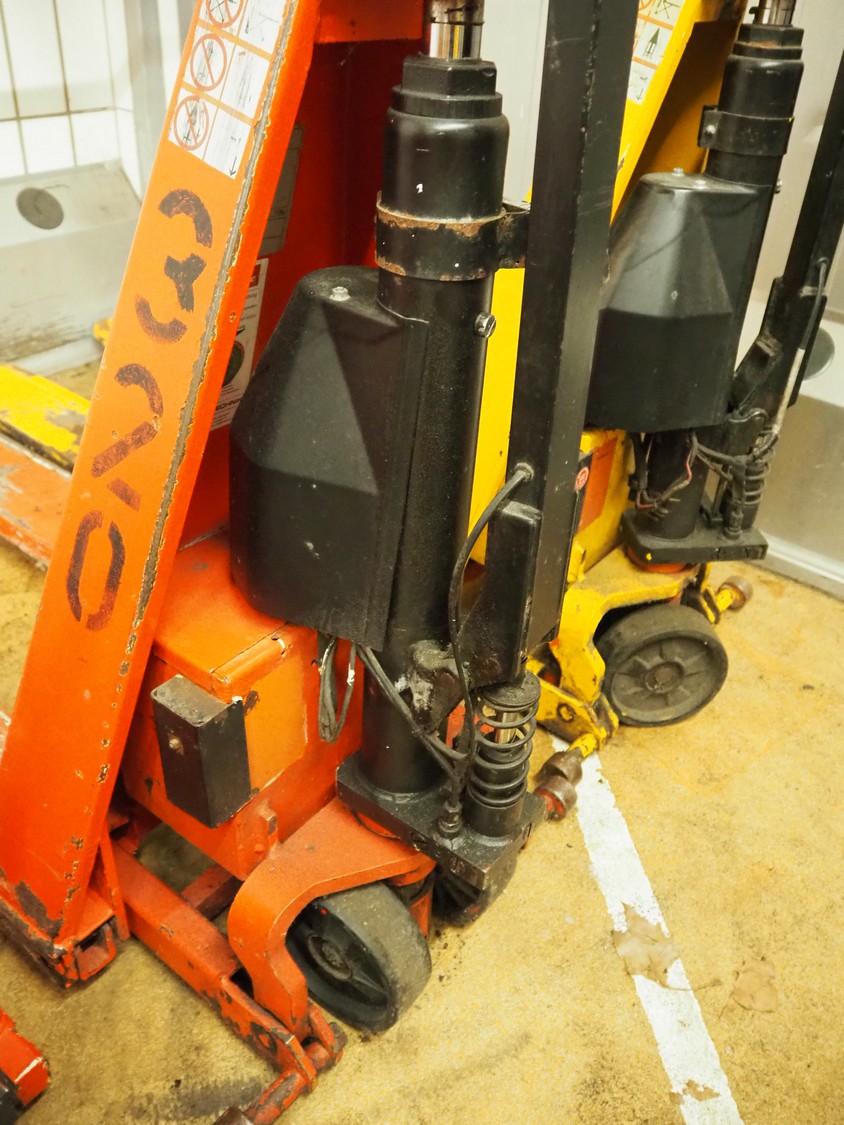 Toyota electric pallet lifter, model: HTH 10 E, serial number: 473920, year of construction: 2002-06, maximum capacity: 1000 kg, fork length: 1190 mm, fork width: 560 mm, weight: 135 kg, total dimensions: 1700 mm x 560 mm x 1270 mm.