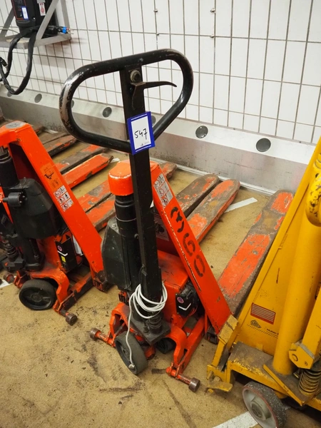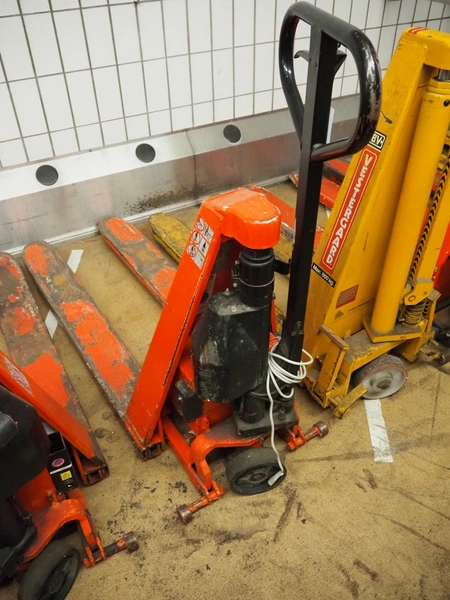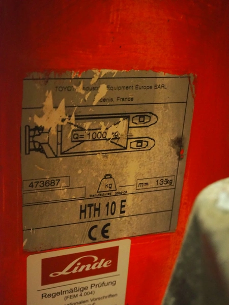 Toyota electric pallet lifter, model: HTH 10 E, serial number: 473687, year of construction: 2002-05, maximum capacity: 1000 kg, fork length: 1190 mm, fork width: 560 mm, weight: 135 kg, total dimensions: 1700 mm x 560 mm x 1270 mm.