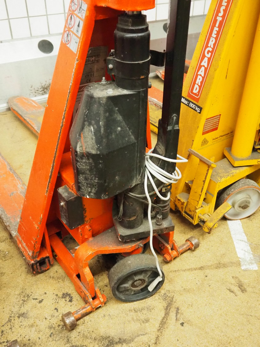 Toyota electric pallet lifter, model: HTH 10 E, serial number: 473687, year of construction: 2002-05, maximum capacity: 1000 kg, fork length: 1190 mm, fork width: 560 mm, weight: 135 kg, total dimensions: 1700 mm x 560 mm x 1270 mm.