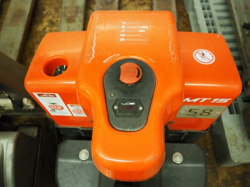 Linde Material Handling electric pallet lifter, type: MT15, serial number: CT1183J06003, year of construction: 2018, capacity: 1500 kg, steel forks, fork length: 1150 mm, total dimensions: 1650 mm x 550 mm x 1250 mm.