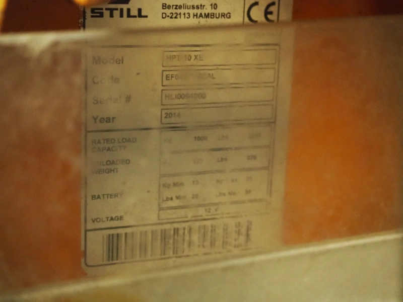 Still electric pallet lifter, model: HPT 10 XE, serial number: HLI0094000, year of construction: 2014, capacity: 1000 kg, steel forks, fork length: 1150 mm, total dimensions: 1750 mm x 550 mm x 1270 mm.