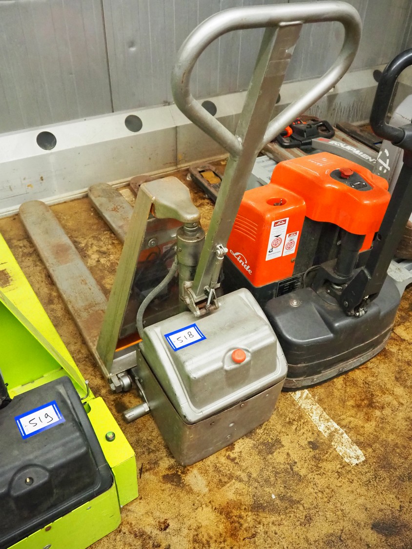 Still electric pallet lifter, model: HPT 10 XE, serial number: HLI0094000, year of construction: 2014, capacity: 1000 kg, steel forks, fork length: 1150 mm, total dimensions: 1750 mm x 550 mm x 1270 mm.