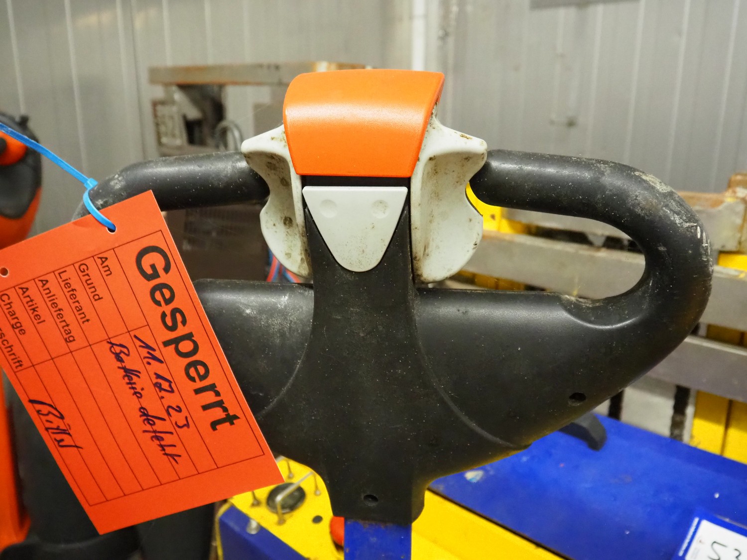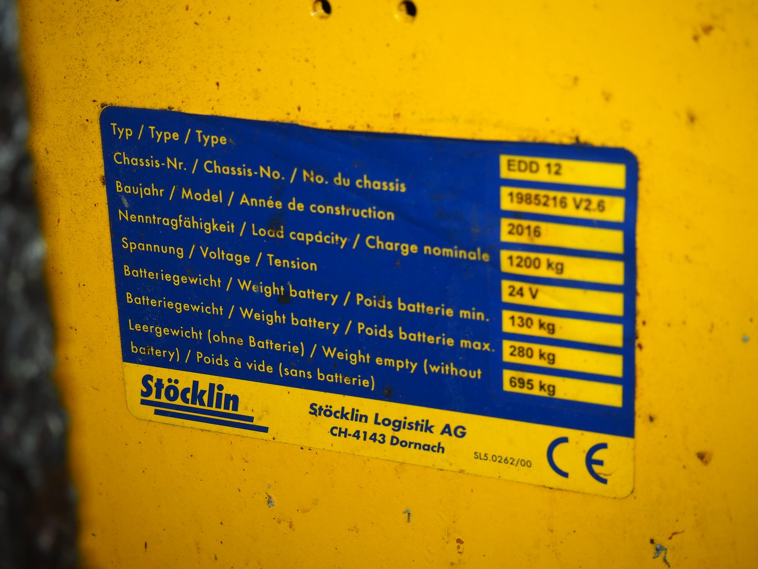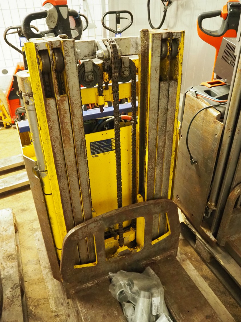 Stöcklin electric pallet lifter, type: EDD 12, chassis number: 1985216 V2.6, year of construction: 2016, load capacity: 1200 kg, 24 V, weight without battery: 695 kg, min/max battery weight: 130/280 kg, fork length: 1150 mm, total dimensions: 2000 mm x 700 mm x 1220 mm. Technical condition unknown.